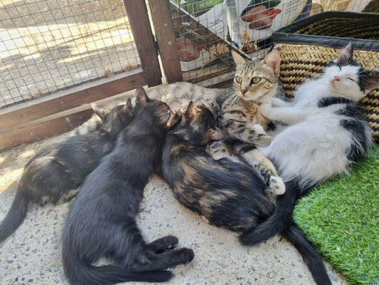 Et puis, un jour, des humains au grand cœur sont venus me chercher. Ils m’ont sortie de là, et j’ai passé une nuit rassurante chez le vétérinaire avant d’aller rejoindre l’enclos de Julie. C’est finalement au vétérinaire que j’ai donné naissance à mes 5 merveilles 💕 Un endroit sûr, où nous avons pu commencer notre histoire ensemble.