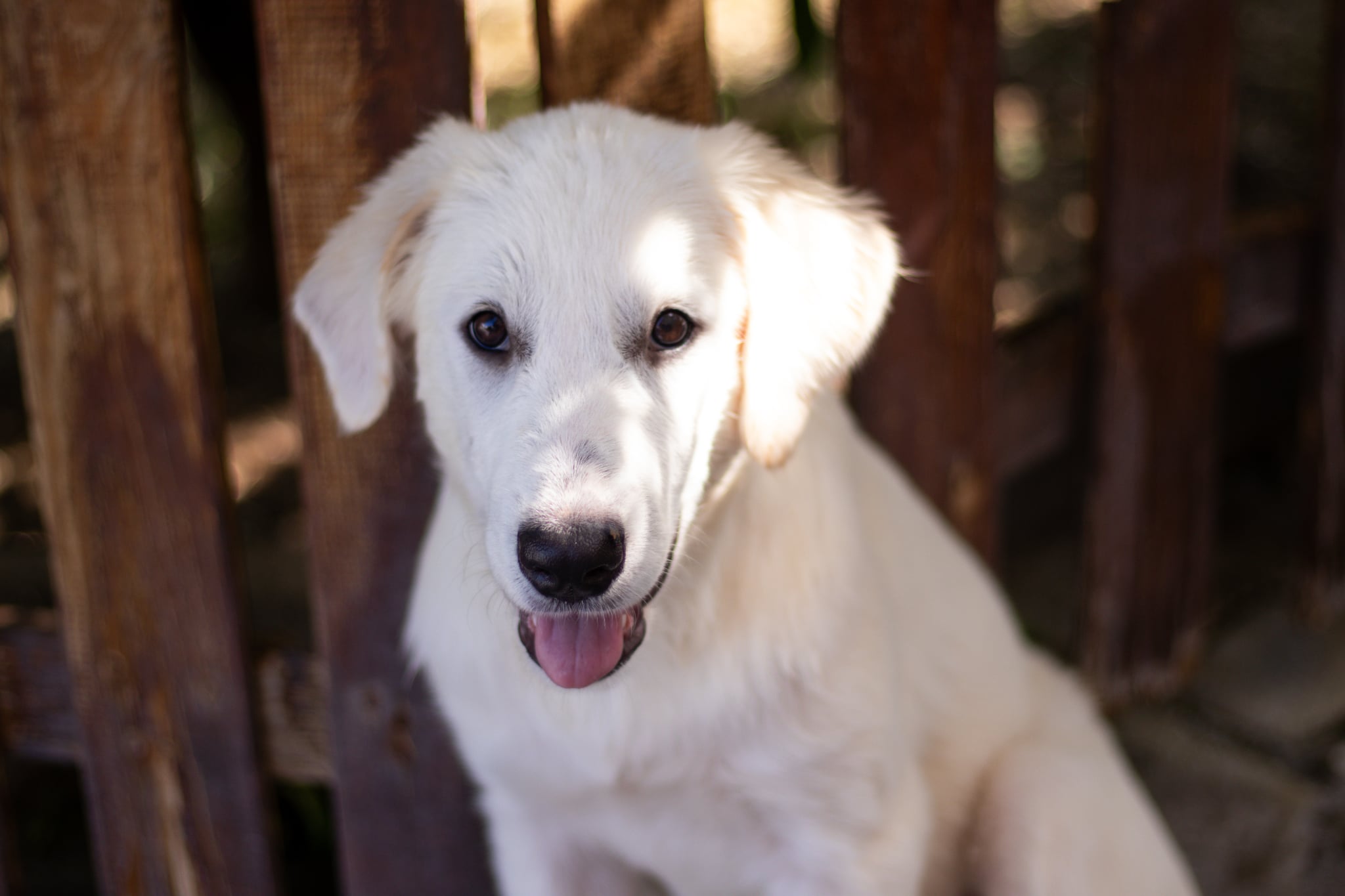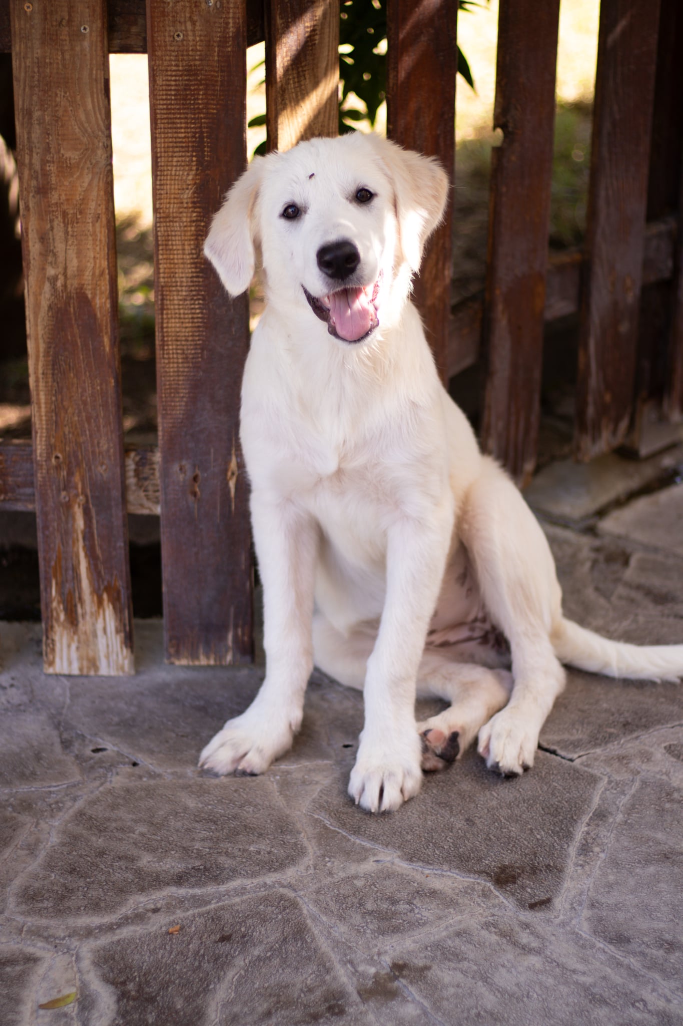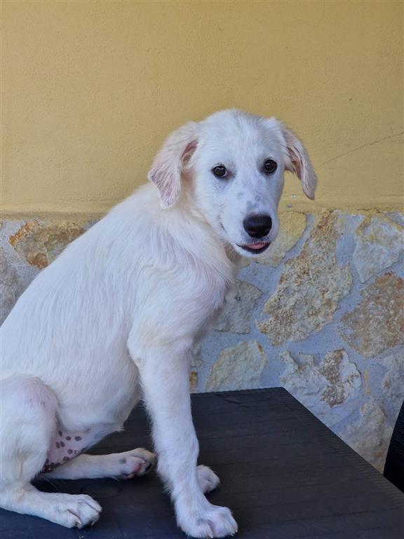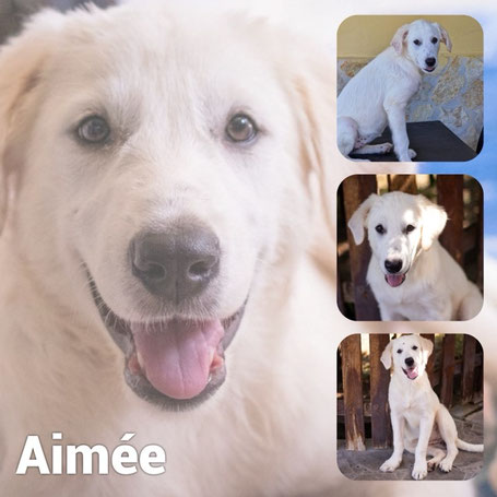 AIMEE est une chienne de type croisée Berger de Maremme, non lof, couleur blanche.