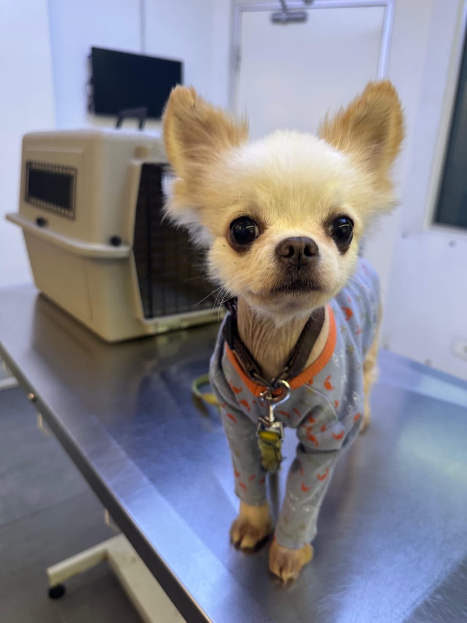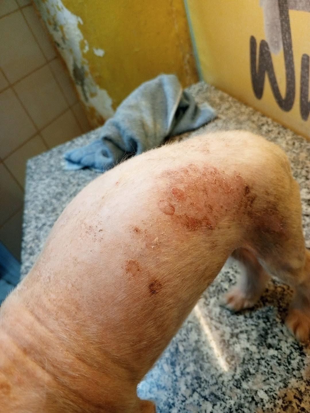 Il a été recueilli avec une peau très abîmée, sans doute en vue d’une allergie non soignée.