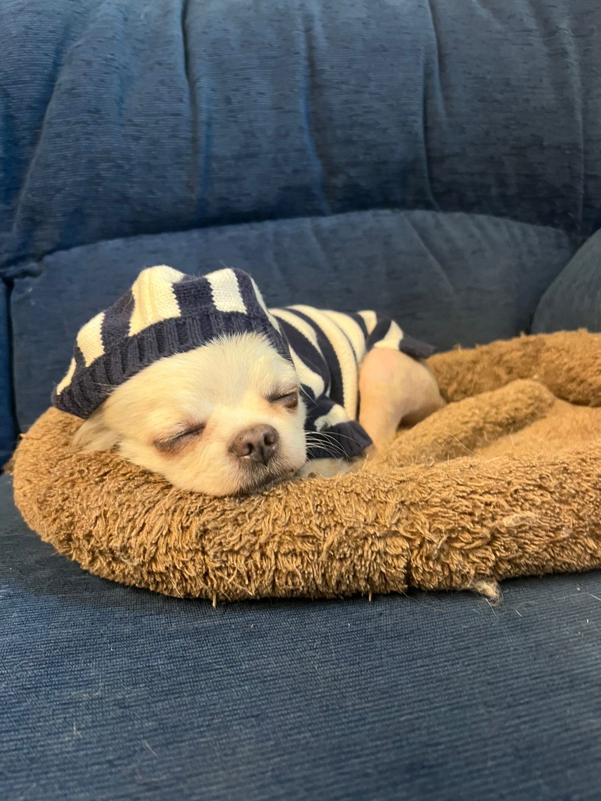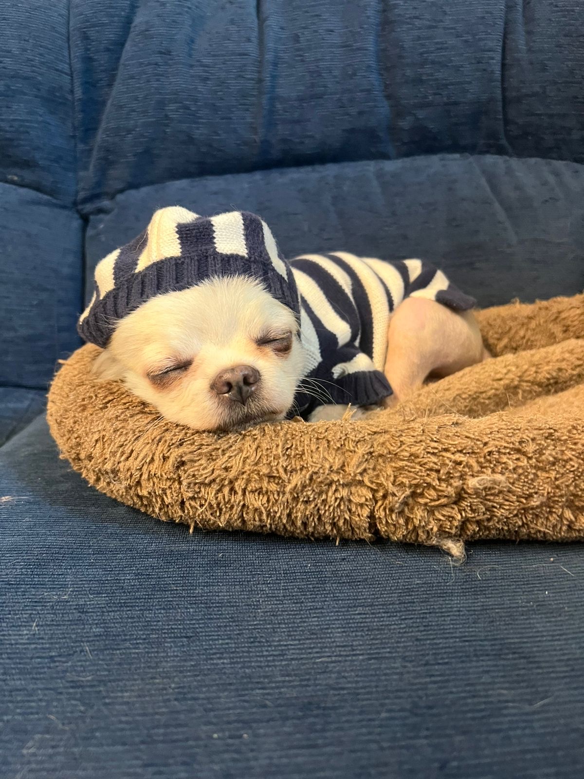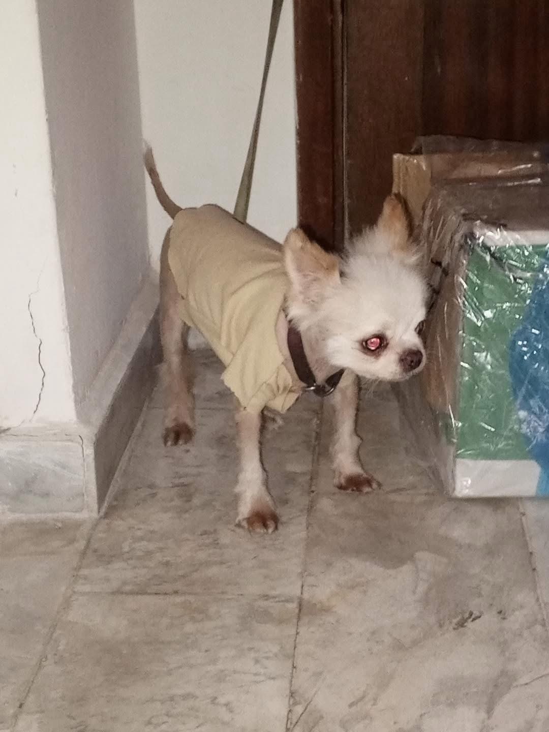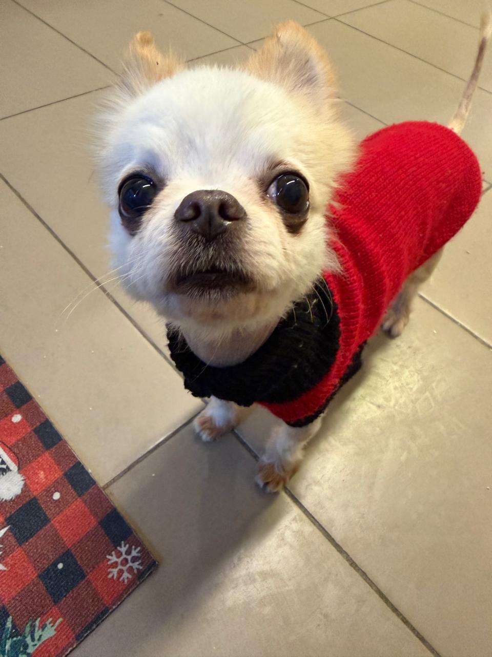 COBY est un chien de type Chihuahua, non lof, couleur blanc au poil long.