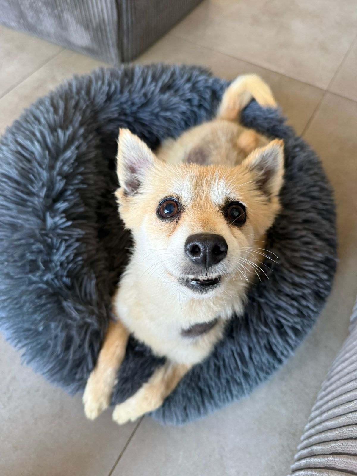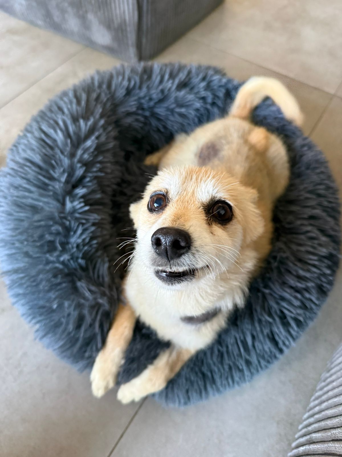 ELLA est une chienne de type Spitz, non lof, couleur fauve et blanche.