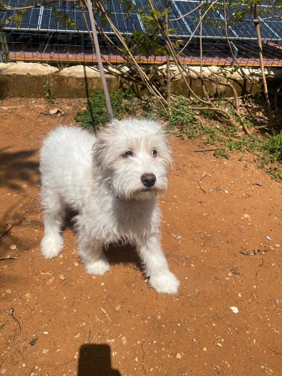 JOKER est un chien de type croisé terrier, non lof, couleur blanc.