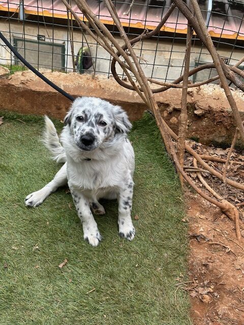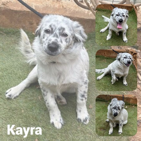 KAYRA est une chienne croisée Spitz, non lof, couleur blanche mouchetée de noir.