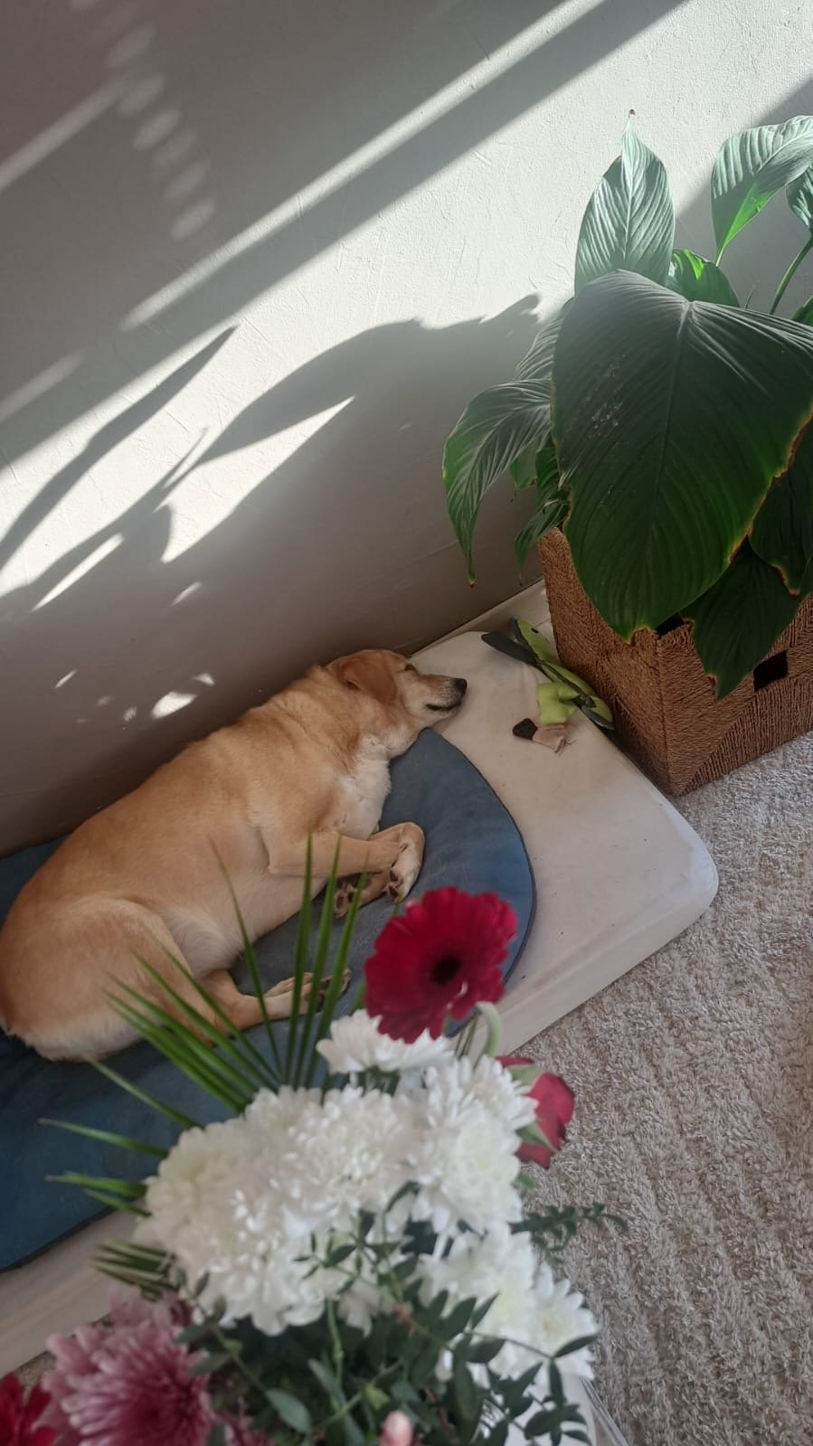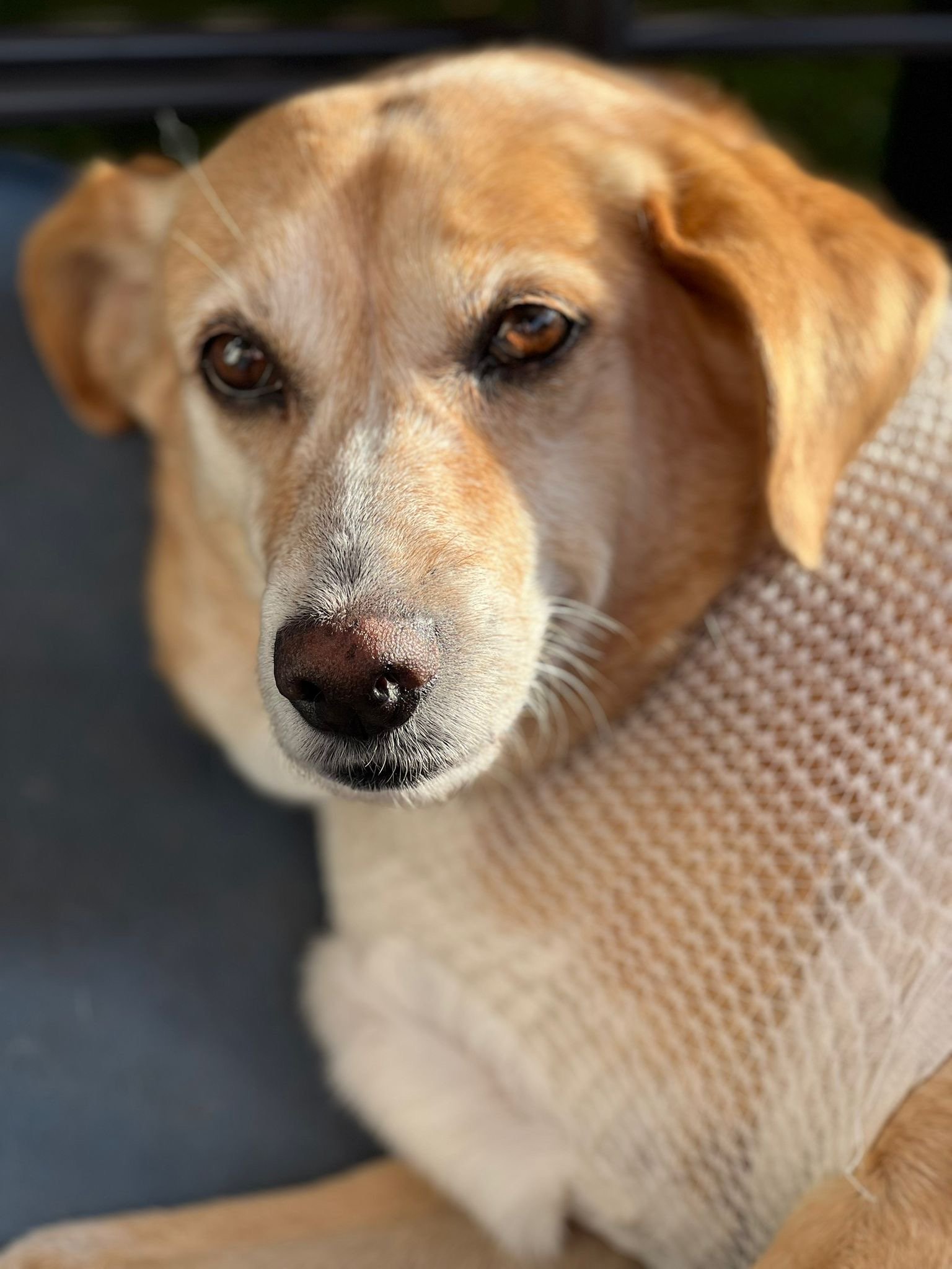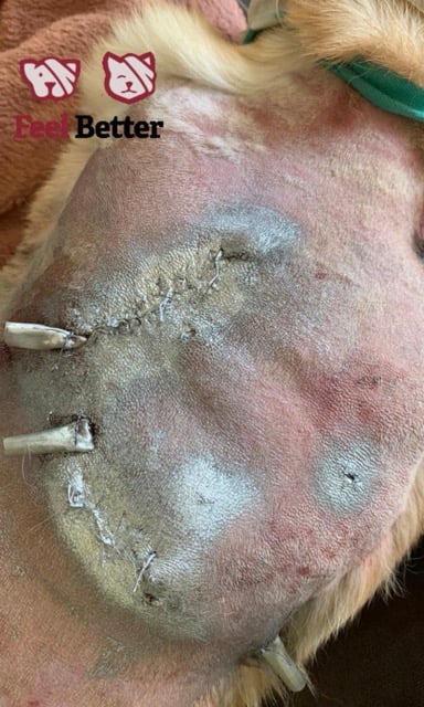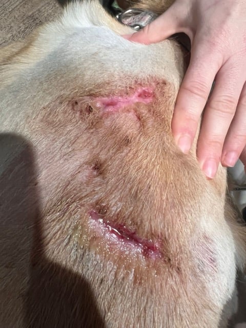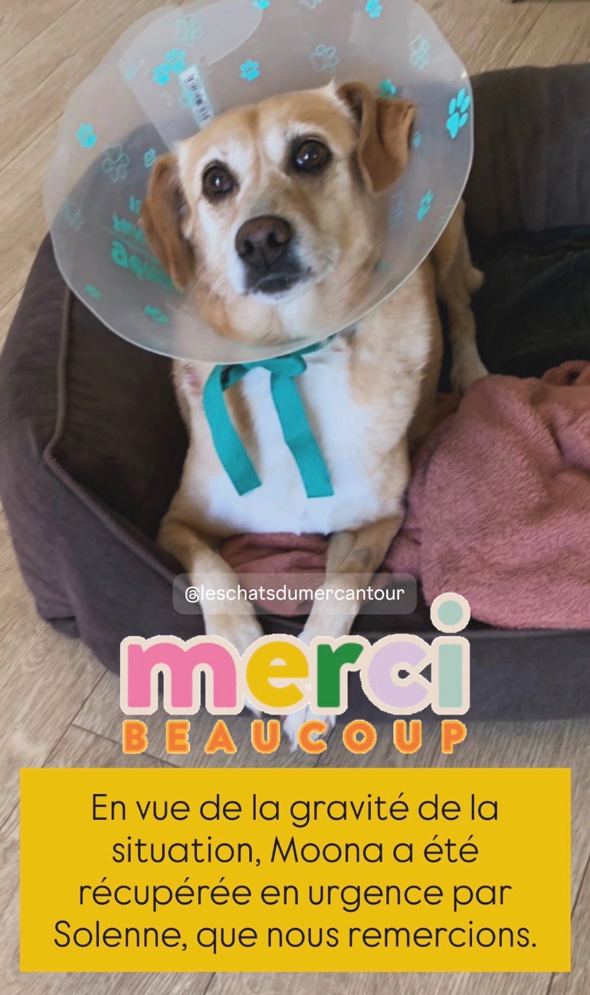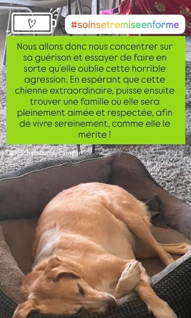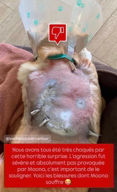 Elle a été soignée pour des morsures après avoir été méchamment attaquée par un chien (Moona n’y est absolument pour rien).