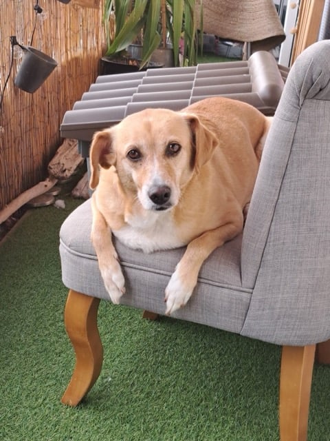 MOONA est une chienne de type croisée Labrador et Épagneul, non lof, couleur beige et blanche.