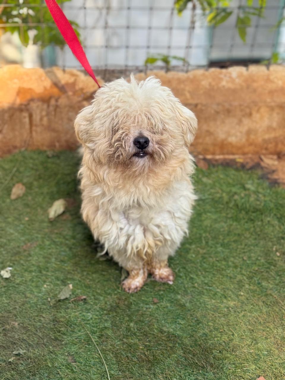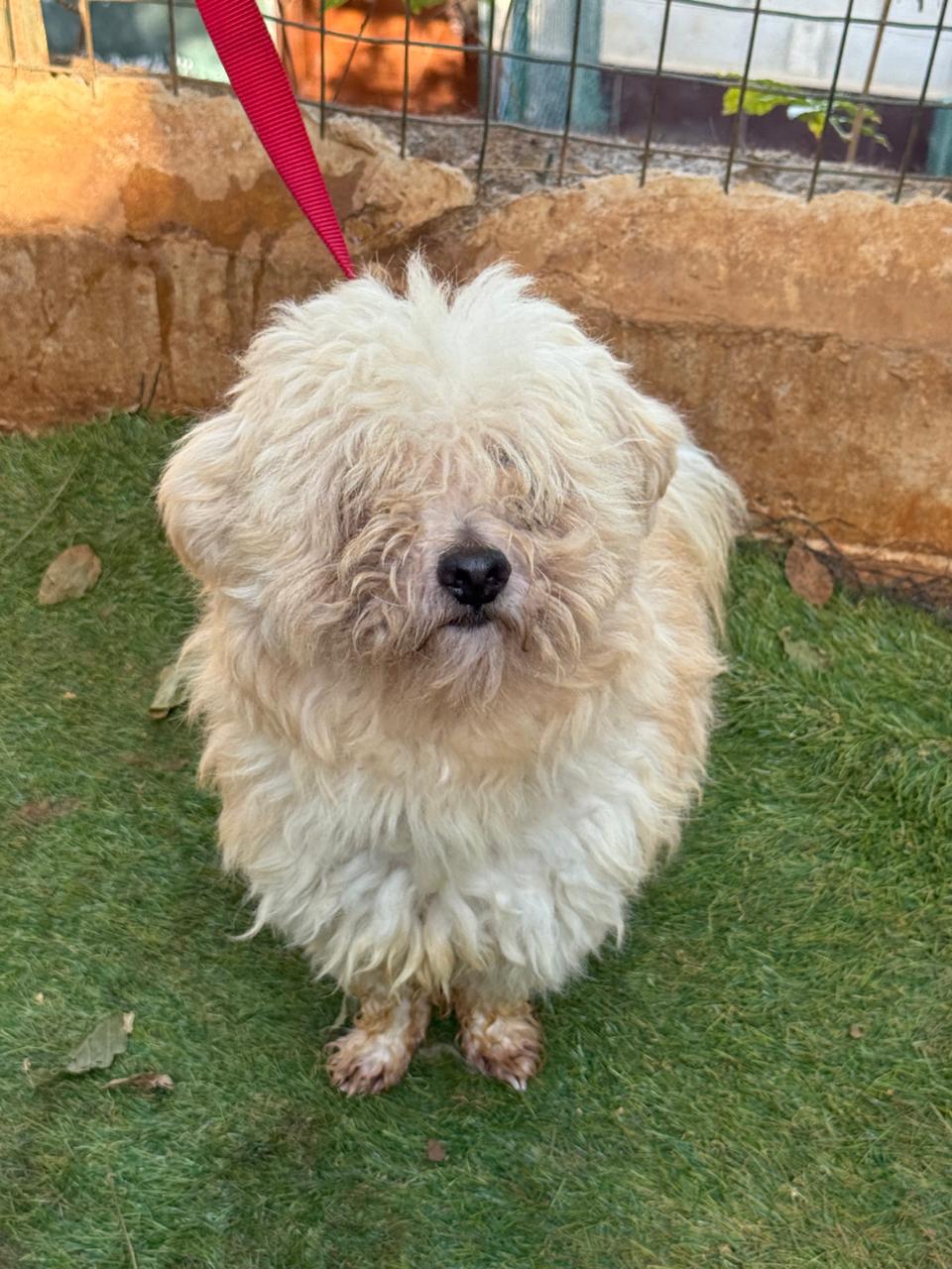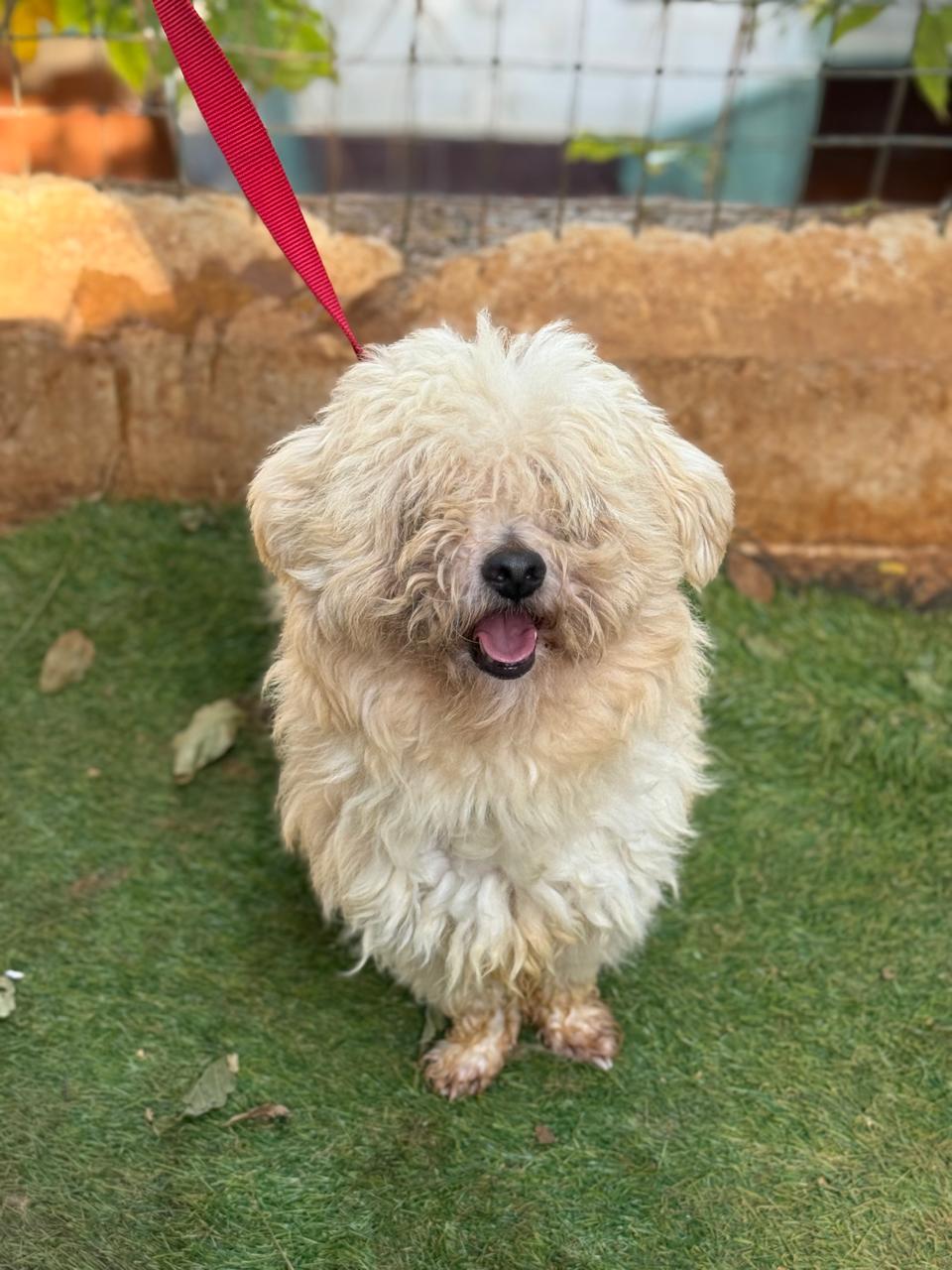 PIM est un chien de type croisé Bichon, non lof, couleur blanc beige.