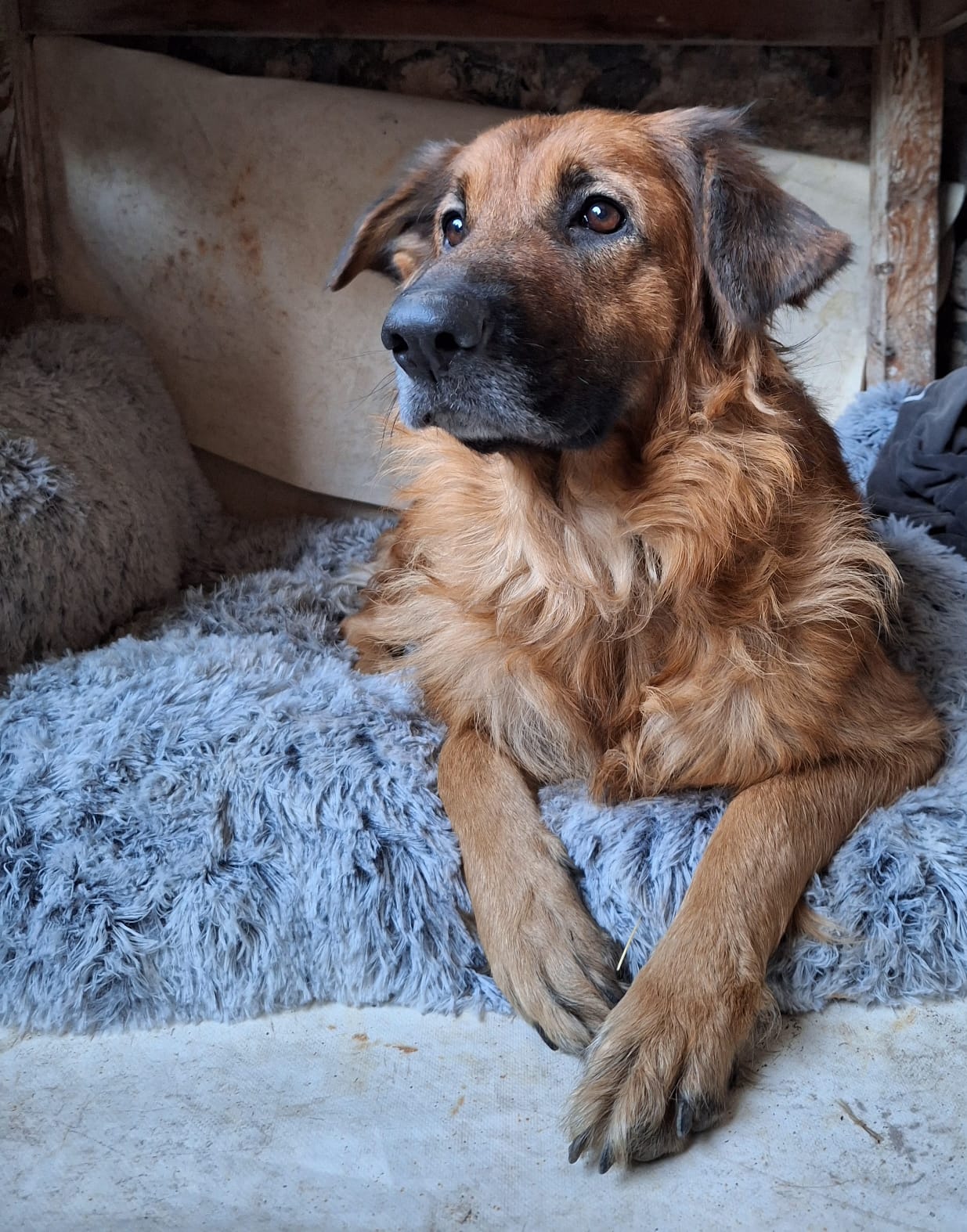 RAMSES est une chienne de type croisée Berger, non lof, couleur fauve charbonnée, au poil mi-long.