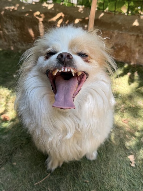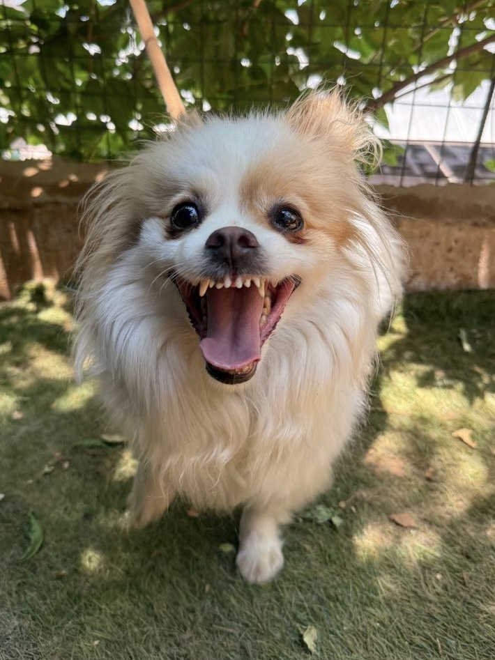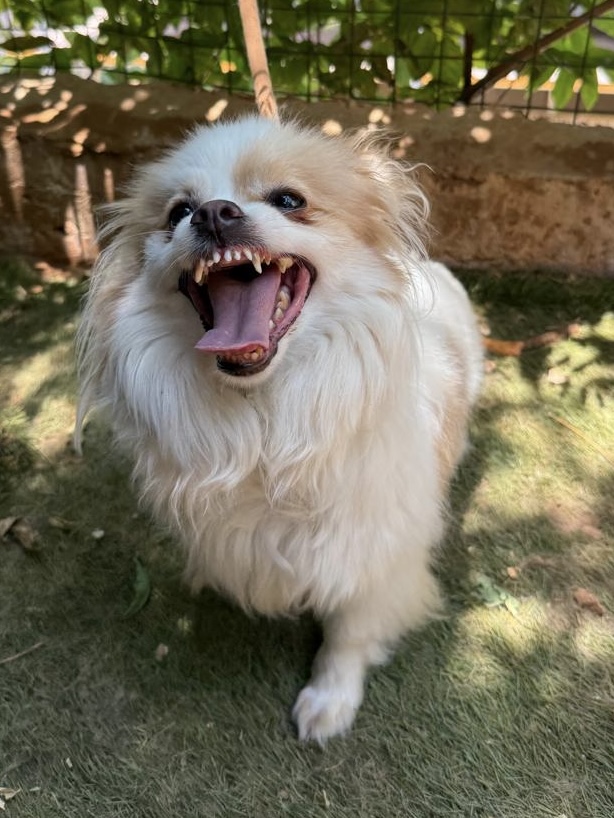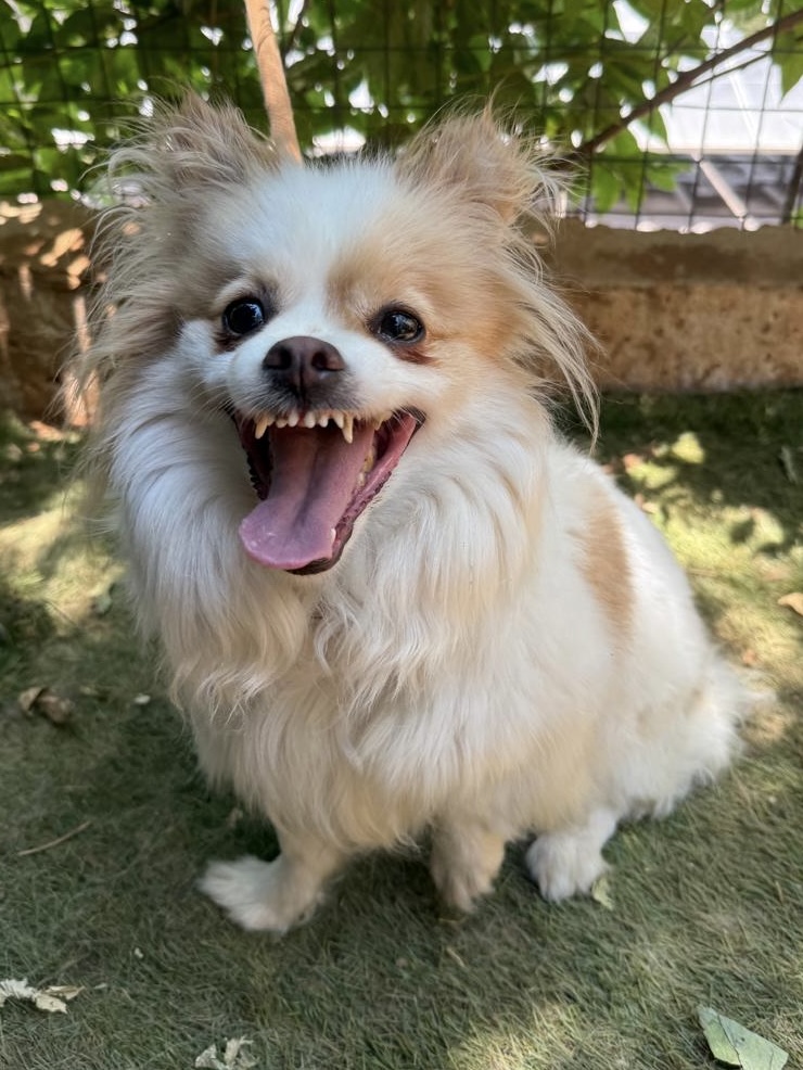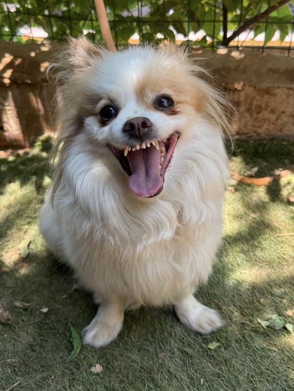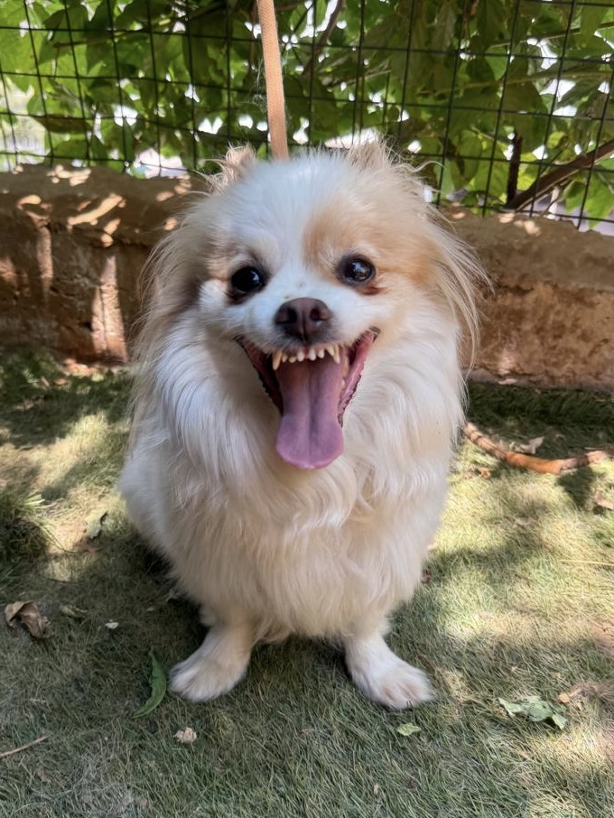 YAMI est une chienne de type croisée Spitz, non lof, couleur blanche et beige.