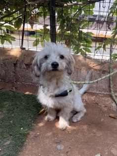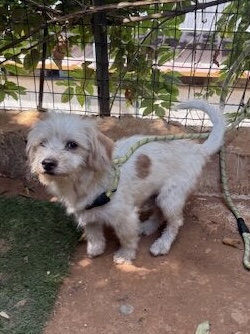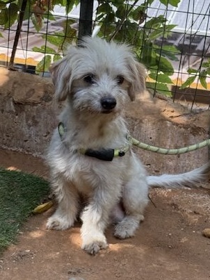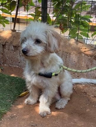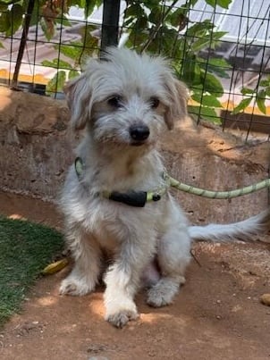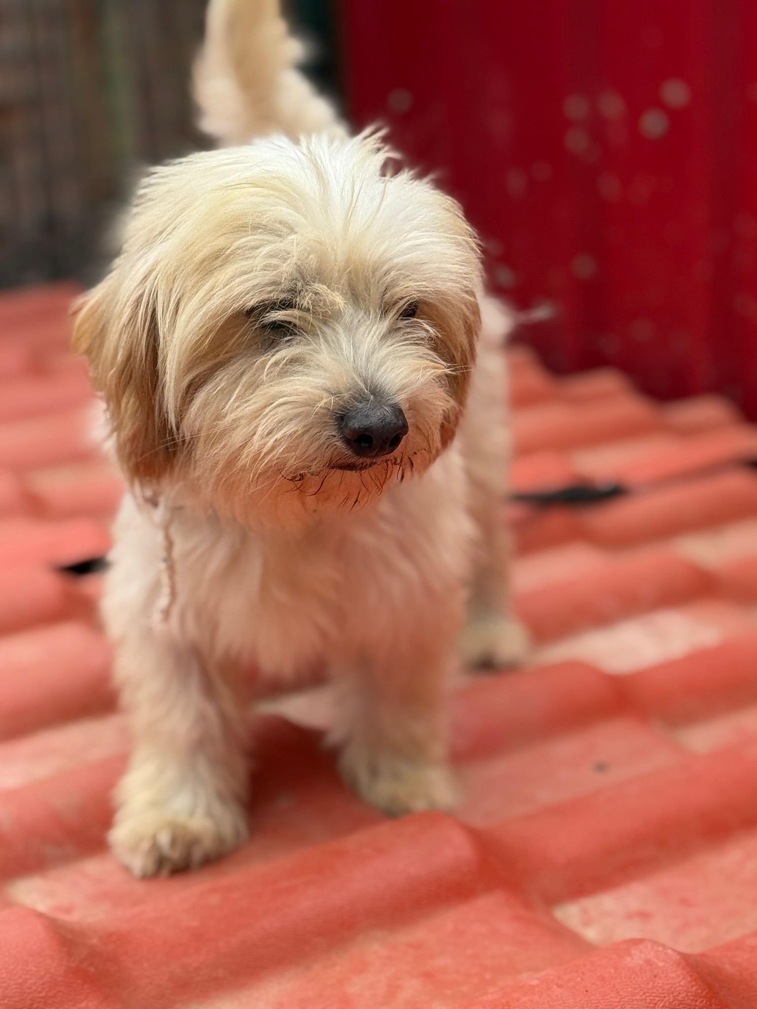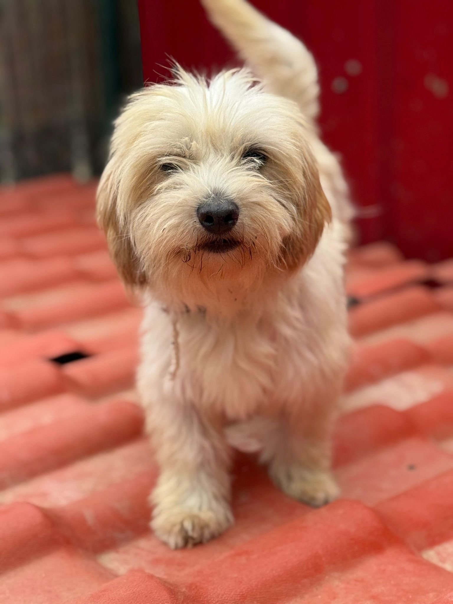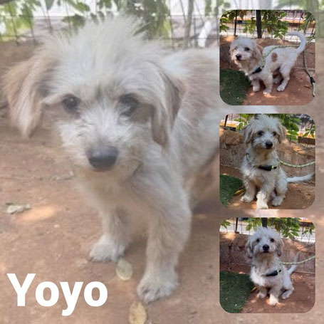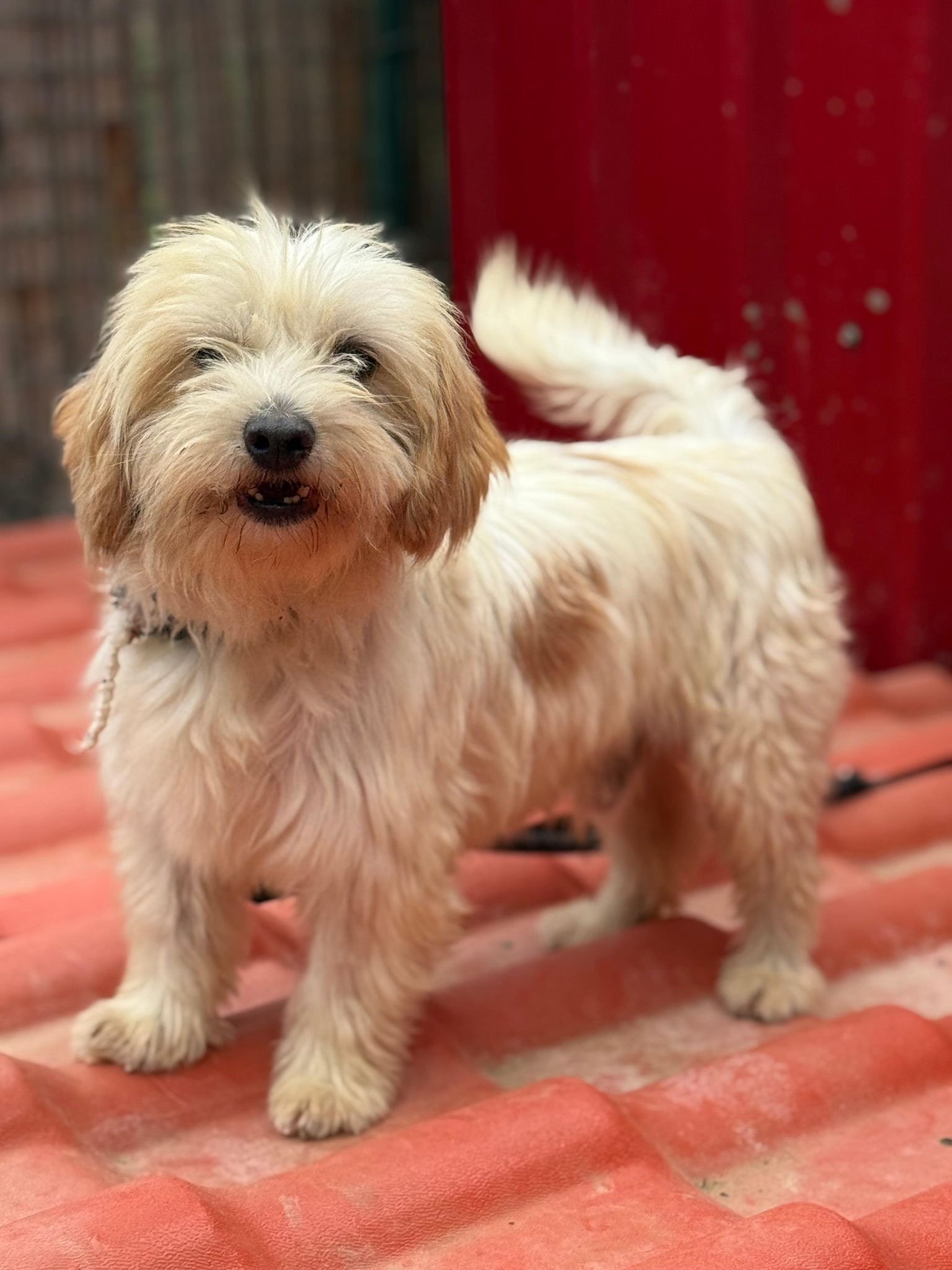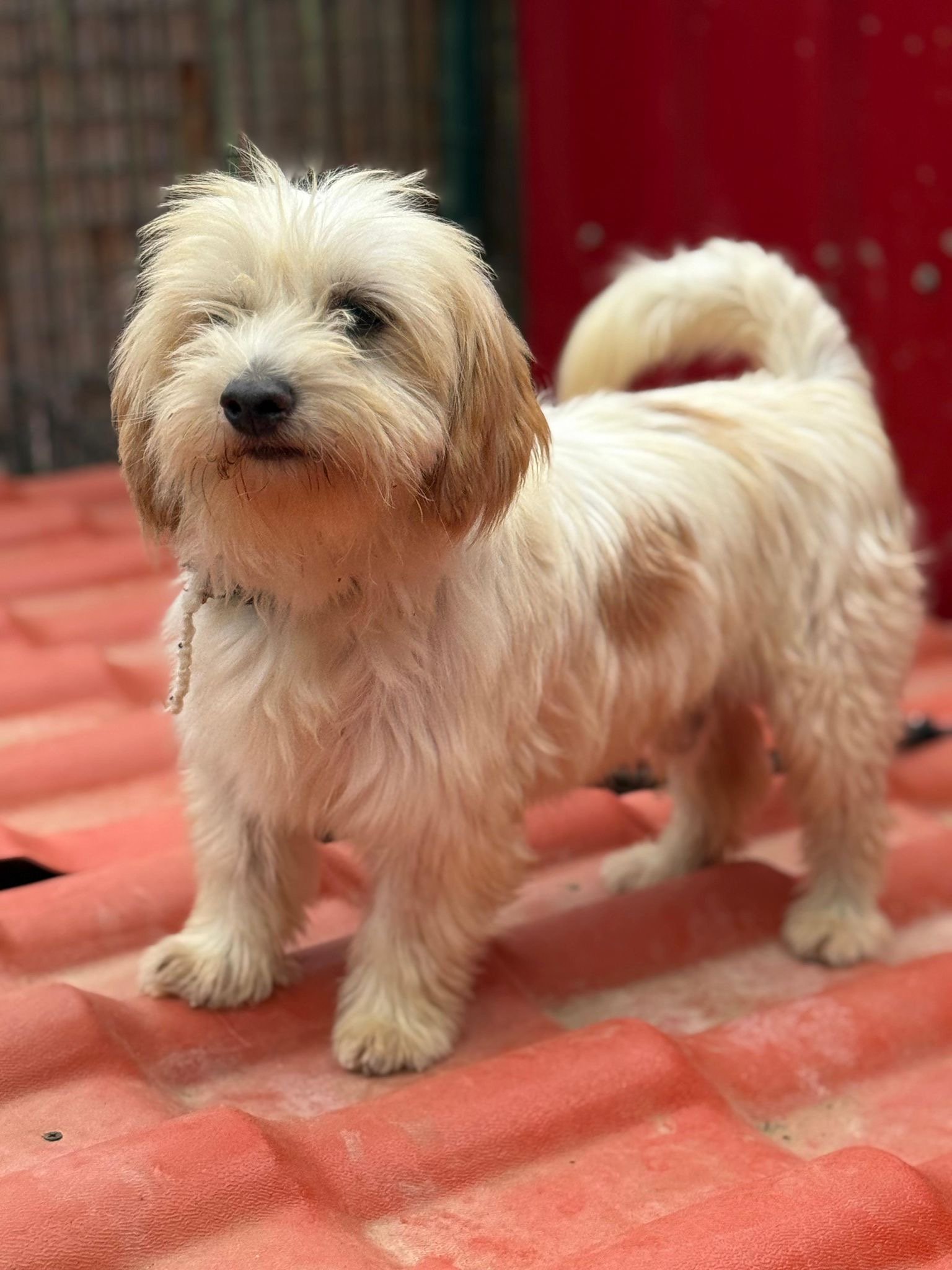 YOYO est un chien de type croisé Bichon, non lof, couleur blanc et beige.