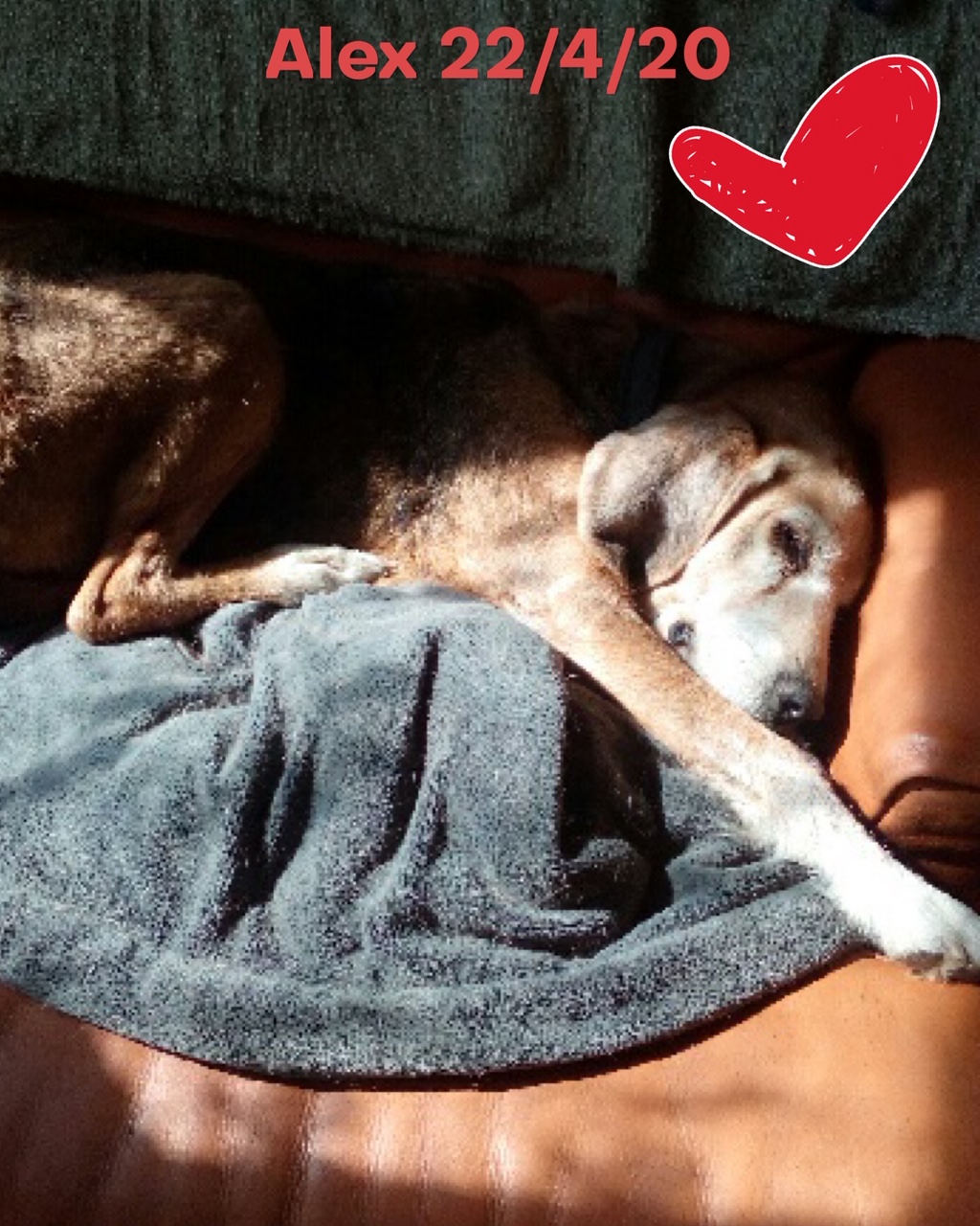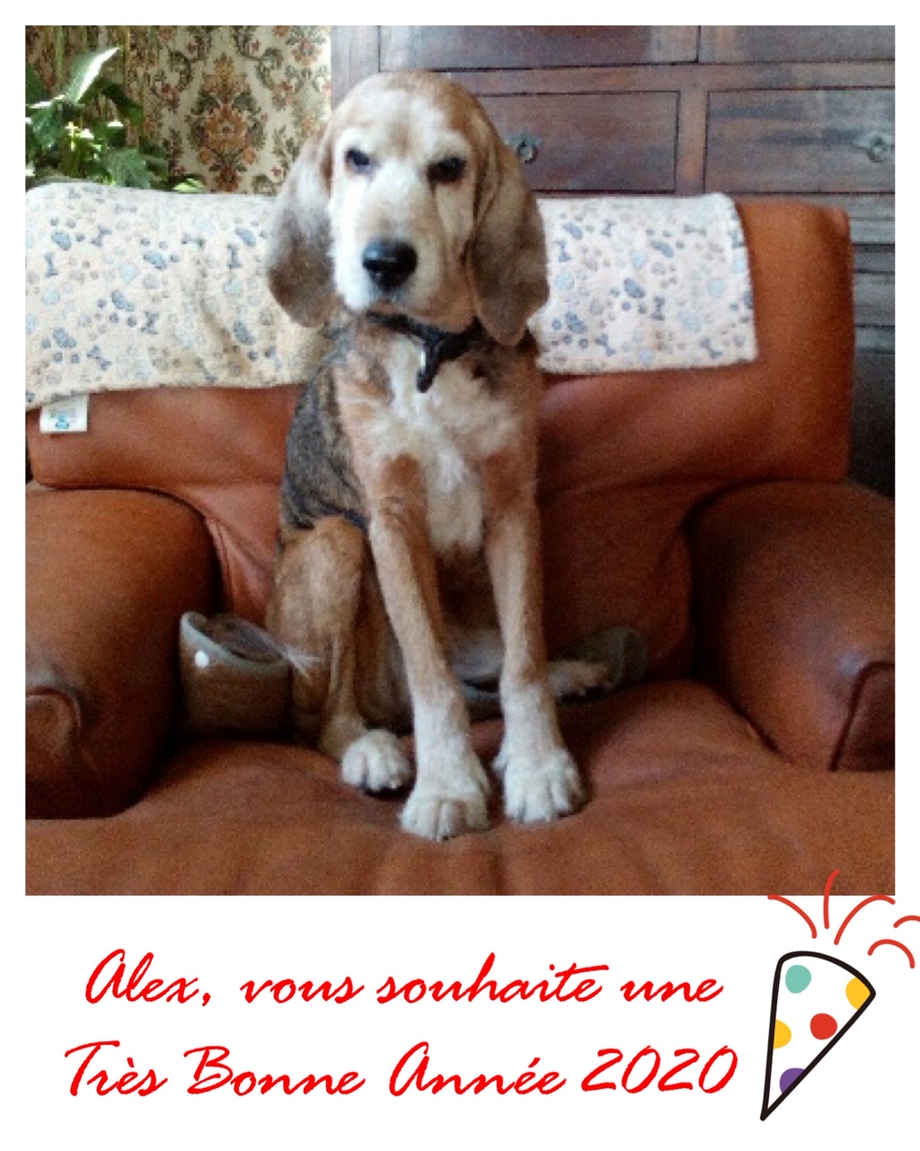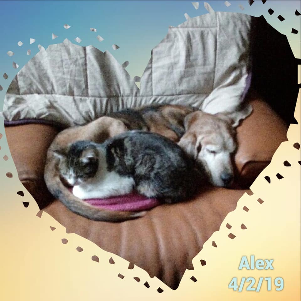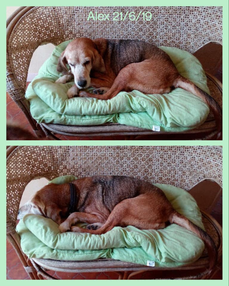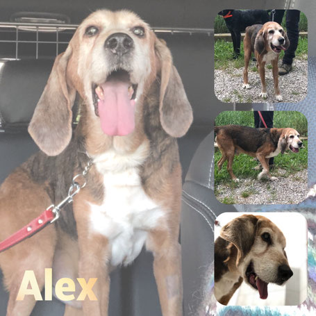 Alex est un chien de type croisé Beagle, non lof, tricolore. Mâle castré, estimé à 14 ans environ (mais on pense qu’il est plus jeune), identifié 250269811531799. Il n’est pas vacciné, ne l’a jamais été d’ailleurs. Il pèse 19kg et a été traité contre les parasites internes et externes.