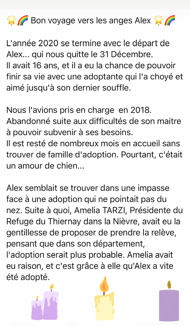 Alex vivait à la montagne avec son maitre et d’autres animaux. Une vie «nature » et pépère. Malheureusement, suite à des problèmes personnels, ce papy a dû être pris en charge par notre association.