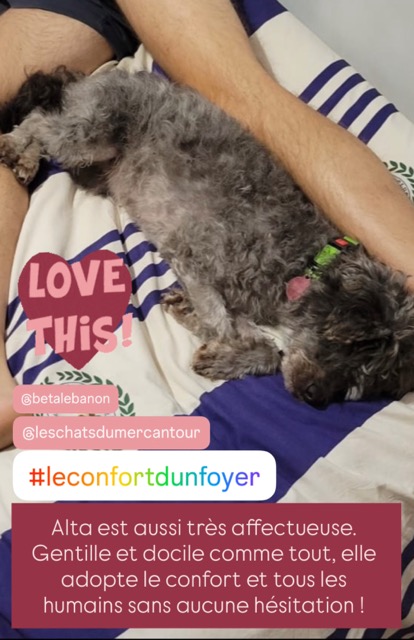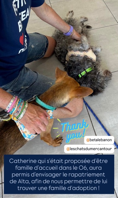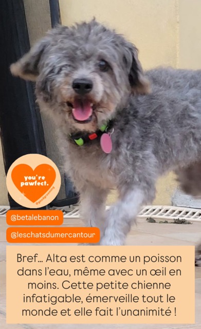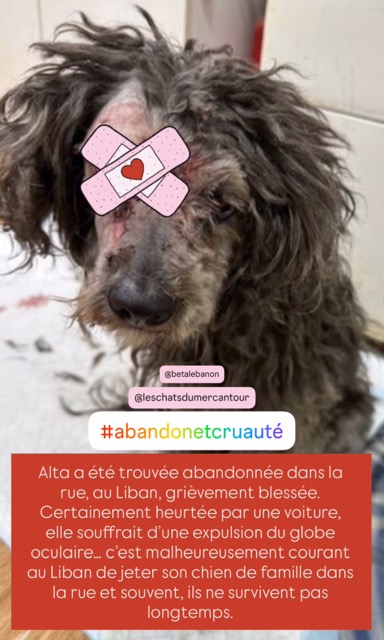 ALTA a été trouvée abandonnée dans la rue, au Liban. Son histoire est trop triste : récupérée inerte, entre la vie et la mort, elle souffrait d’une grosse fracture au bassin et d’un œil crevé…