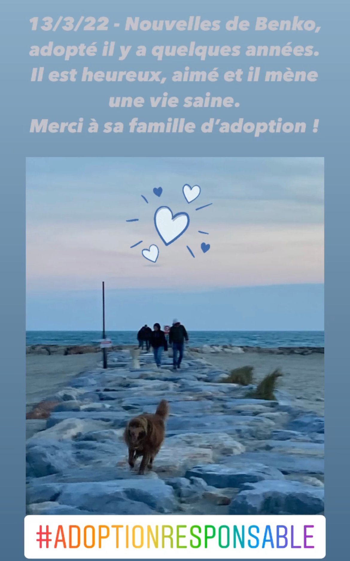 NB : merci de mûrement réfléchir à l’engagement moral et financier qu’une adoption représente (santé, factures vétérinaires, entretien, alimentation environ 700 euros par an, absences, vacances ou autres, accessoires quotidiens, éducation, etc). Merci aussi de bien vous renseigner au préalable sur les caractéristiques de la race concernée. Un chien vit en moyenne 15 ans.