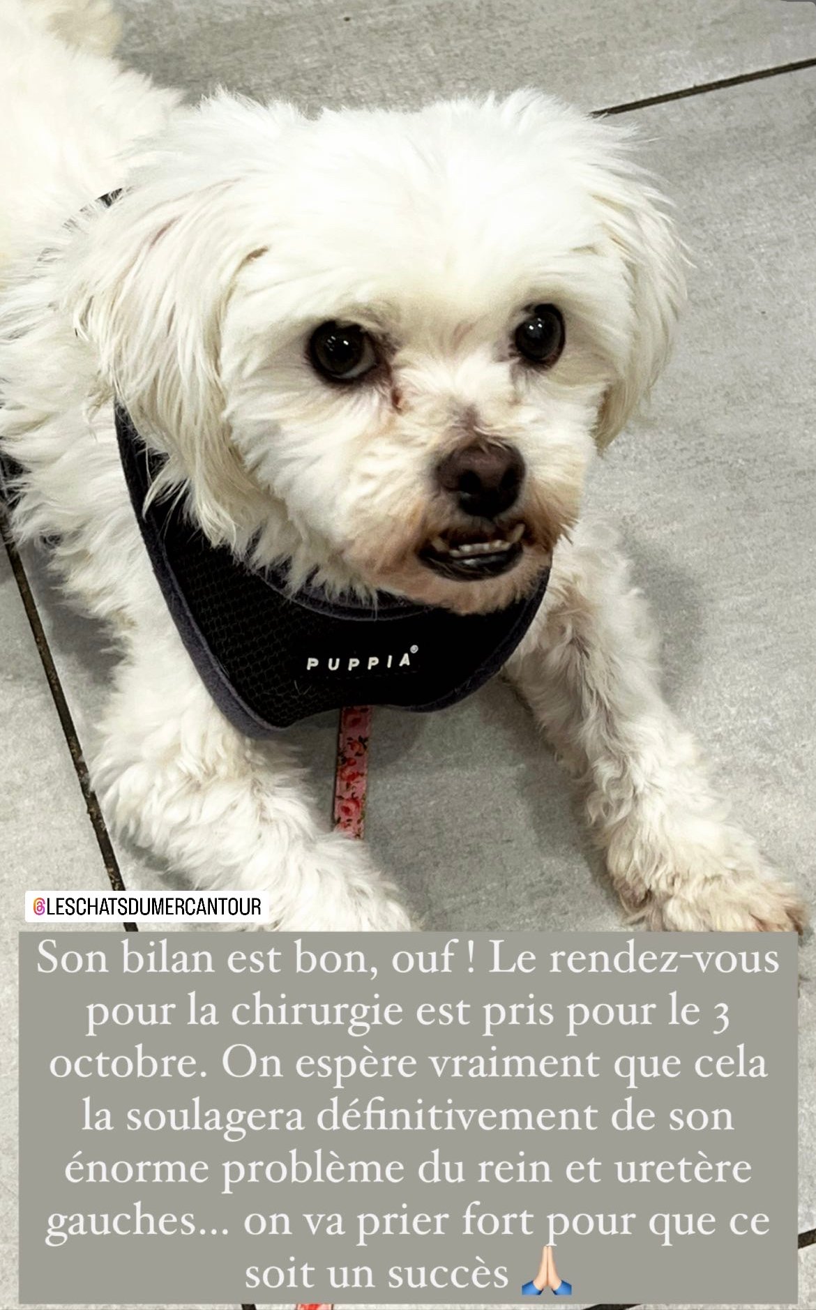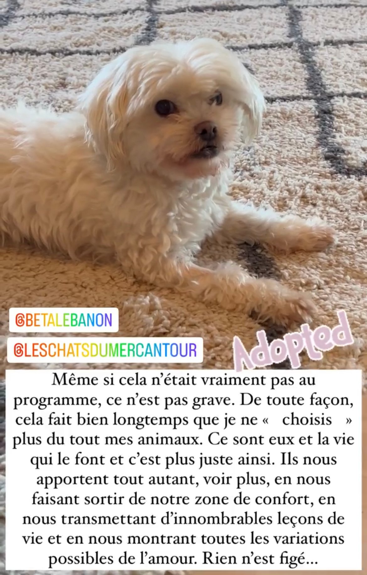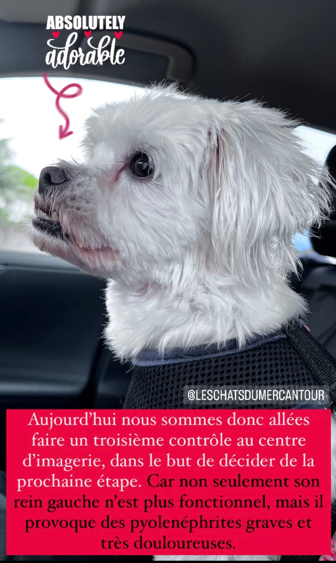 * Famille souhaitée : des adoptants très calmes, doux et soigneux, disponibles en temps et en attentions, où l’amour et l’affection règnent. Il sera important de lui offrir des petites activités et sorties quotidiennes.