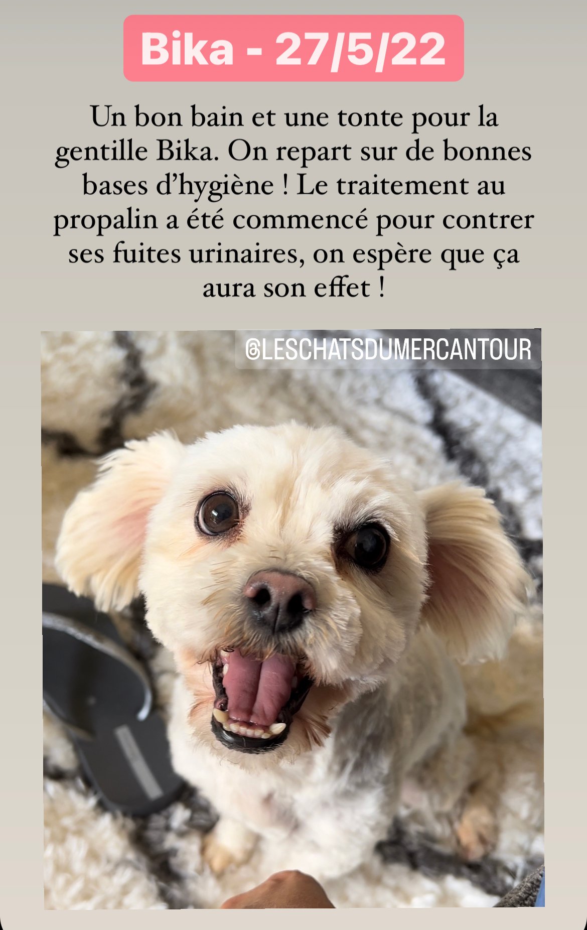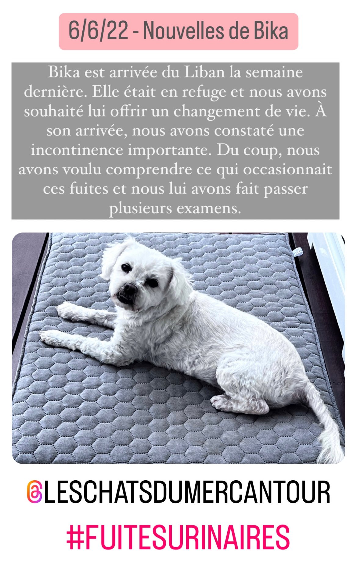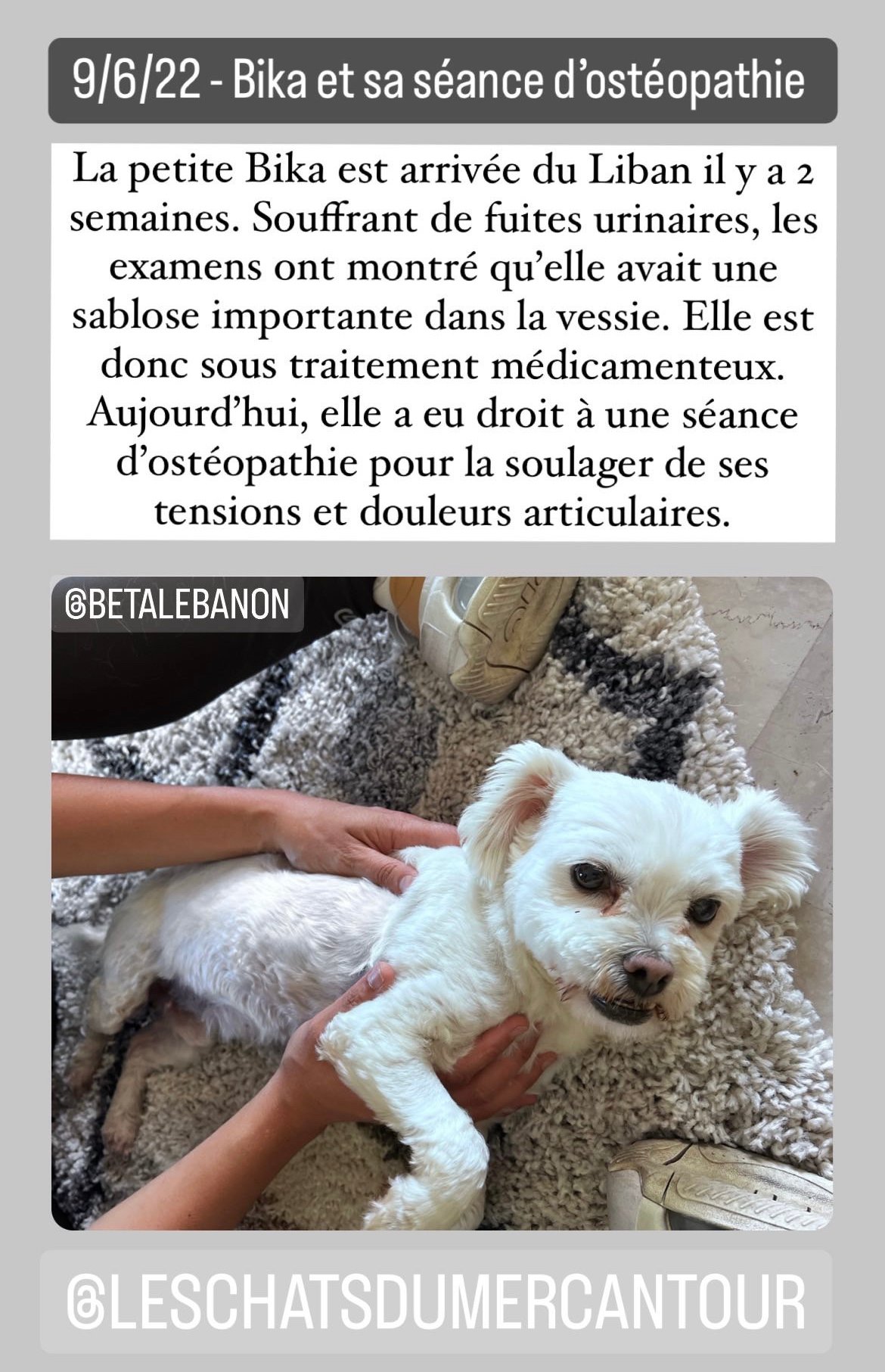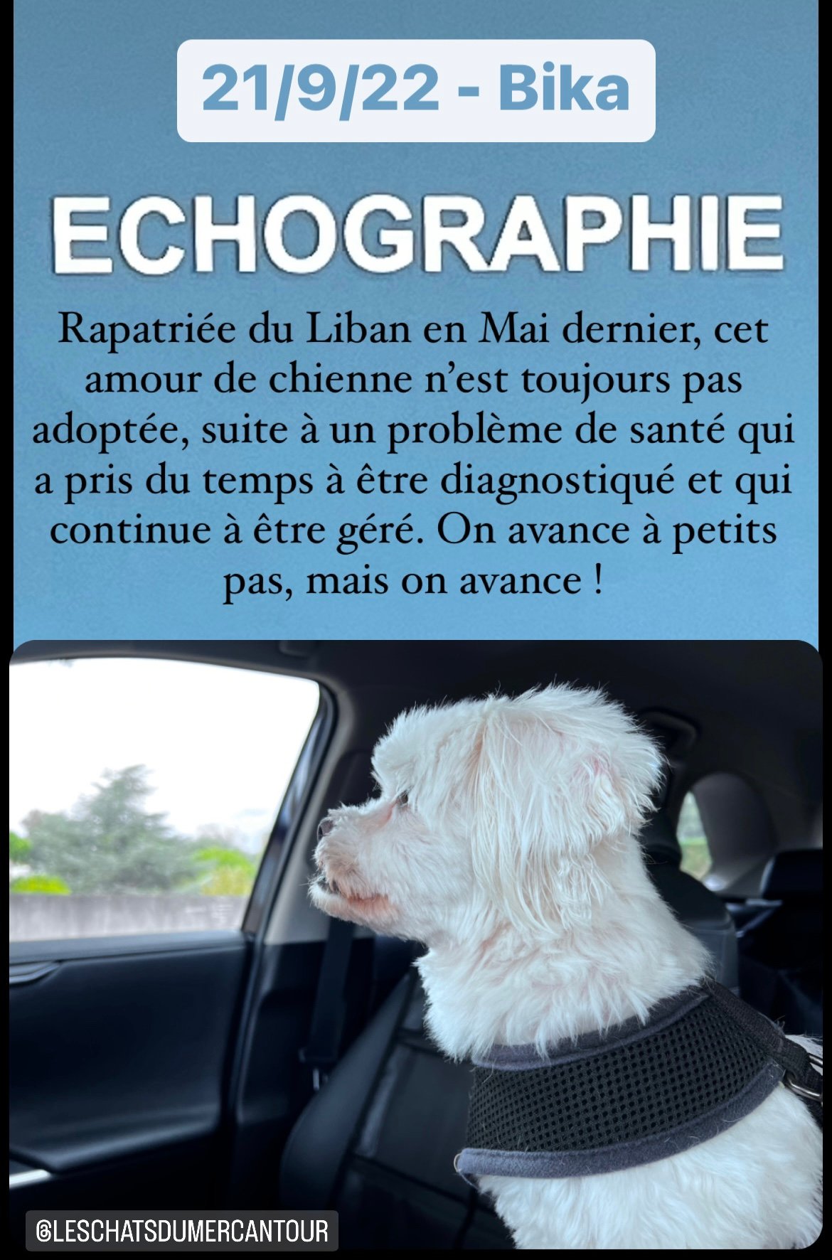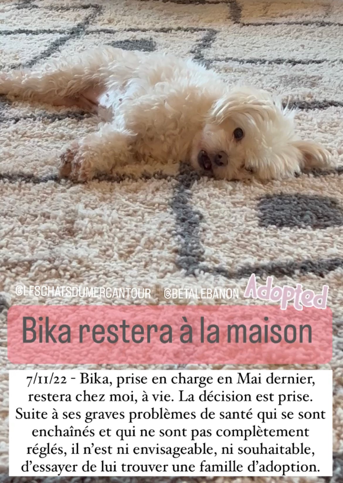 Originaire du Liban, BIKA a été utilisée pour de la reproduction par un particulier pour faire de la reproduction. Le jour où cela n’a plus fonctionné, elle a été déposée chez un vétérinaire pour y être euthanasiée. Heureusement pour elle, le vétérinaire a refusé et l’a confiée à l’association BETA Lebanon. Placée dans le refuge, elle a été préparée au niveau sanitaire pour quitter le pays (les adoptions locales sont inexistantes).