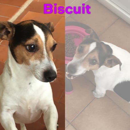 BISCUIT est un chien de type Jack Russell, non lof, tricolore. Il est castré, vacciné et identifié 250268712568082. Il a aussi été vermifugé et a eu son anti-puces. Il a 8 ans environ. Il a un certificat de bonne santé établi par le vétérinaire.