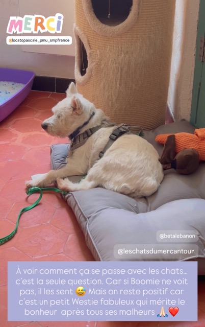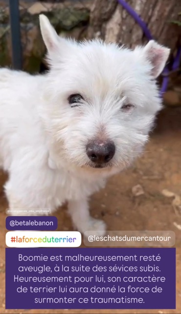 BOOMIE a été trouvé abandonné, au Liban, alors avec de graves blessures : queue coupée, un œil manquant et un œil aveugle.
