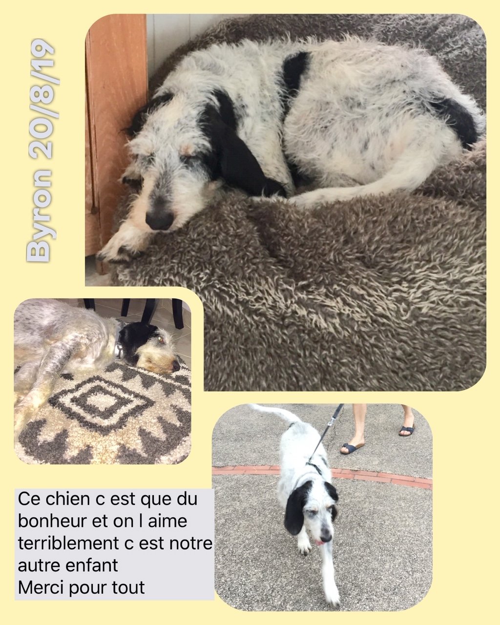 BYRON est issu d’une portée non voulue. Les propriétaires de la mère, refusant de faire stériliser leur chienne, avaient décidé de noyer les petits. Mais une voisine connaissant la situation, s’est proposée de récupérer la portée de 3 chiots et de les biberonner. Sevrés, ils sont prêts à être adoptés.