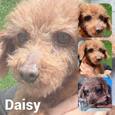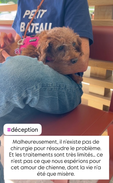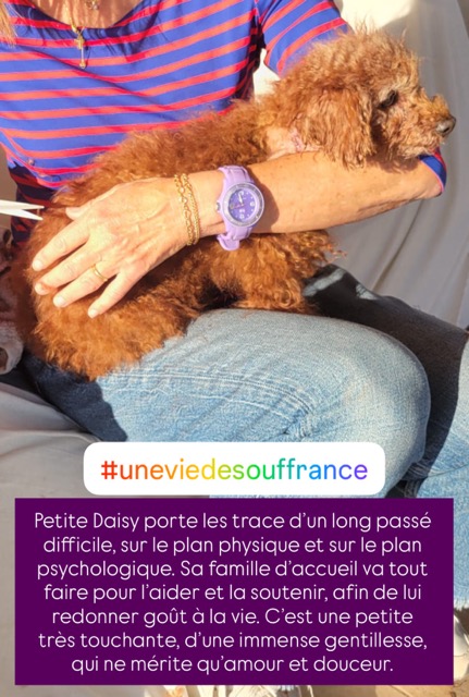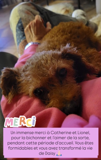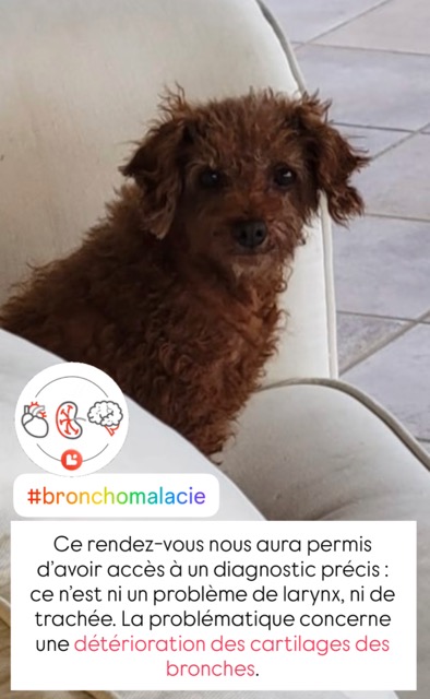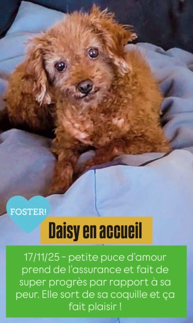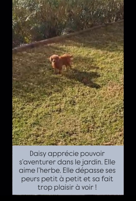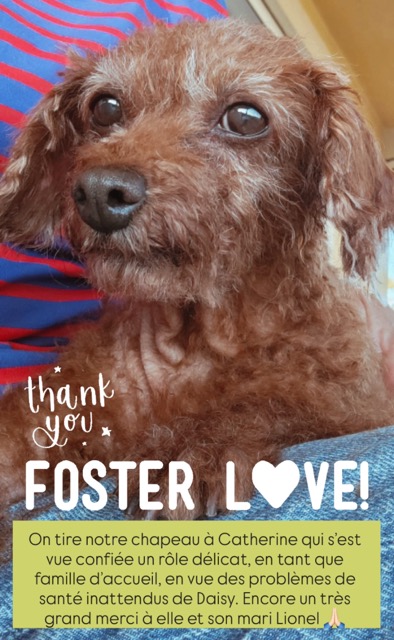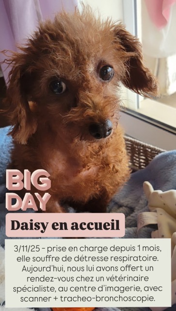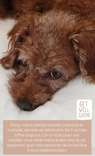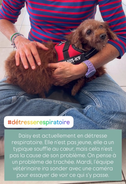 Daisy souffre malheureusement d’une pathologie évolutive, qui touche ses bronches et qui provoque une détresse respiratoire aléatoire. Elle a aussi un petit souffle au cœur (pas de traitement) et de l’hypothyroïdie (traitement).