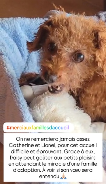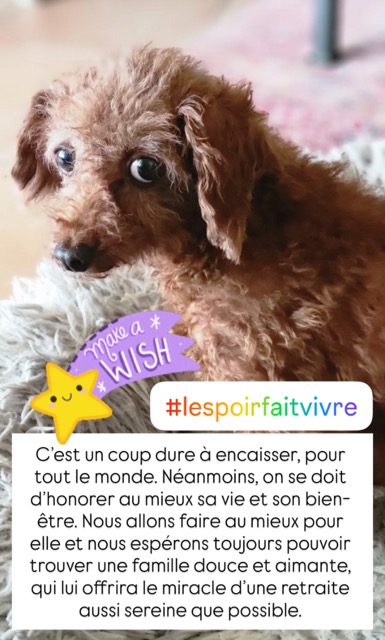 C’est un petit ange sur terre qui mérite de pouvoir finir sa vie tranquillement, dans le confort et dans les bras de quelqu’un qui lui assurera protection et amour.