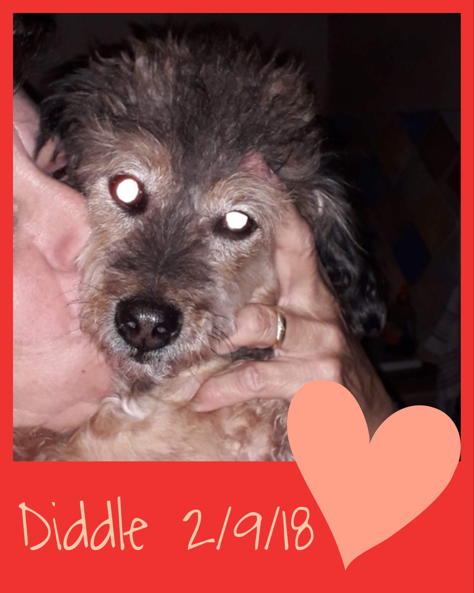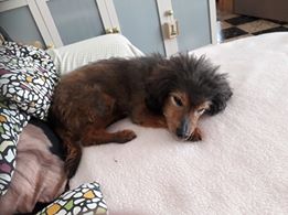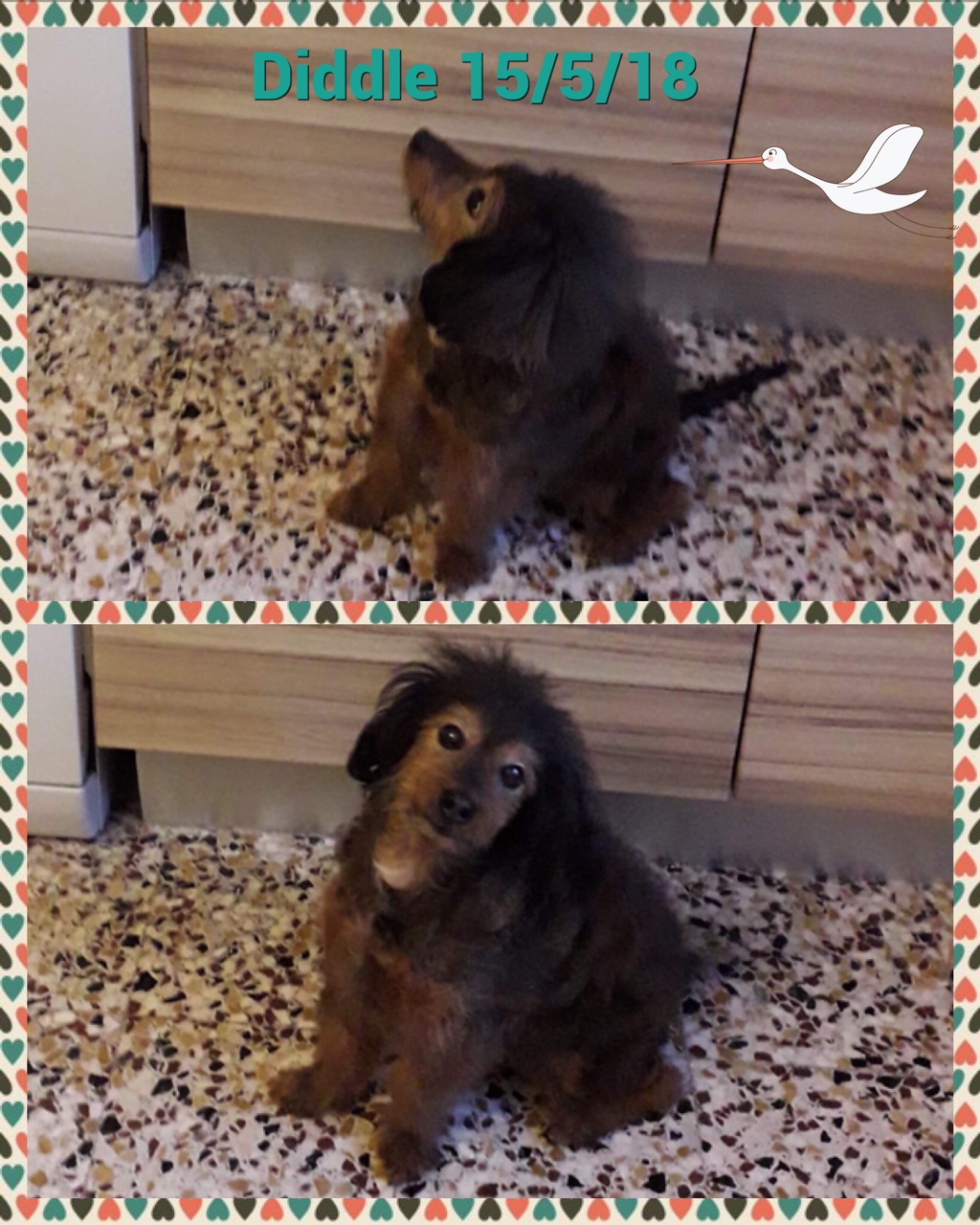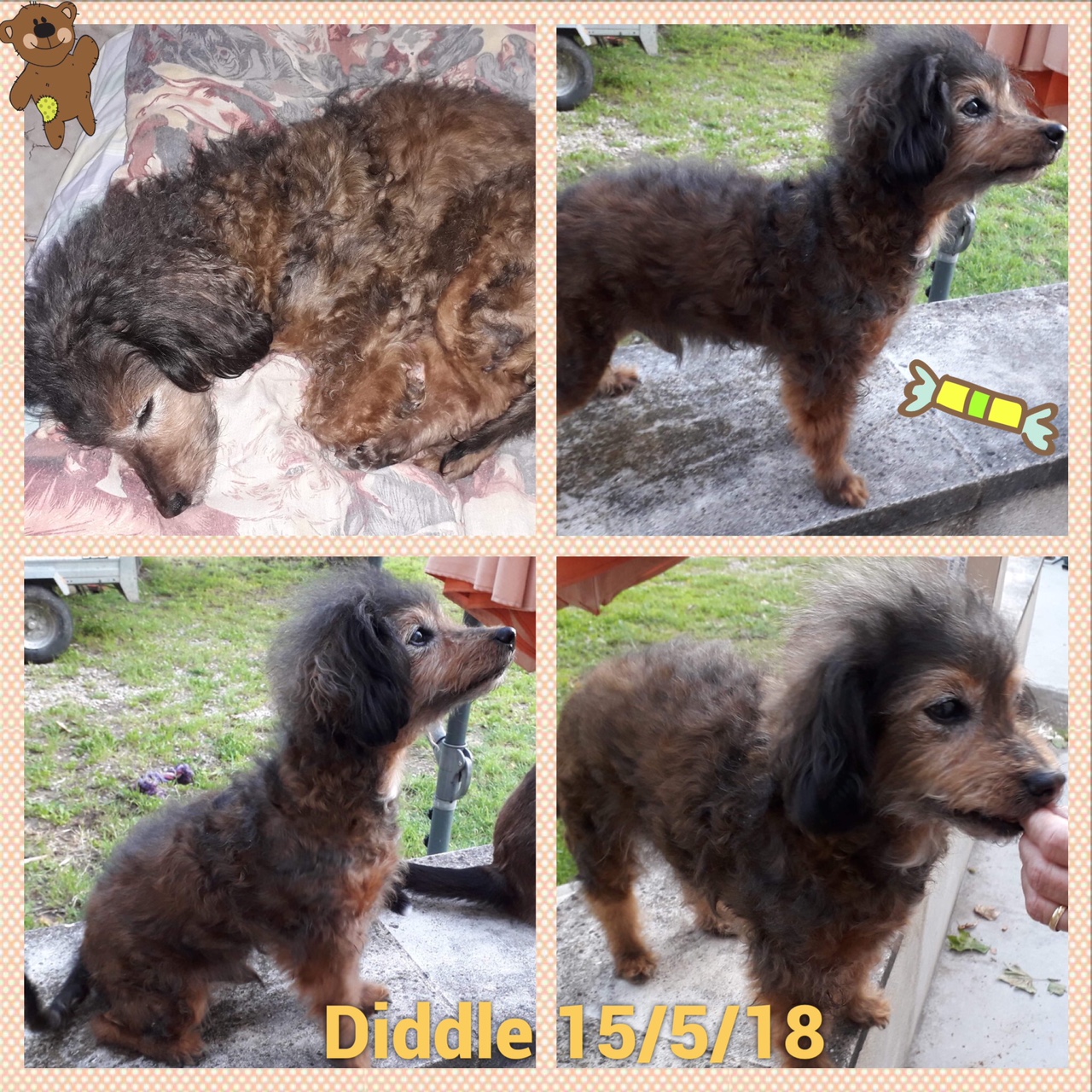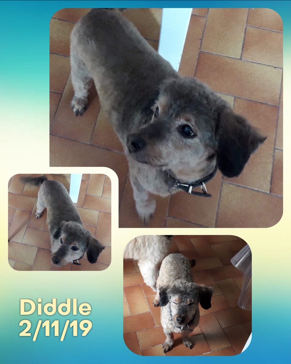 DIDDLE est un chien de type croisé caniche, non lof, couleur marron et gris. Mâle castré, vacciné (rappel à faire en Mars 2018), identifié 250269600757309, il est né le 15/6/04, il va avoir 14 ans dans quelques mois. Il a été déparasité, détartré et castré (retrait d’une tumeur testiculaire) par l’association. Son bilan sanguin est bon, il a un souffle au coeur mais ne nécessite pas traitement car il ne présente pas de symptômes. Il est donc en forme pour son âge.