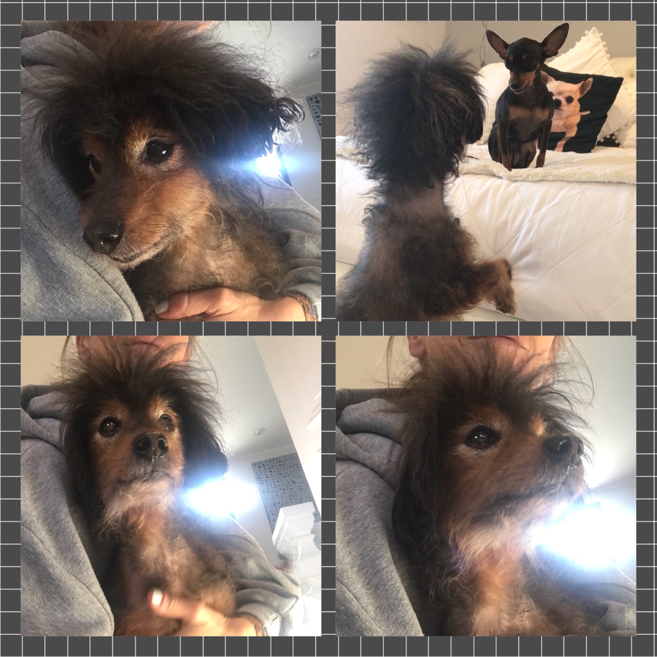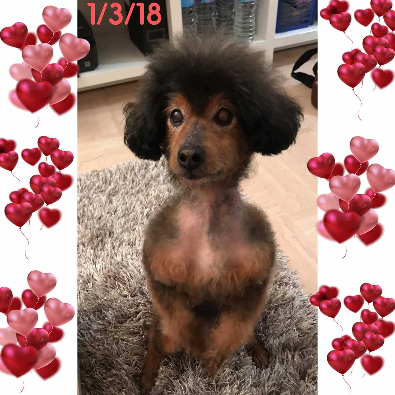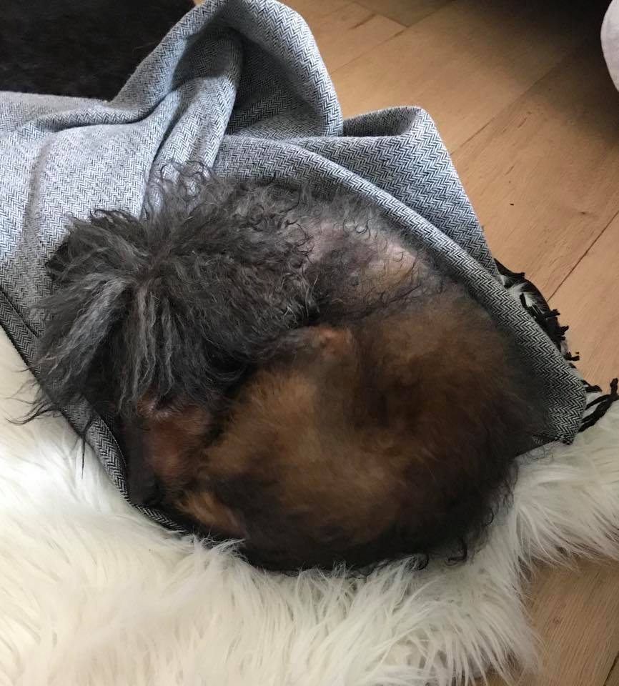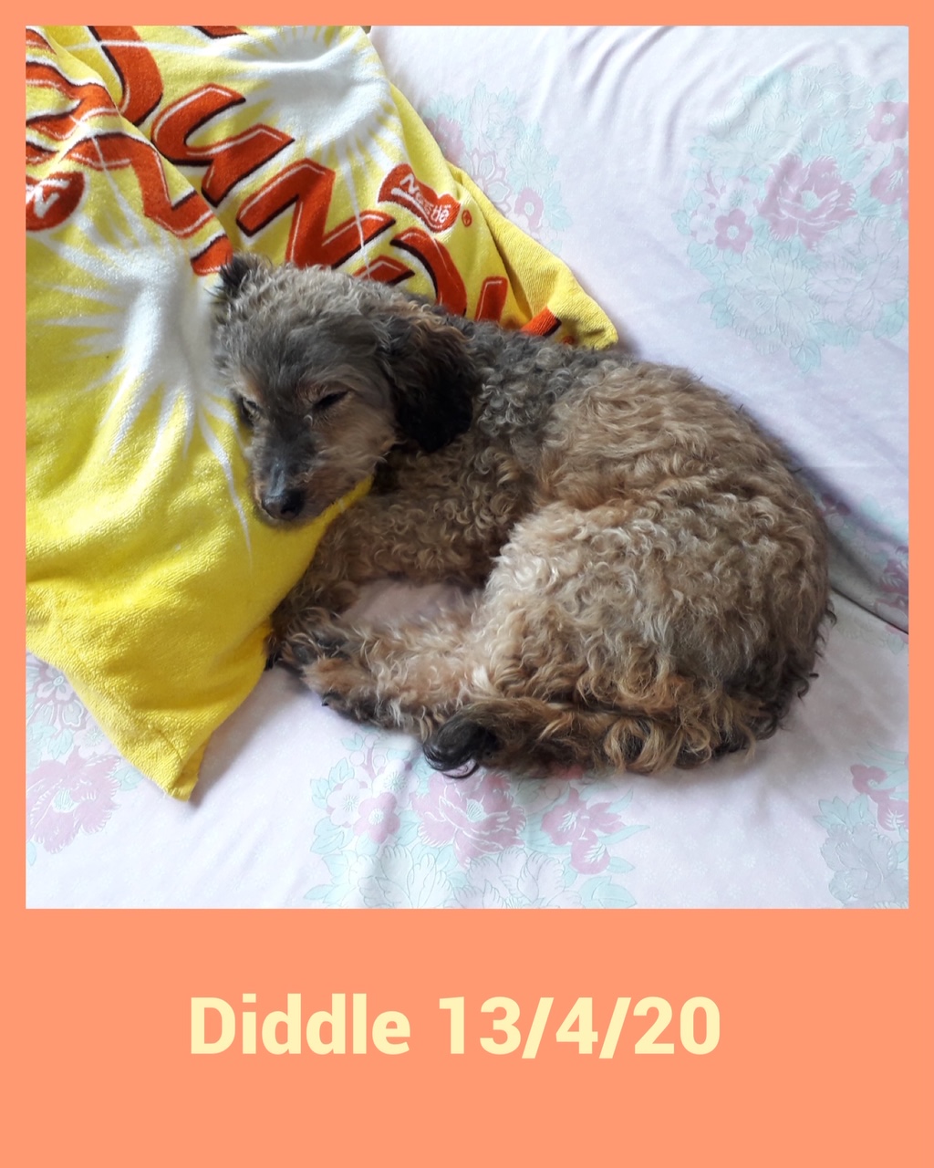 DIDDLE est un chien de type croisé caniche, non lof, couleur marron et gris. Mâle castré, vacciné (rappel à faire en Mars 2018), identifié 250269600757309, il est né le 15/6/04, il va avoir 14 ans dans quelques mois. Il a été déparasité, détartré et castré (retrait d’une tumeur testiculaire) par l’association. Son bilan sanguin est bon, il a un souffle au coeur mais ne nécessite pas traitement car il ne présente pas de symptômes. Il est donc en forme pour son âge.