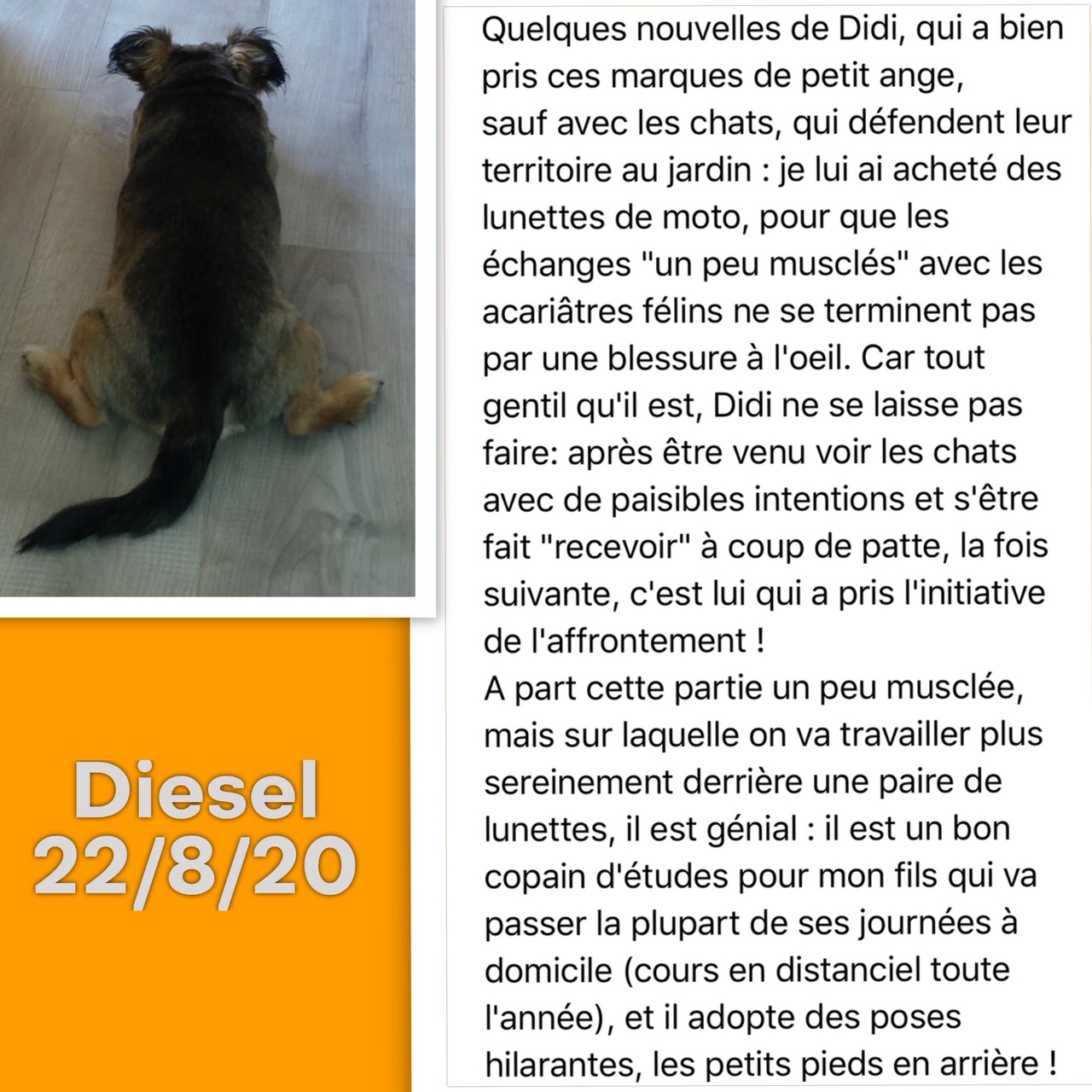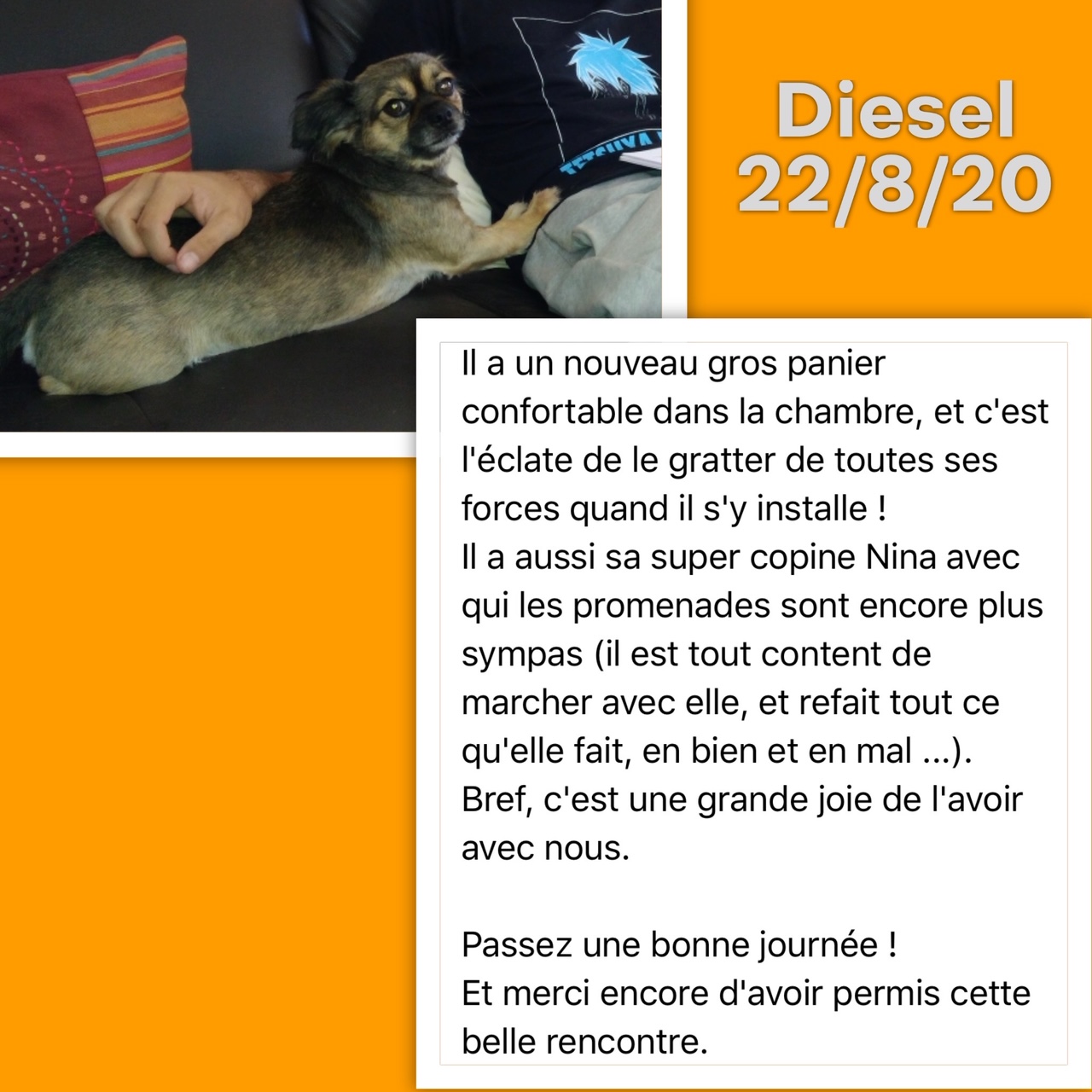 Diesel est un chien qui a été acheté en élevage par la famille qui s’en sépare en vue d’un déménagement à l’étranger. Il vit en maison avec jardin, en compagnie de sa fille et son fils.