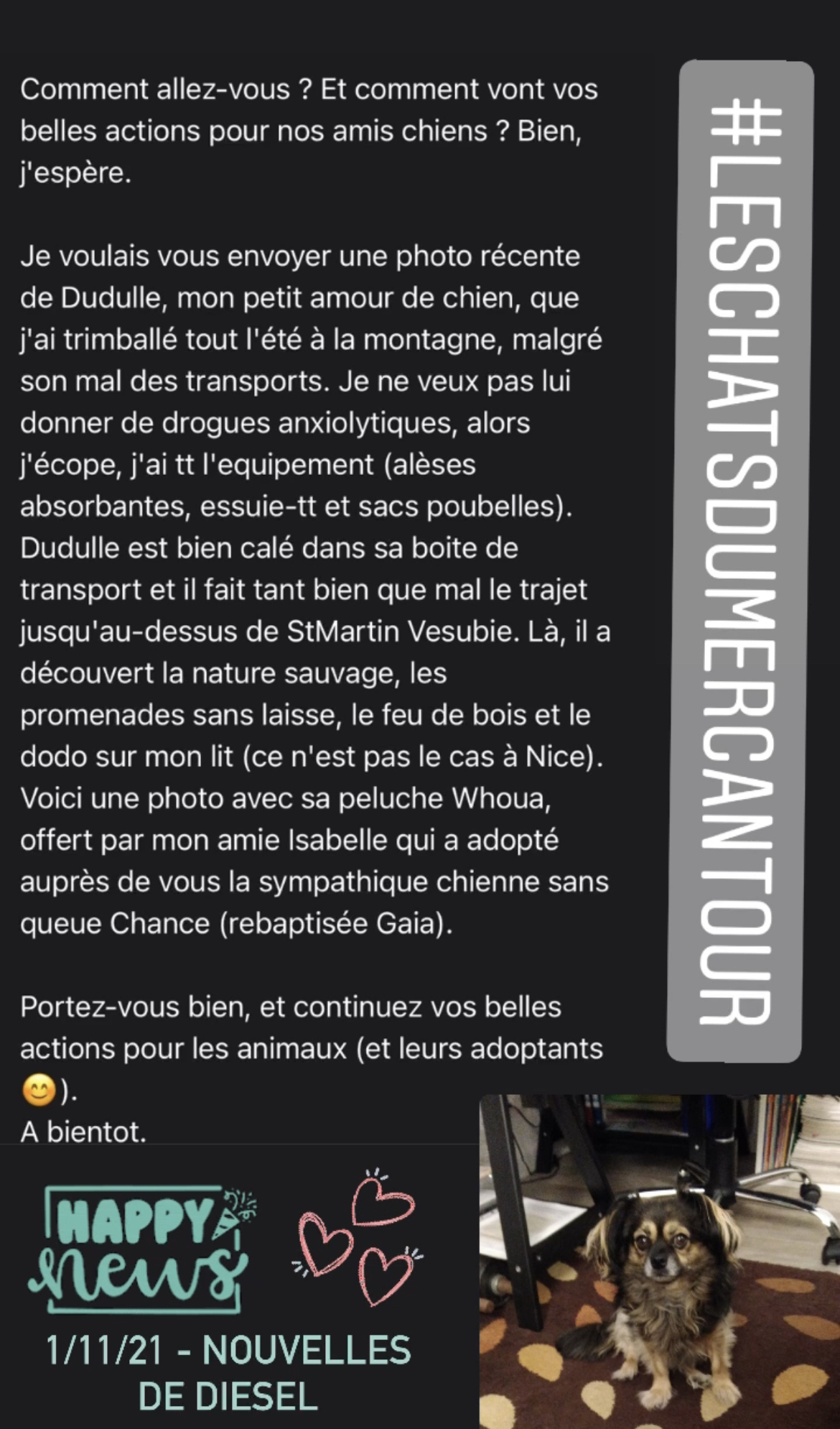 NB : merci de mûrement réfléchir à l’engagement moral et financier qu’une adoption représente (santé, factures vétérinaires, entretien, alimentation environ 500 euros par an, absences, vacances ou autres = pension, accessoires quotidiens, éducation, etc.). Merci aussi de bien vous renseigner au préalable sur les caractéristiques de la race concernée. Un chien vit en moyenne 15 ans. C’est une être sensible avec tout ce que cela implique, ce n’est pas un objet ni un être qui agit sur commande.