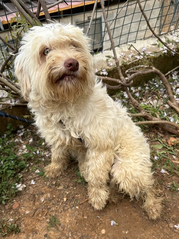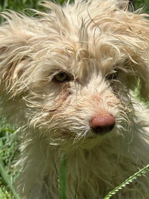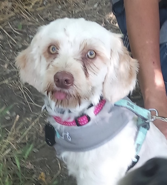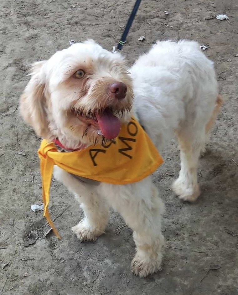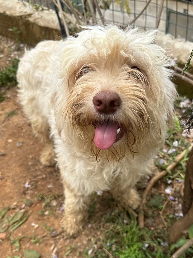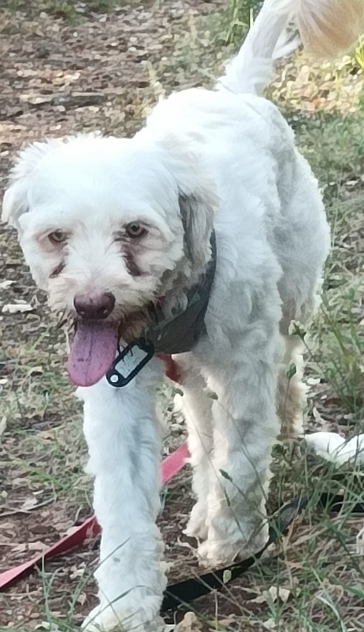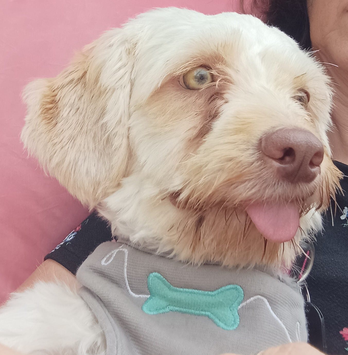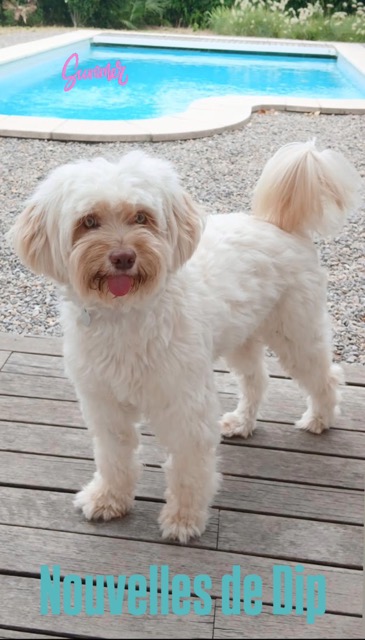 DIP est un chien de type croisée bichon, non lof, couleur blanc aux yeux verts.