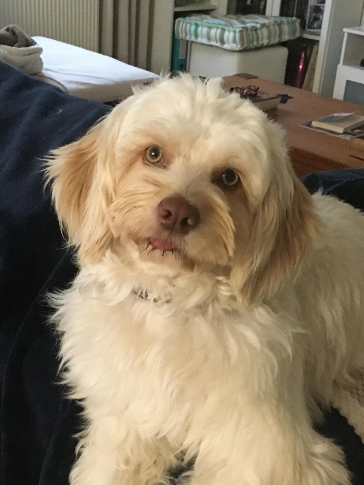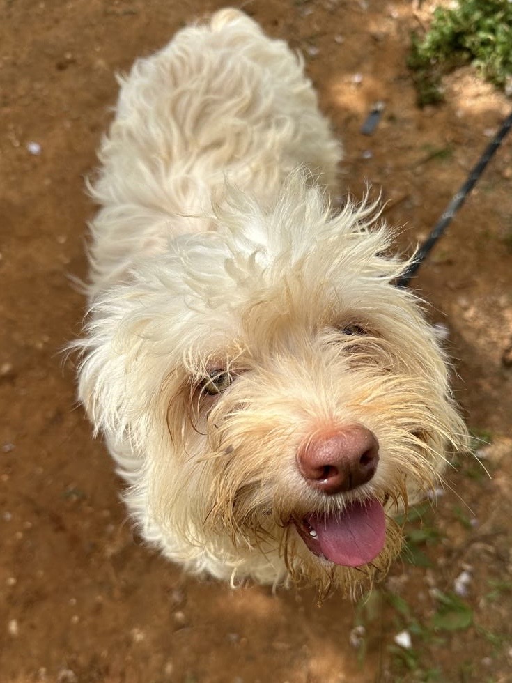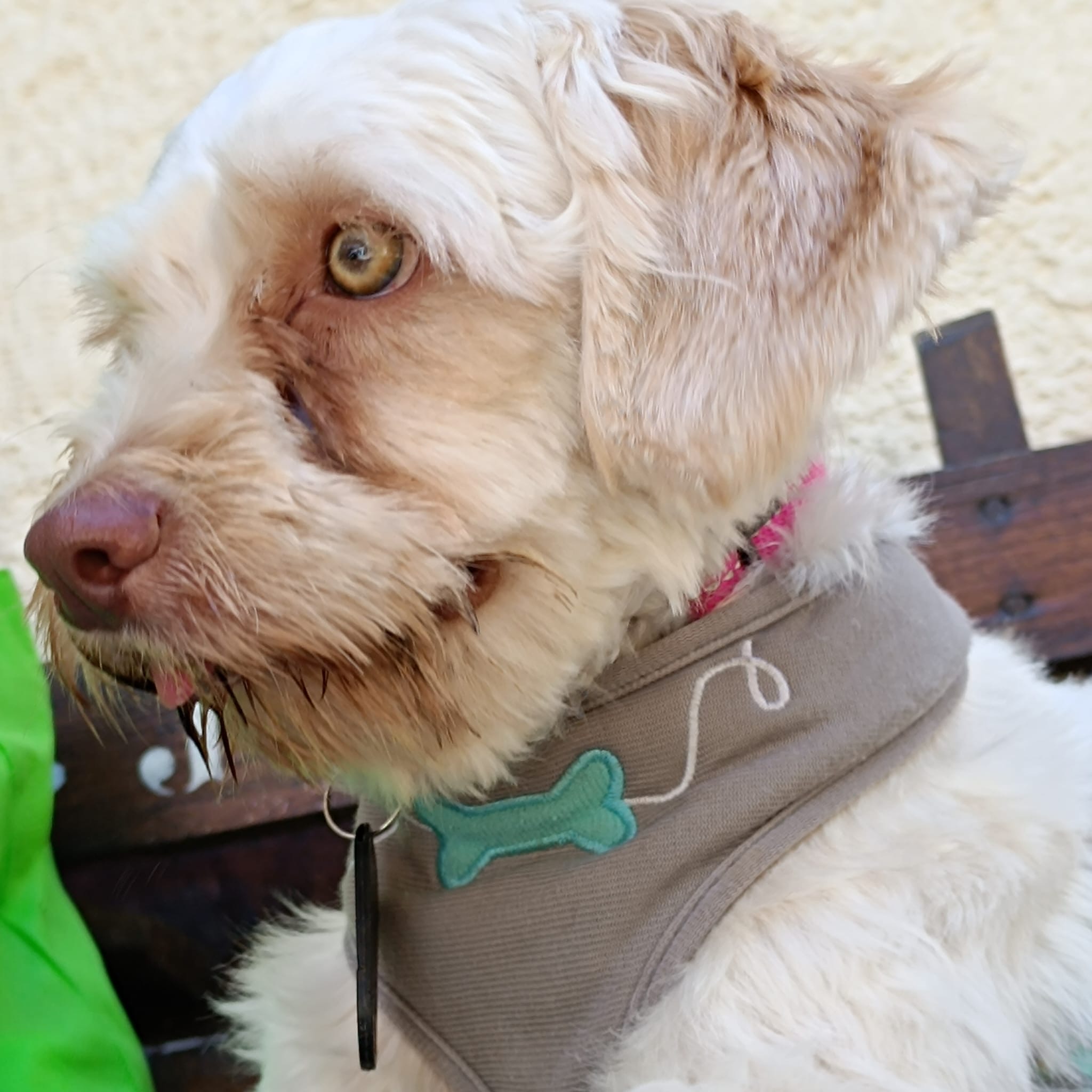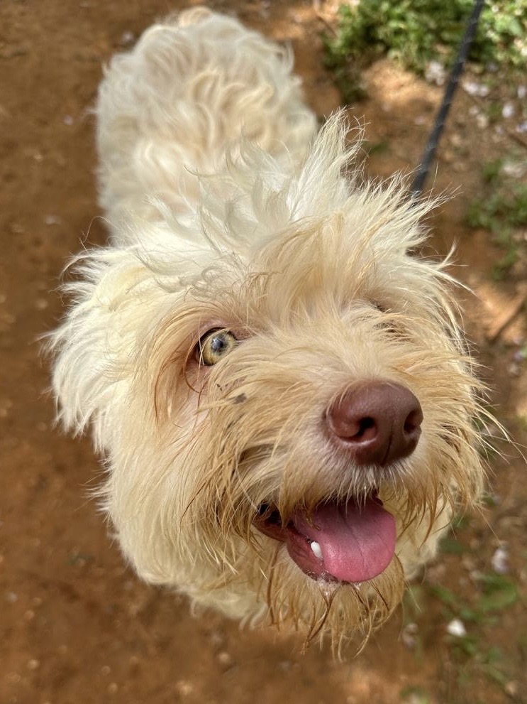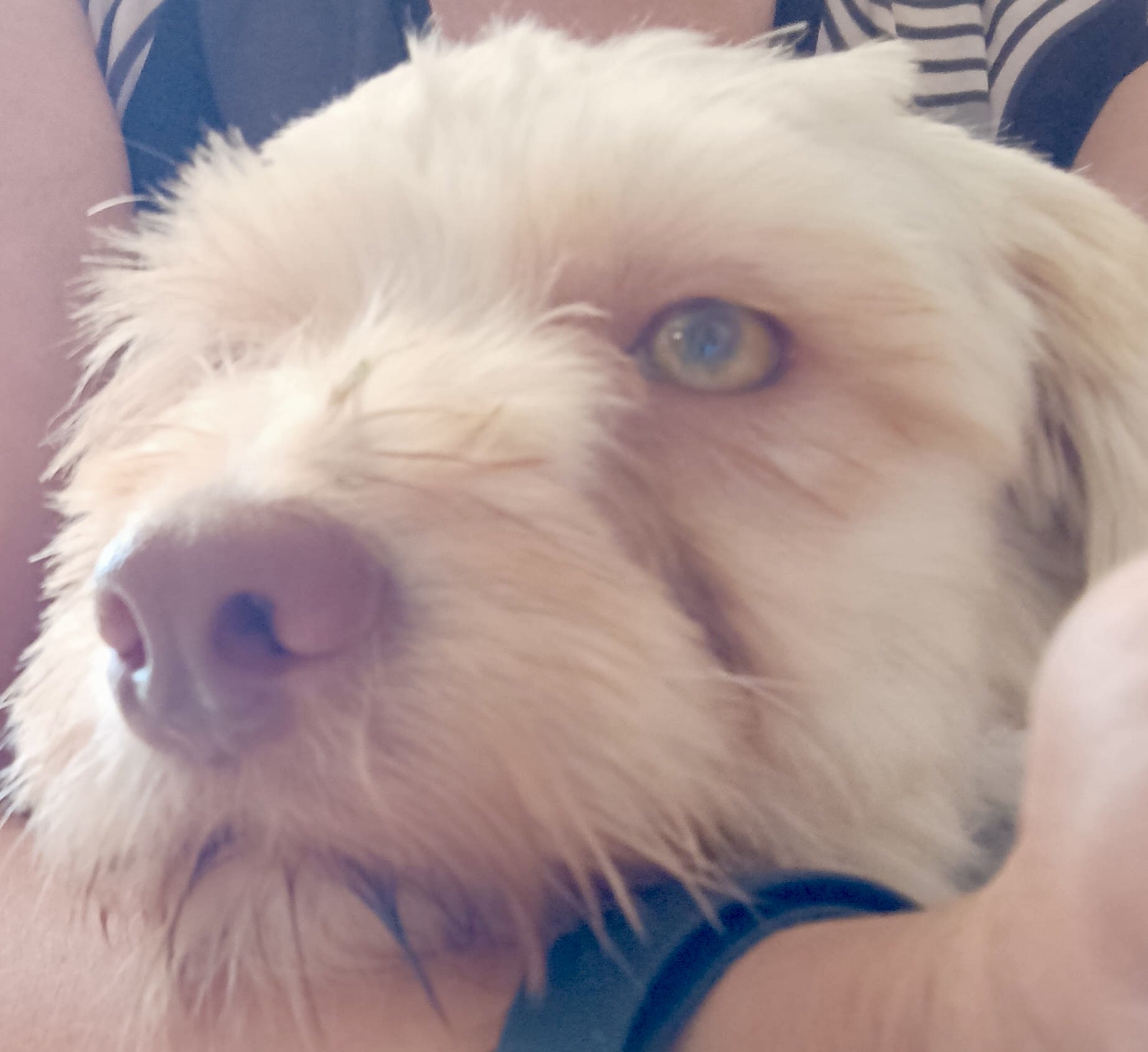 DIP est un chien de type croisée bichon, non lof, couleur blanc aux yeux verts.