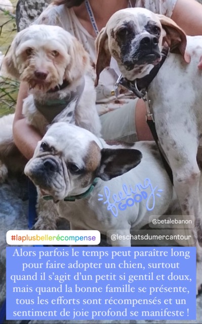 NB : merci de mûrement réfléchir à l’engagement moral et financier qu’une adoption représente (santé, factures vétérinaires, entretien, alimentation environ 800 euros par an, absences, vacances ou autres = pension, accessoires quotidiens, éducation, etc.). Merci aussi de bien vous renseigner au préalable sur les caractéristiques de la race concernée. Un chien vit en moyenne 15 ans. C’est un être sensible avec tout ce que cela implique, ce n’est pas un objet ni un être qui agit sur commande.