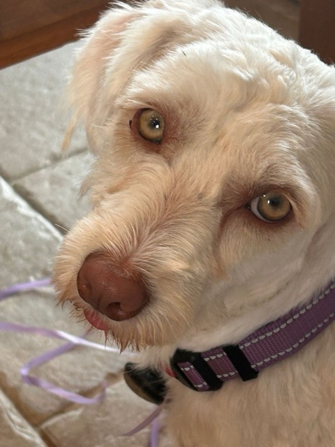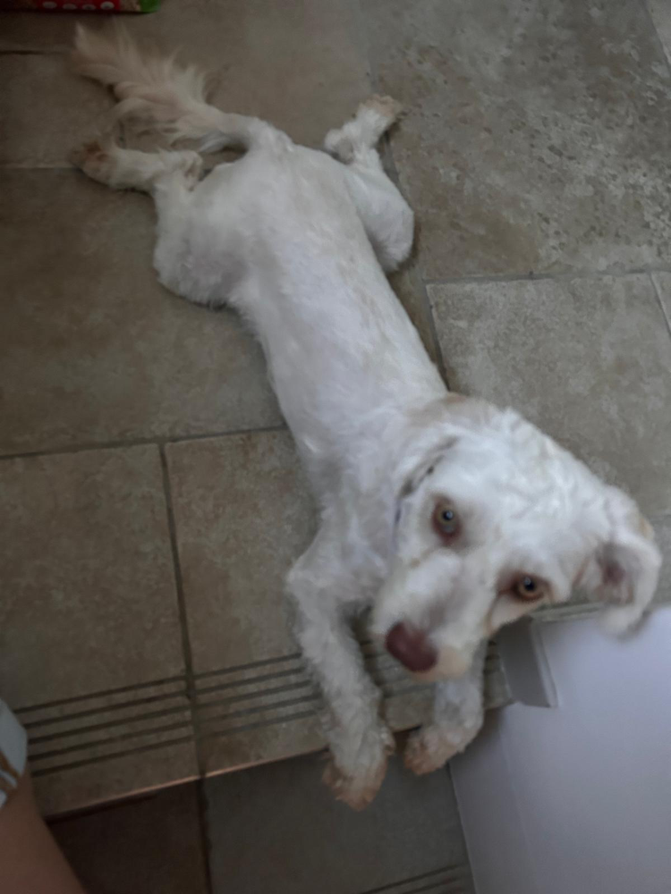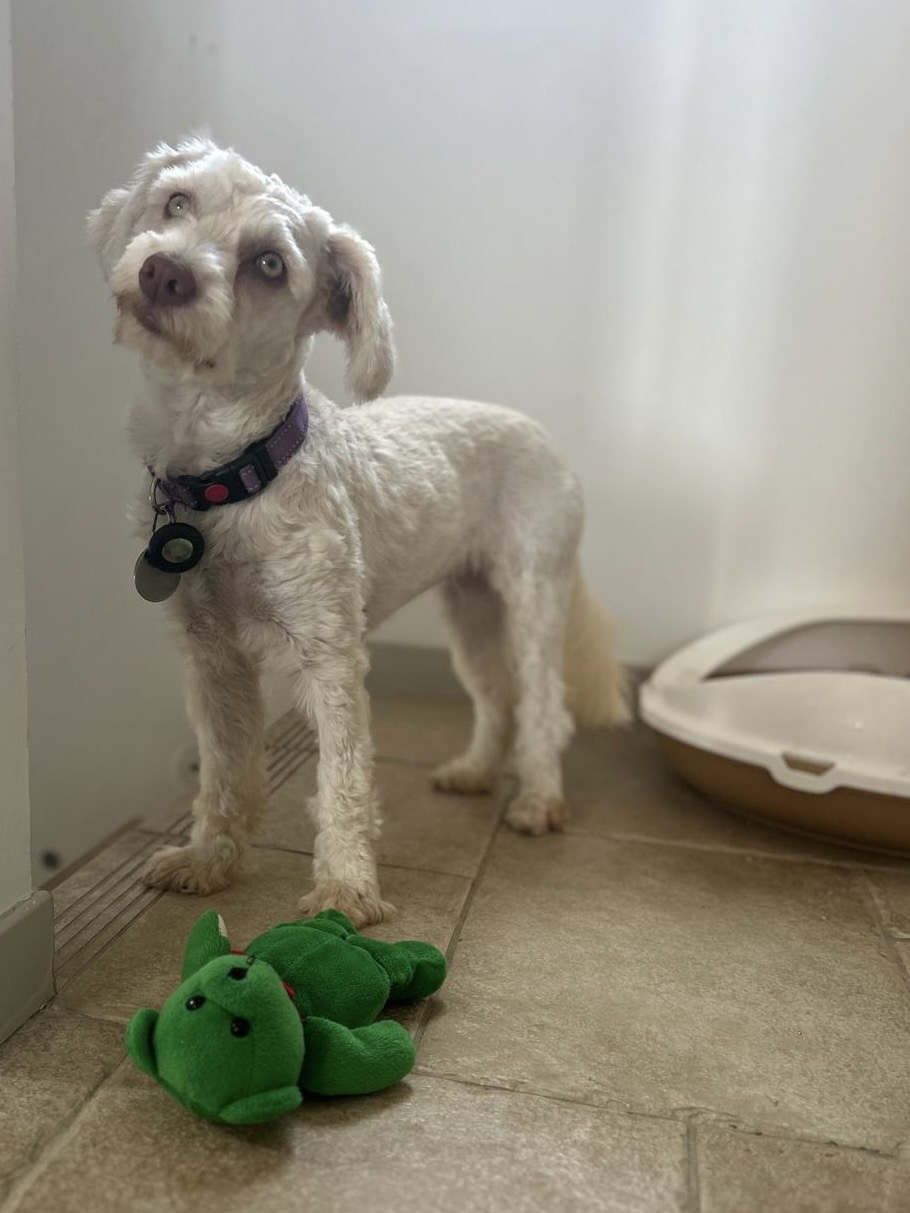 DIPSY est une chienne de type croisée bichon, non lof, couleur blanche aux yeux verts.