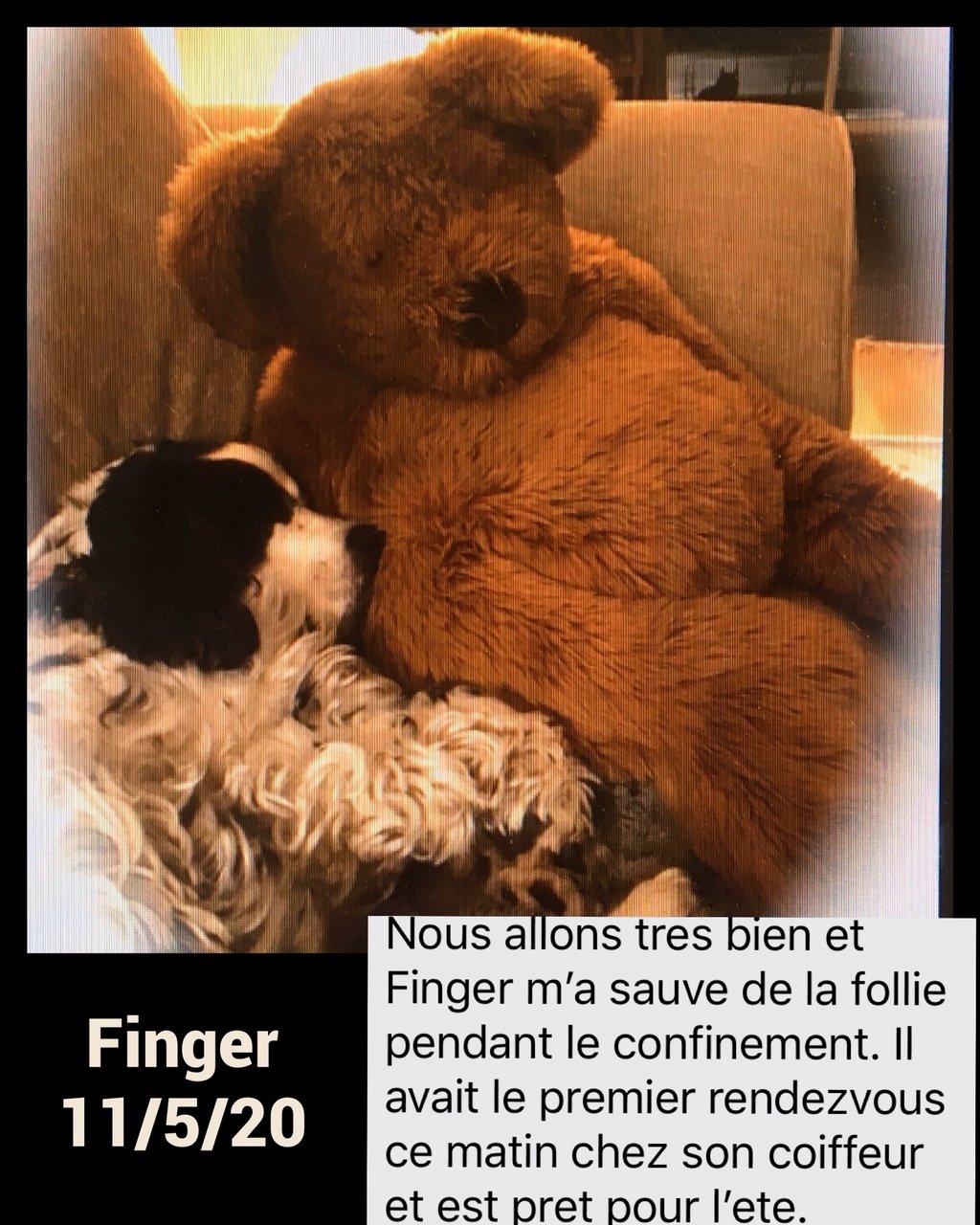 Finger est un petit amour qui va souffrir de son abandon. Il faudra lui laisser le temps nécessaire pour s’adapter à sa nouvelle famille et routine, pour qu’il puisse renaitre au mieux de sa déception. Beaucoup d’amour, de belles balades, et une routine/environnement sain et équilibré seront le secret.