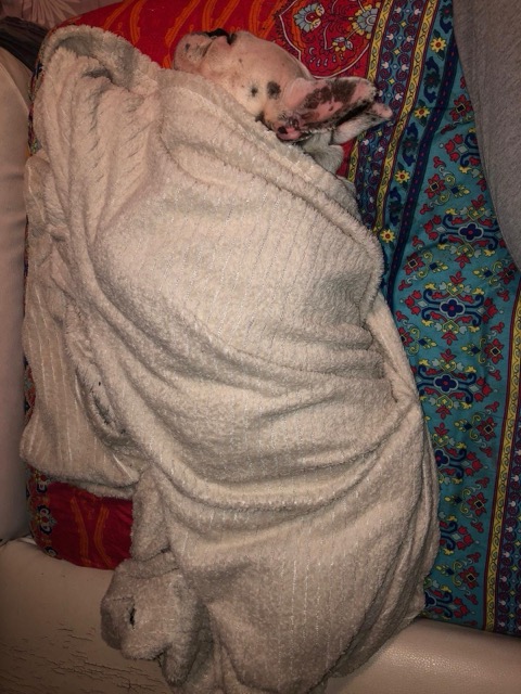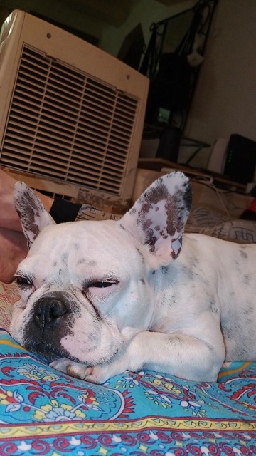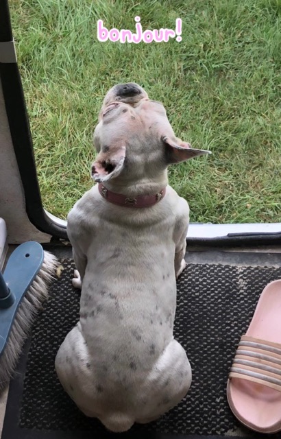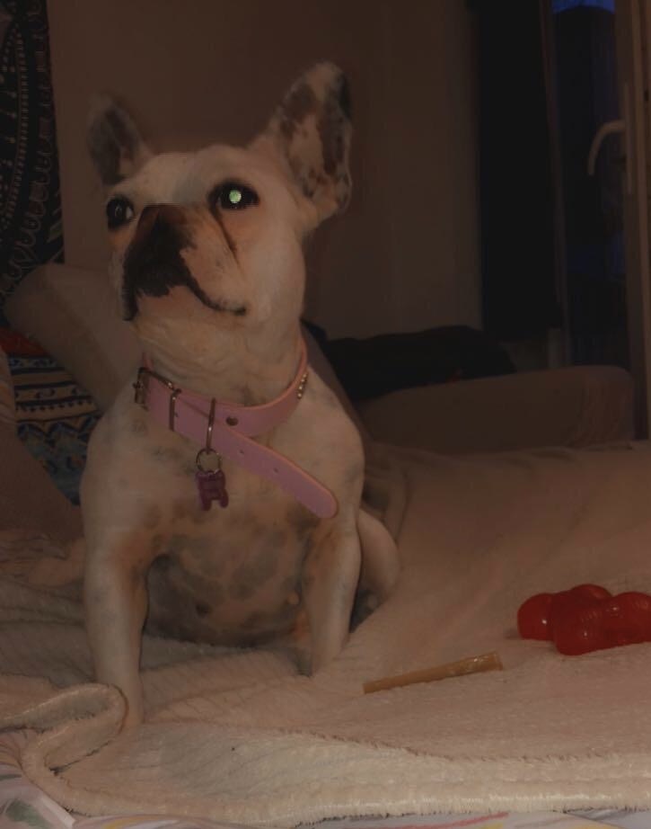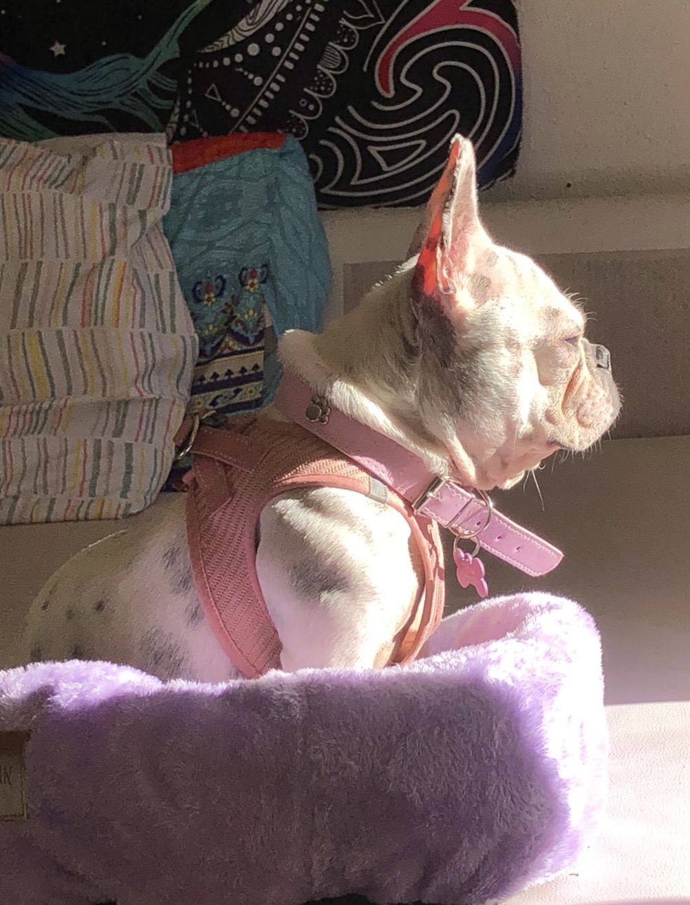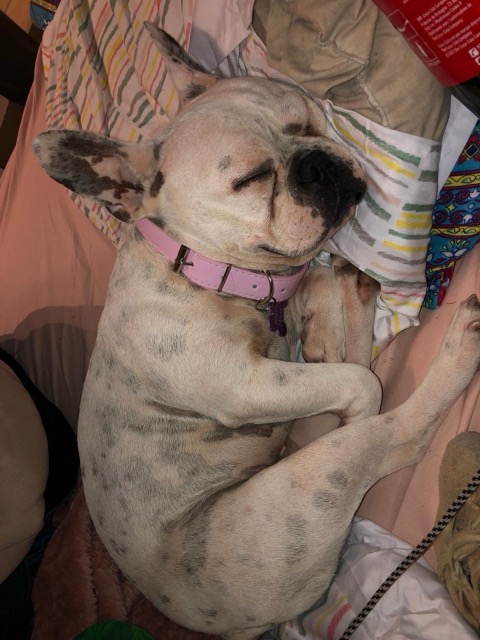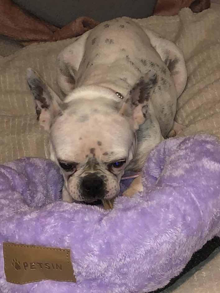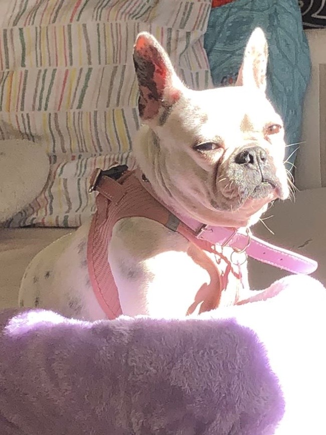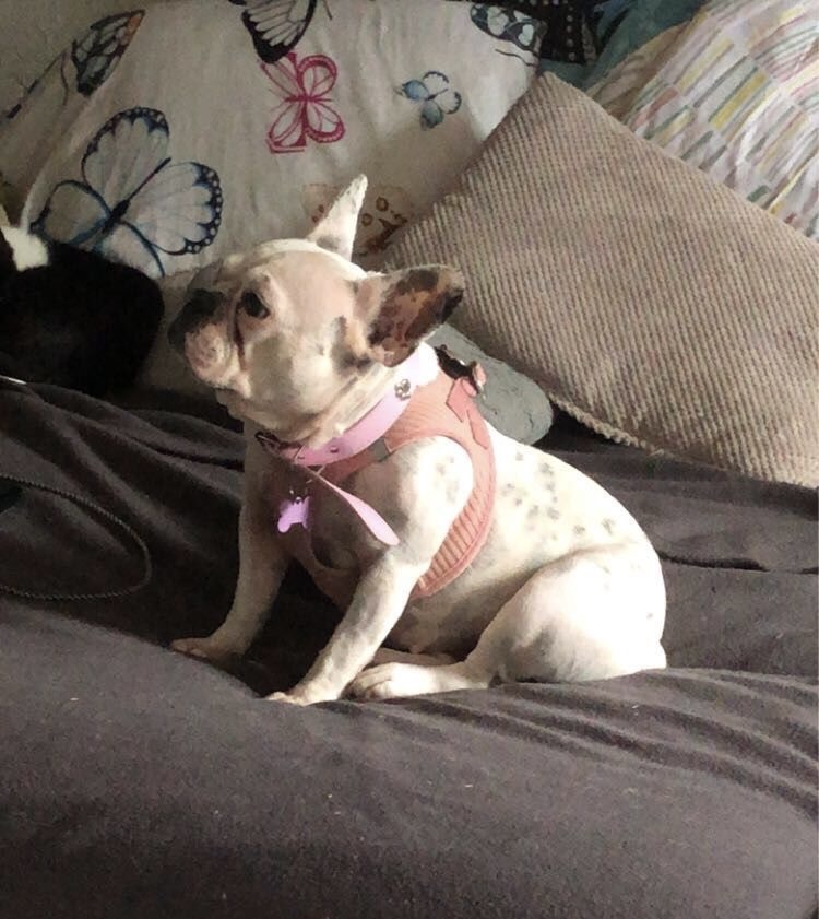 FRENCHIE est une chienne de type Bouledogue Français, non lof, couleur blanche et mouchetée.