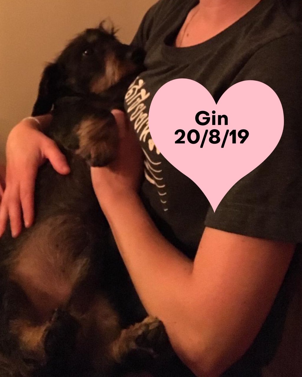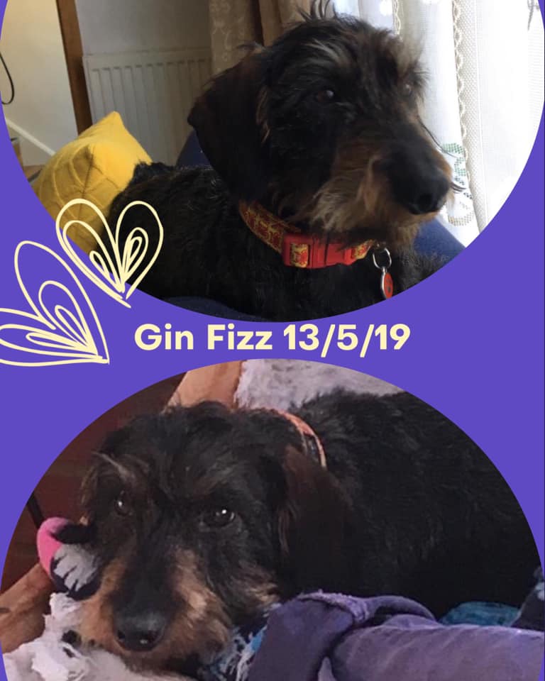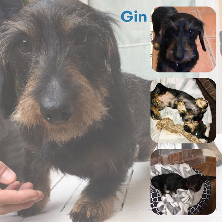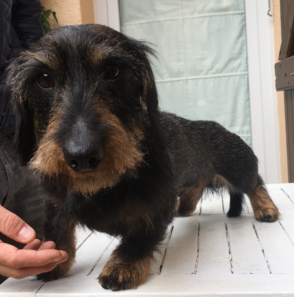 GIN FIZZ est un chien de race teckel à poil dur, lof, couleur sanglier. Mâle castré, pucé 250269500487834, traité pour les parasites internes et externes, vacciné.