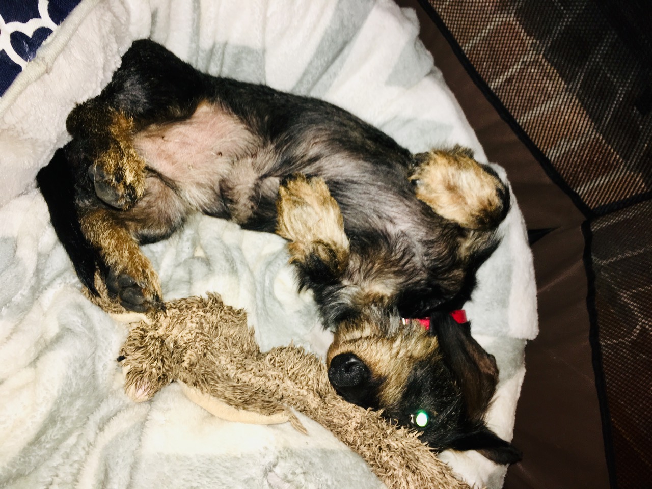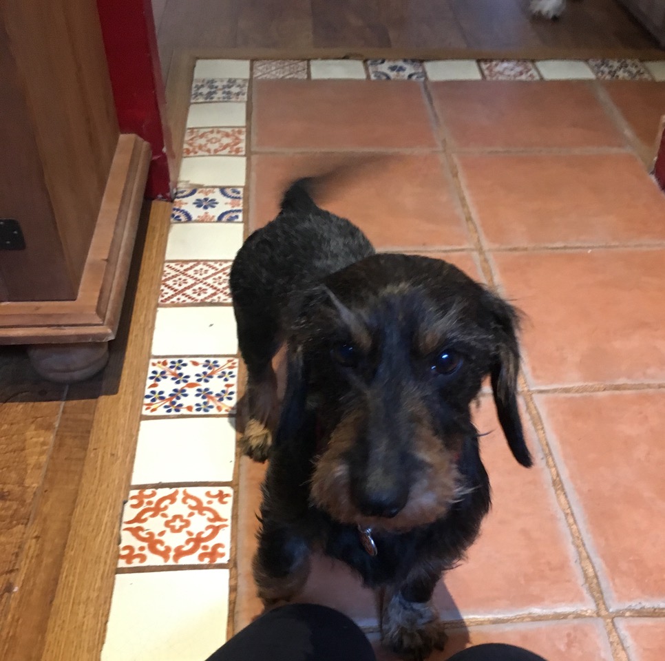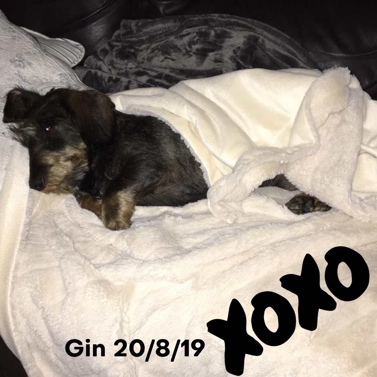 GIN FIZZ est un chien de race teckel à poil dur, lof, couleur sanglier. Mâle castré, pucé 250269500487834, traité pour les parasites internes et externes, vacciné.