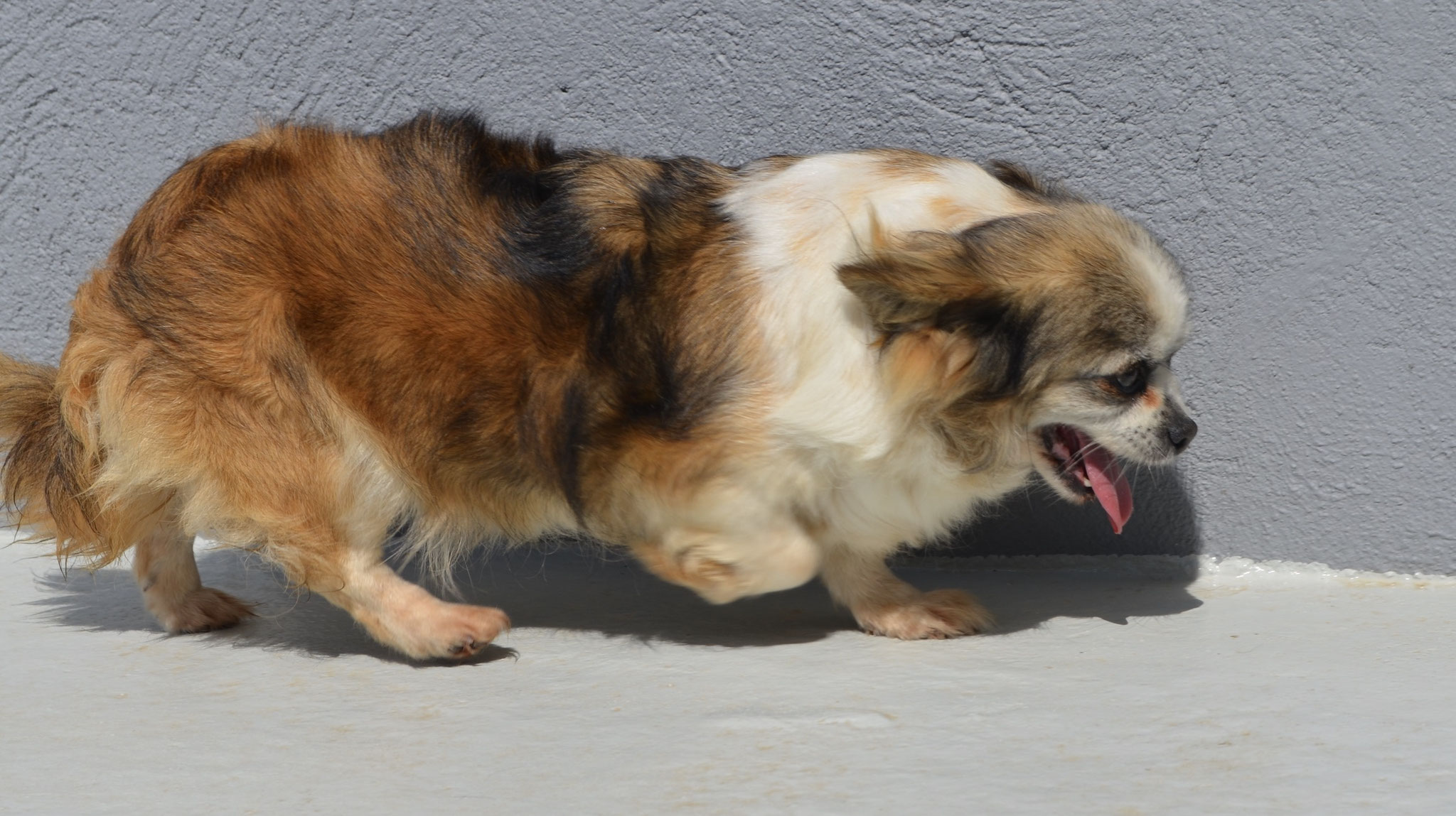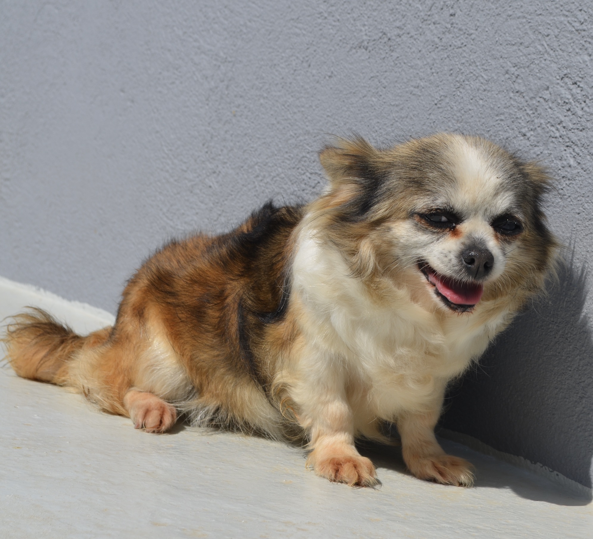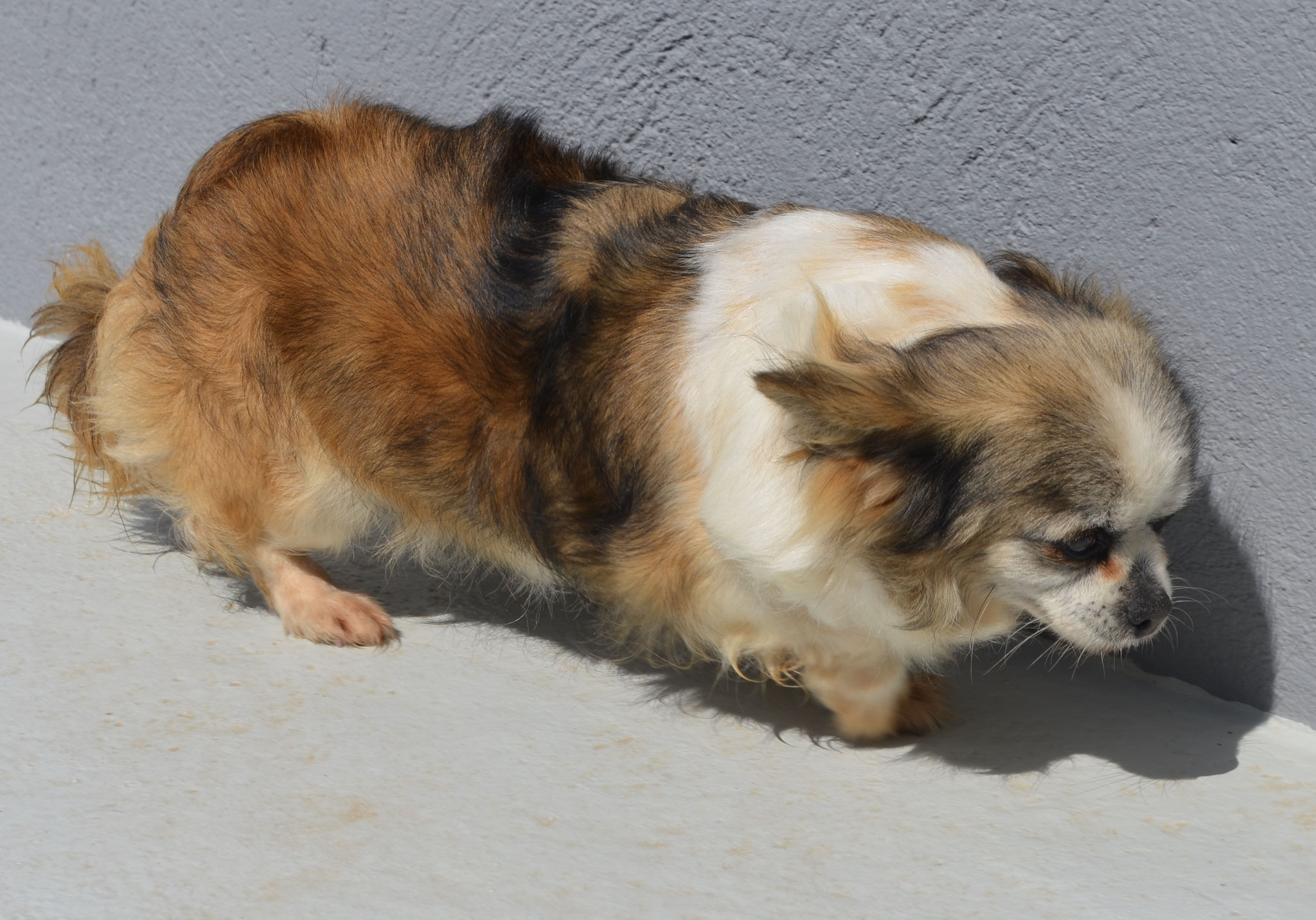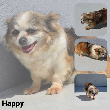 HAPPY est une chienne de race Chihuahua, lof, couleur Fauve et blanc au poil mi-long.