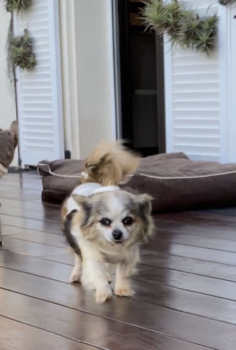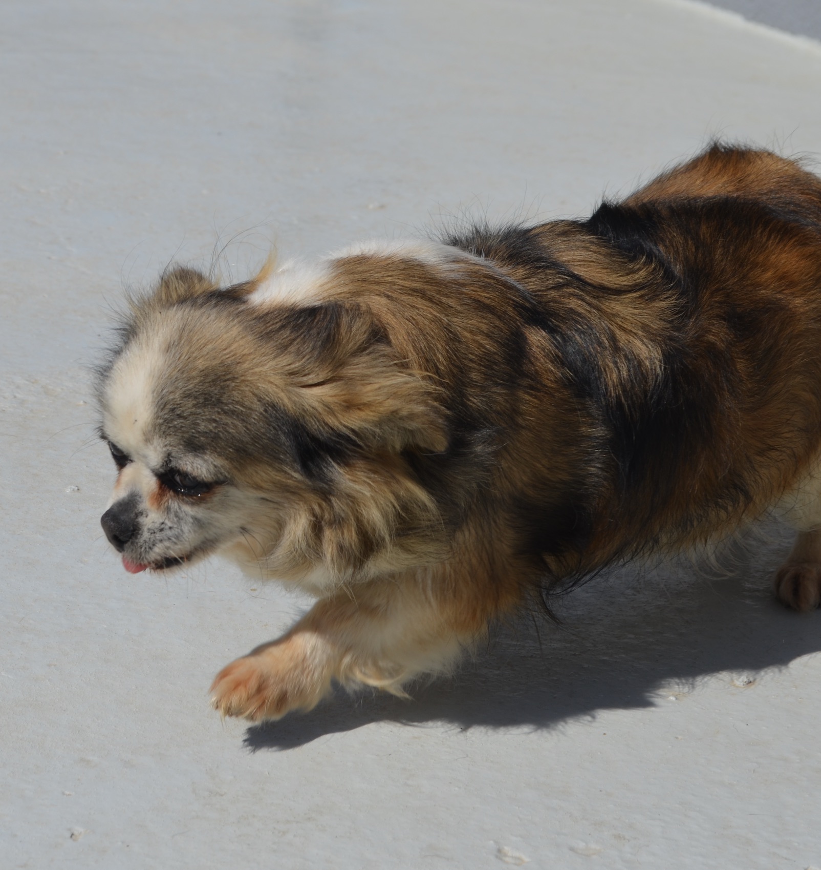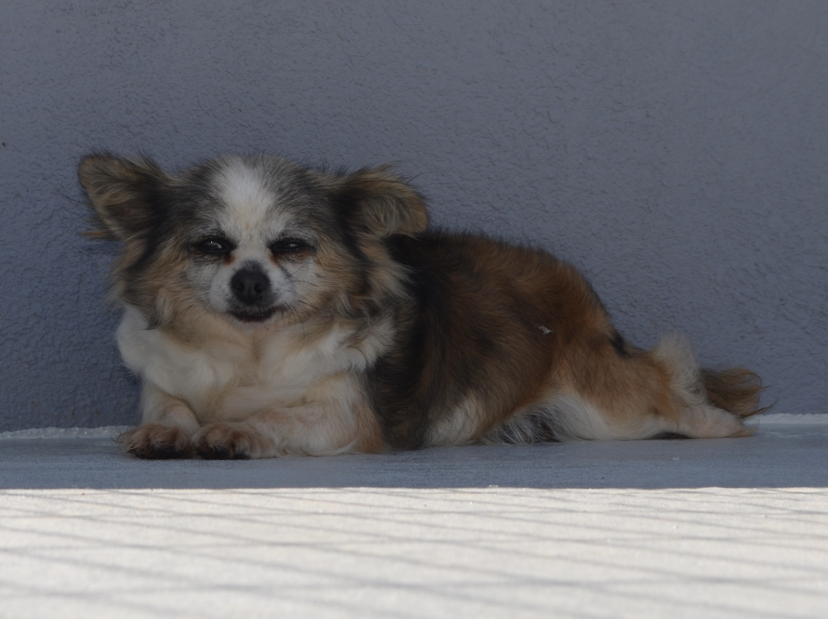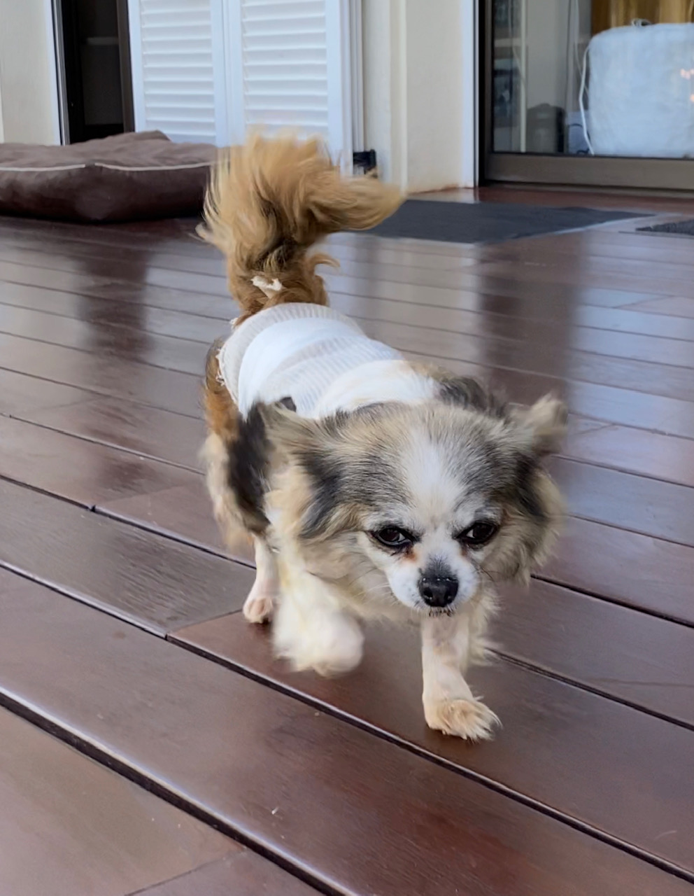 HAPPY est une chienne de race Chihuahua, lof, couleur Fauve et blanc au poil mi-long.