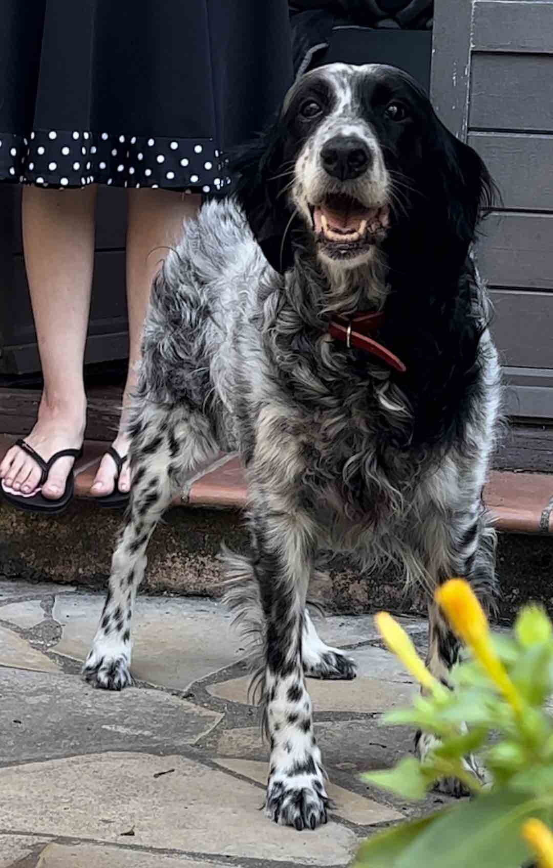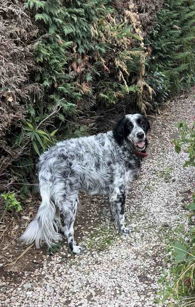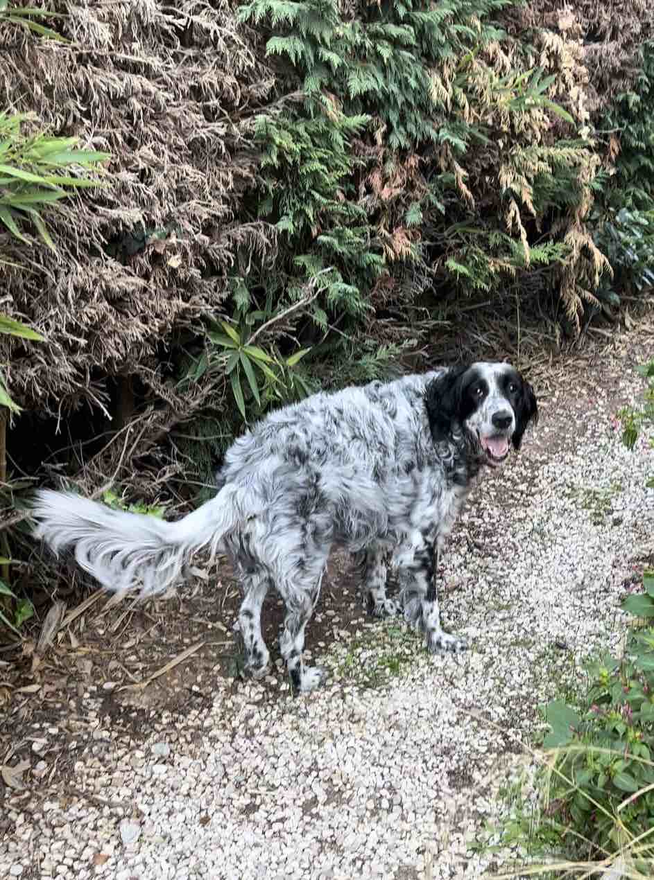GITANE est une chienne de race Setter Anglais, lof, couleur truite, blanche et noire.
