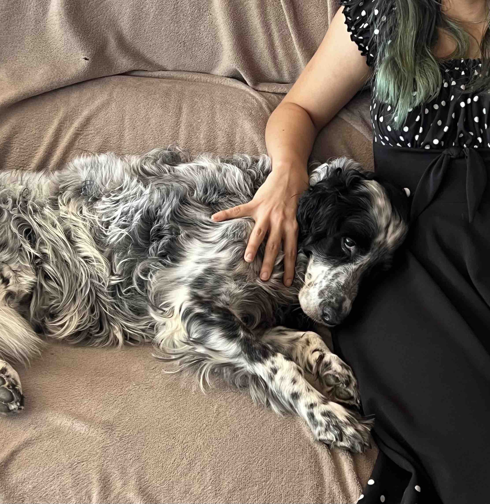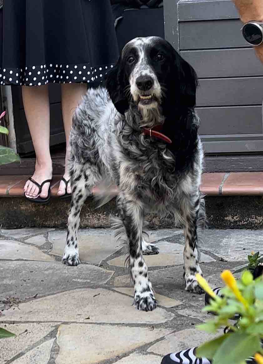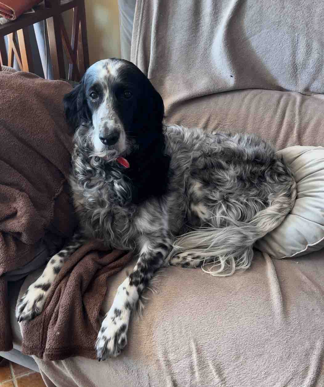 GITANE est une chienne de race Setter Anglais, lof, couleur truite, blanche et noire.