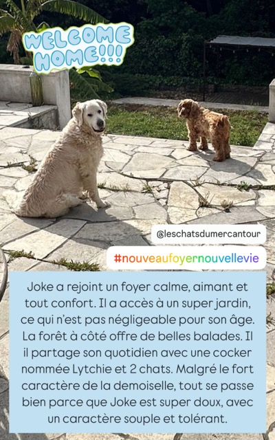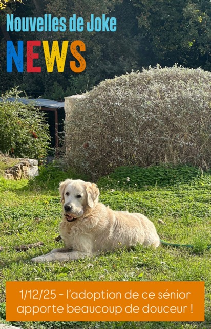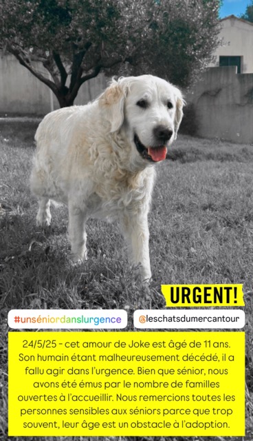JOKE est un chien qui a toujours été aimé, bien suivi et parfaitement sociabilisé. Son maitre l’emmenait absolument partout tellement il est facile à vivre. Malheureusement, le décès a frappé à la porte du foyer et aujourd’hui, Joke se retrouve orphelin… Sa situation est urgente et il faut très rapidement trouver une famille d’accueil ou d’adoption !