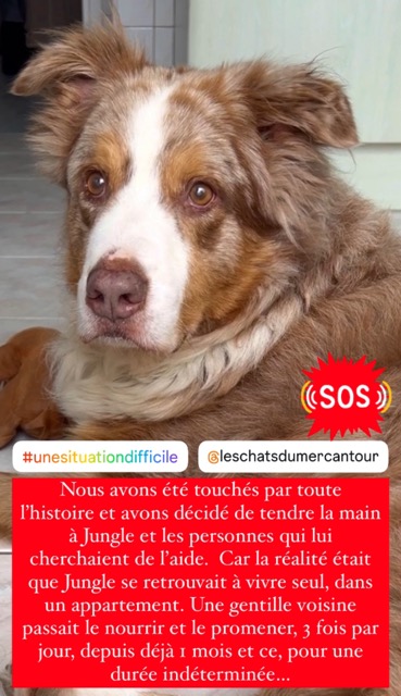 JUNGLE a toujours été un chien très aimé. Il a profité d’une vie sociable et équilibrée. Depuis septembre, malheureusement, sa maitresse est hospitalisée et est dans l’incapacité de l’assumer. Ce pauvre chien se retrouve TOUT SEUL dans un appartement, avec une voisine qui passe 3 fois par jour pour le sortir et le nourrir.