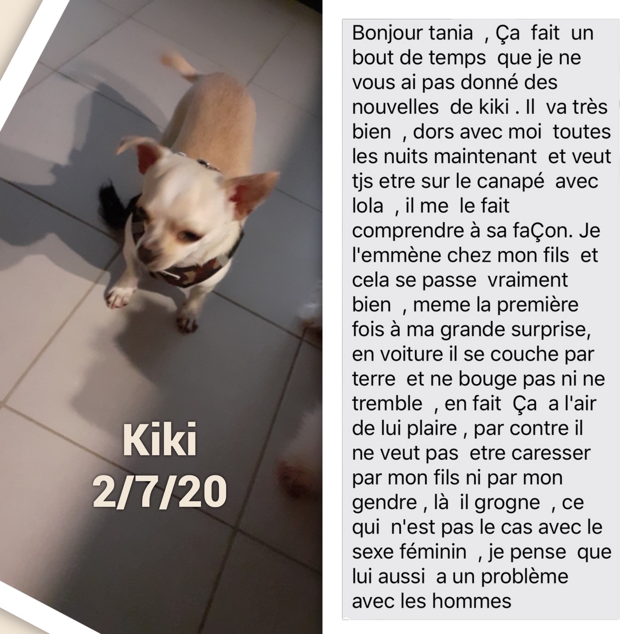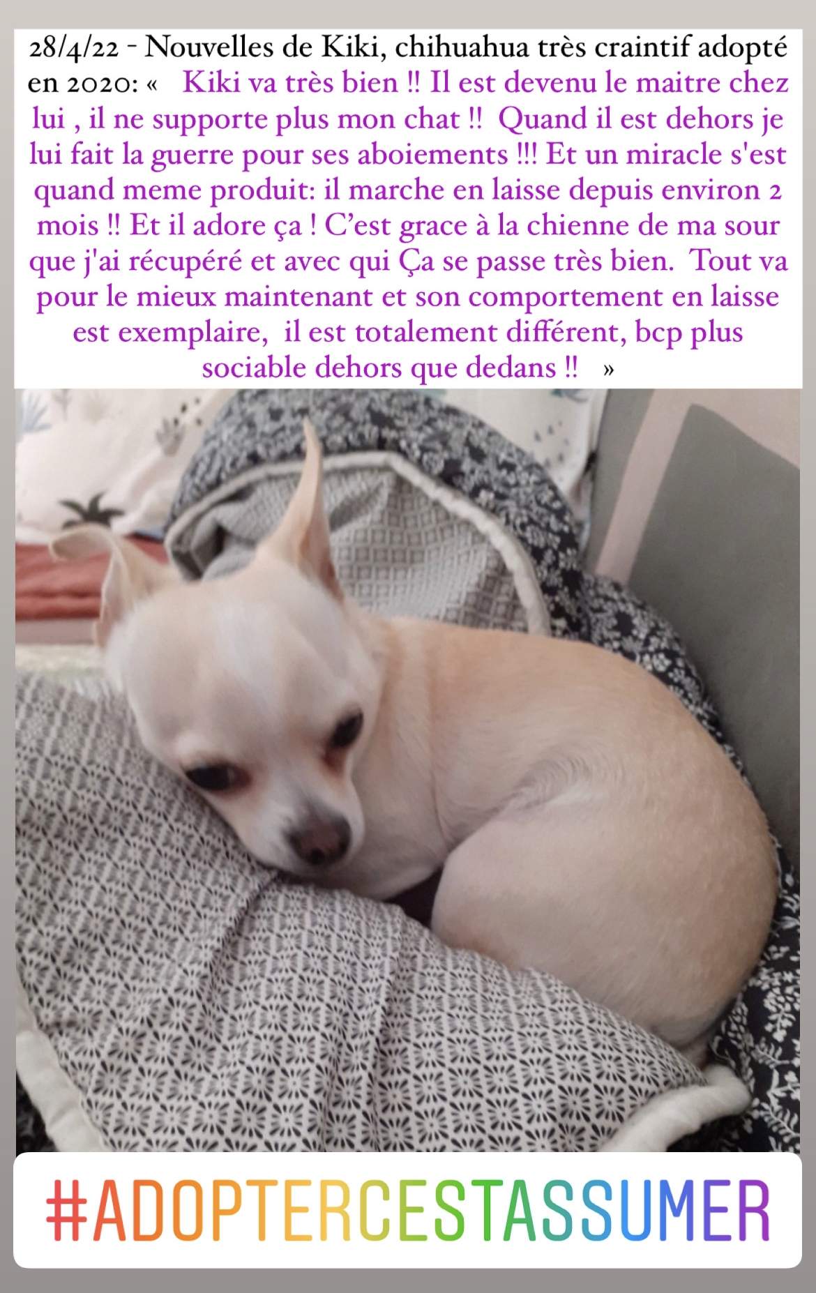 Et Kiki, n’attend qu’une seule chose, c’est de se sentir protégé, aimé, dans un environnement rassurant avec plein d’amour et de douceur.