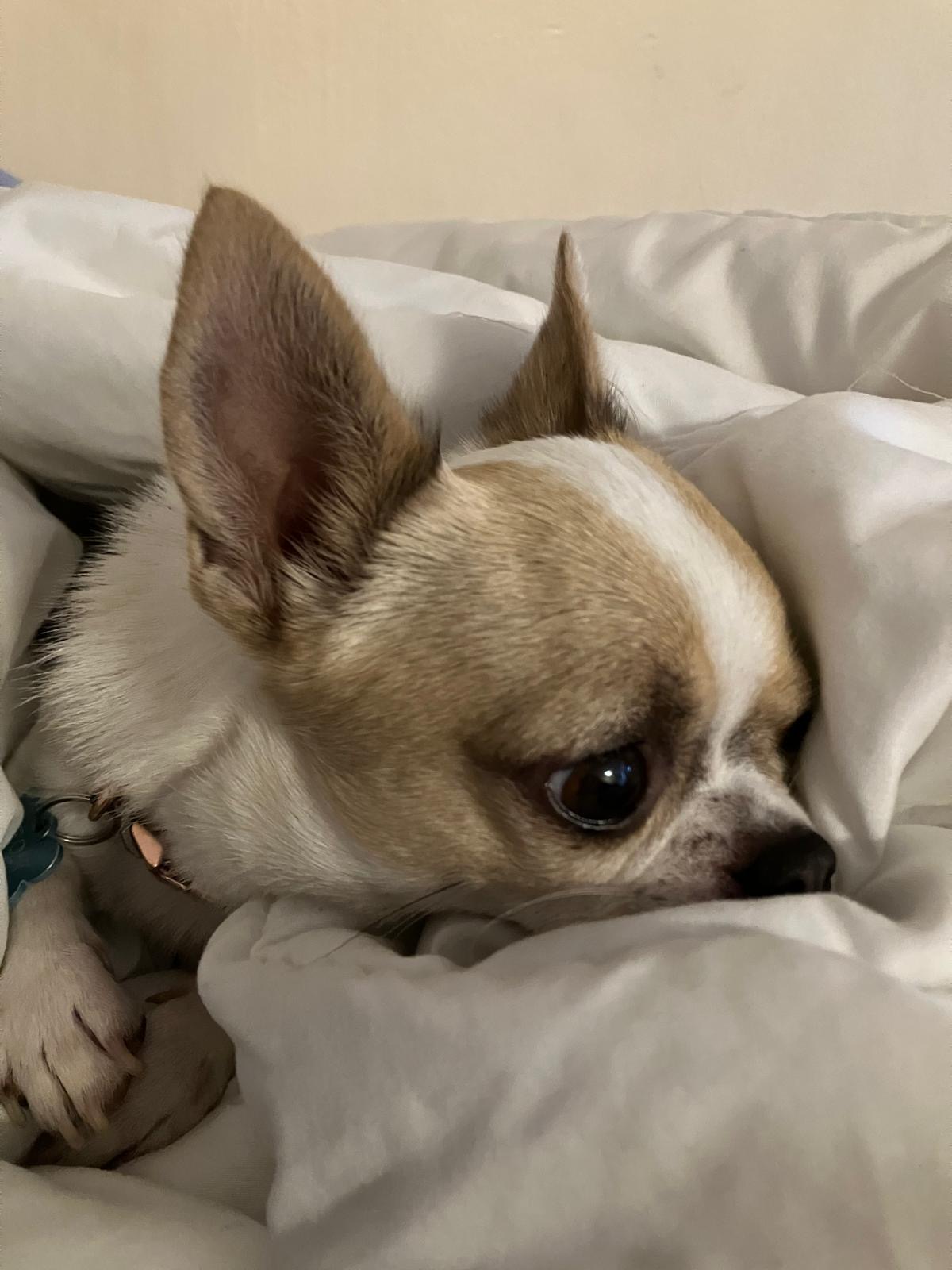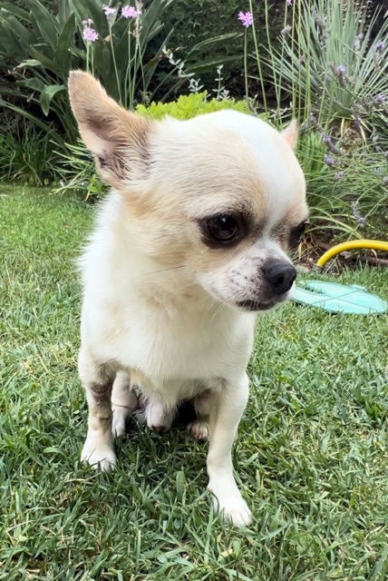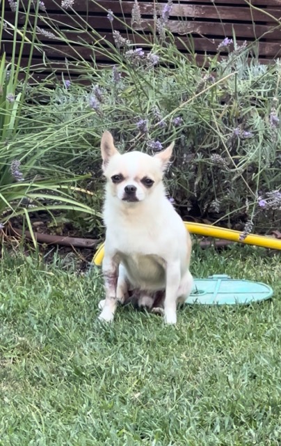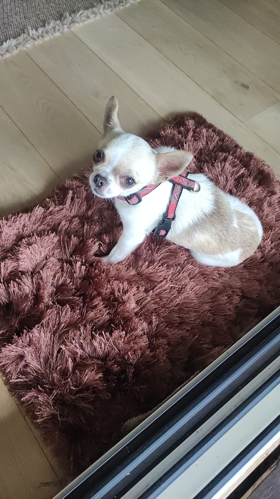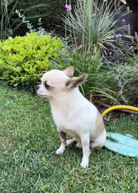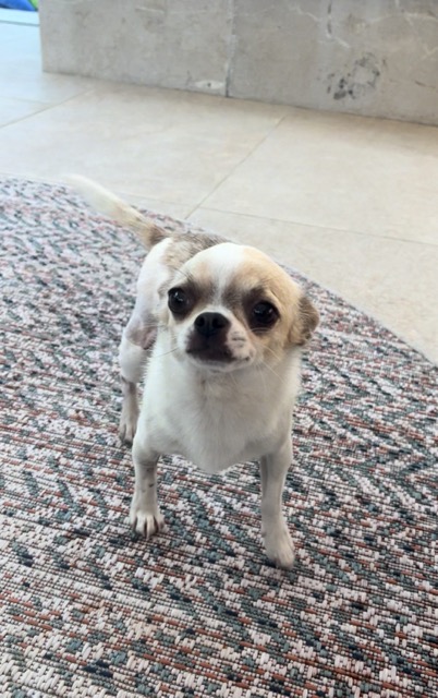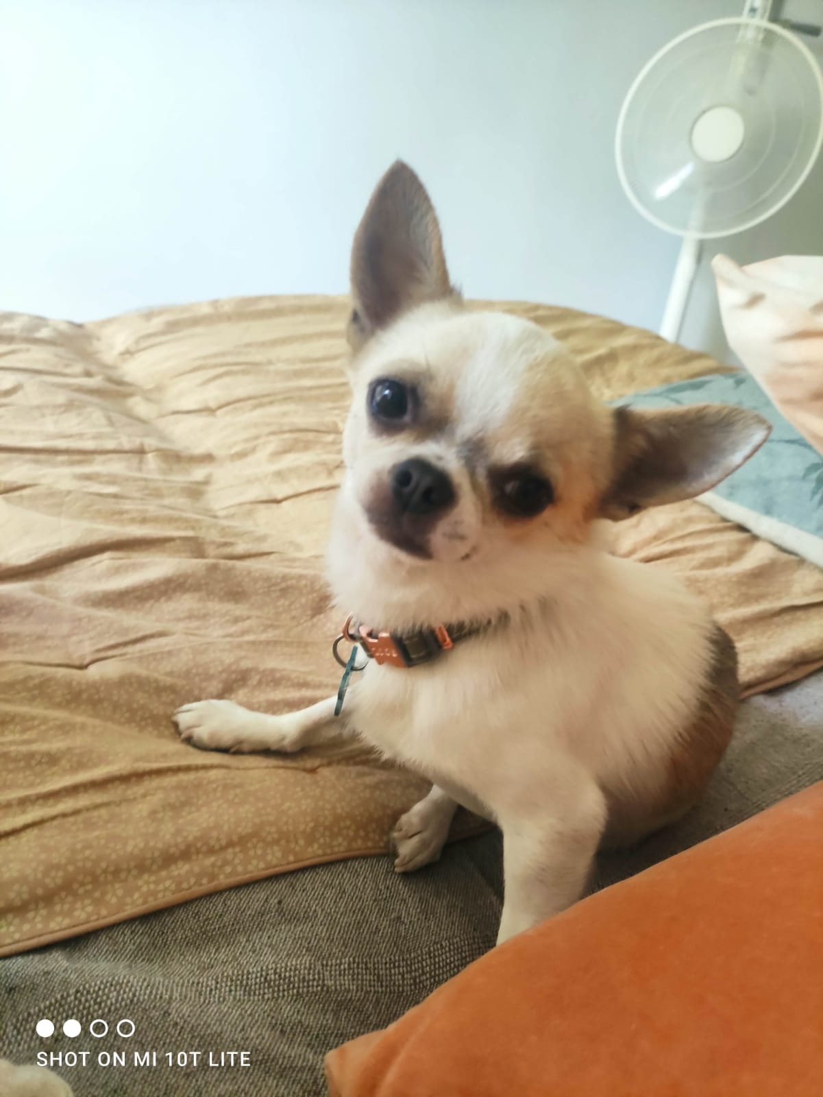LÉON est un chien de race Chihuahua, non lof, couleur banc et beige.