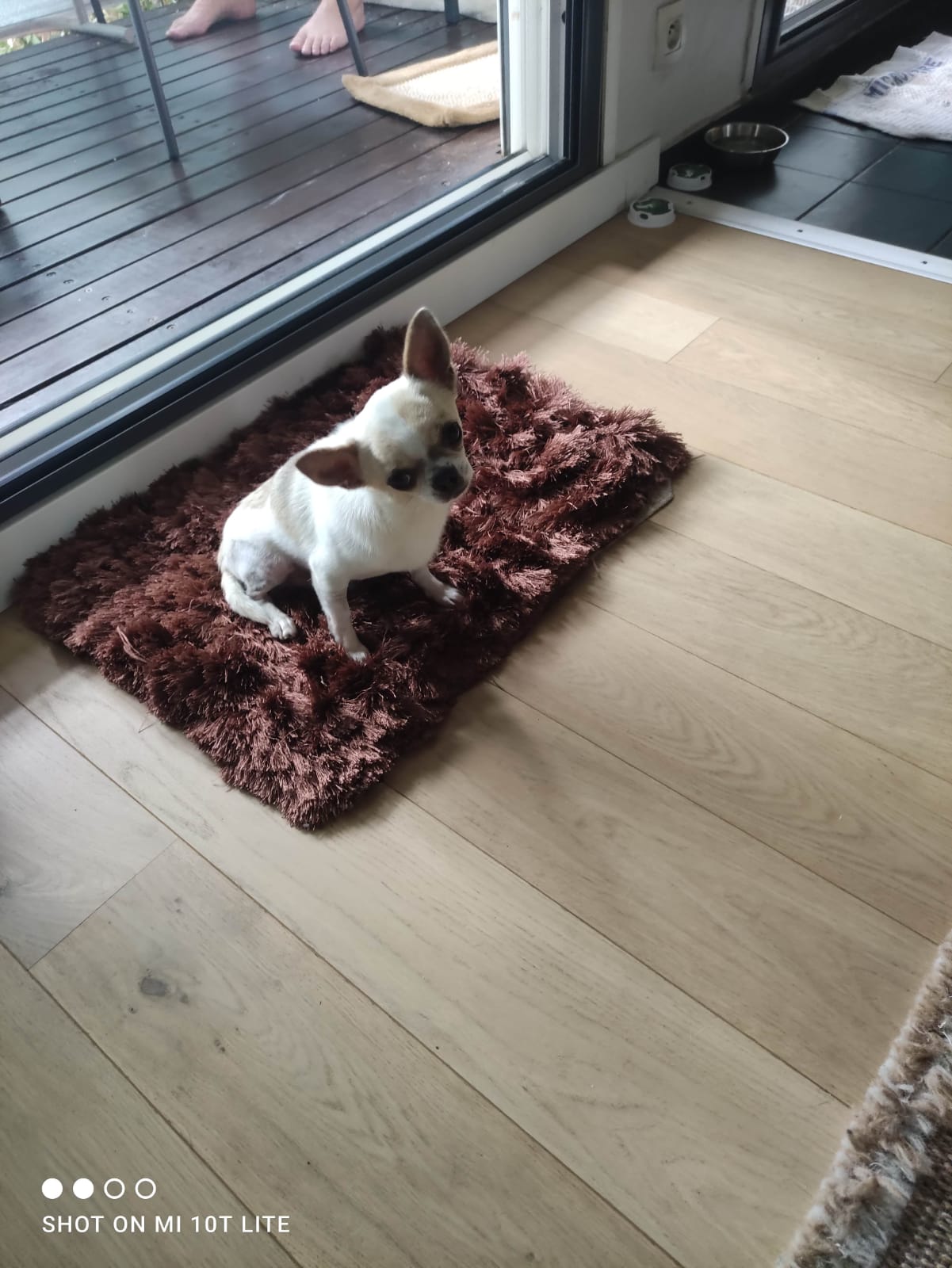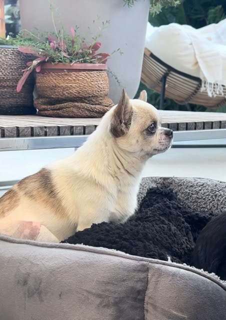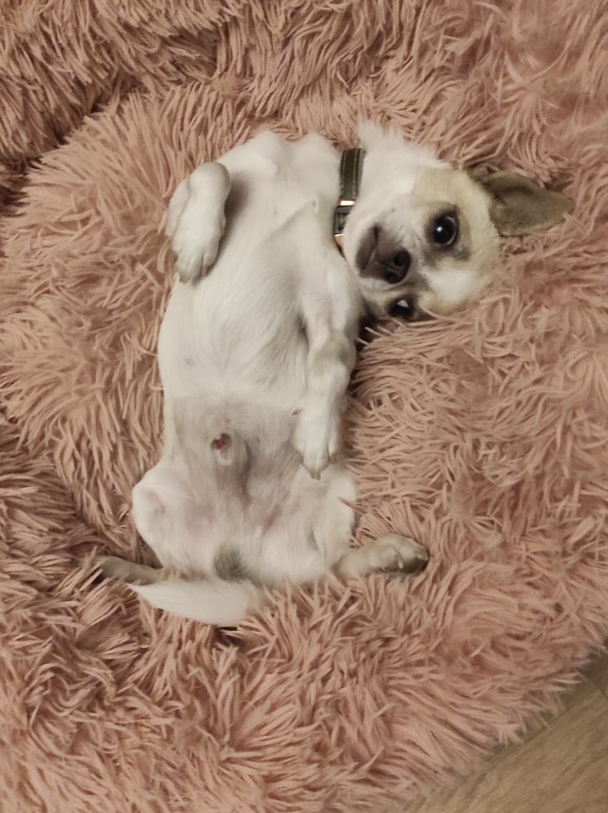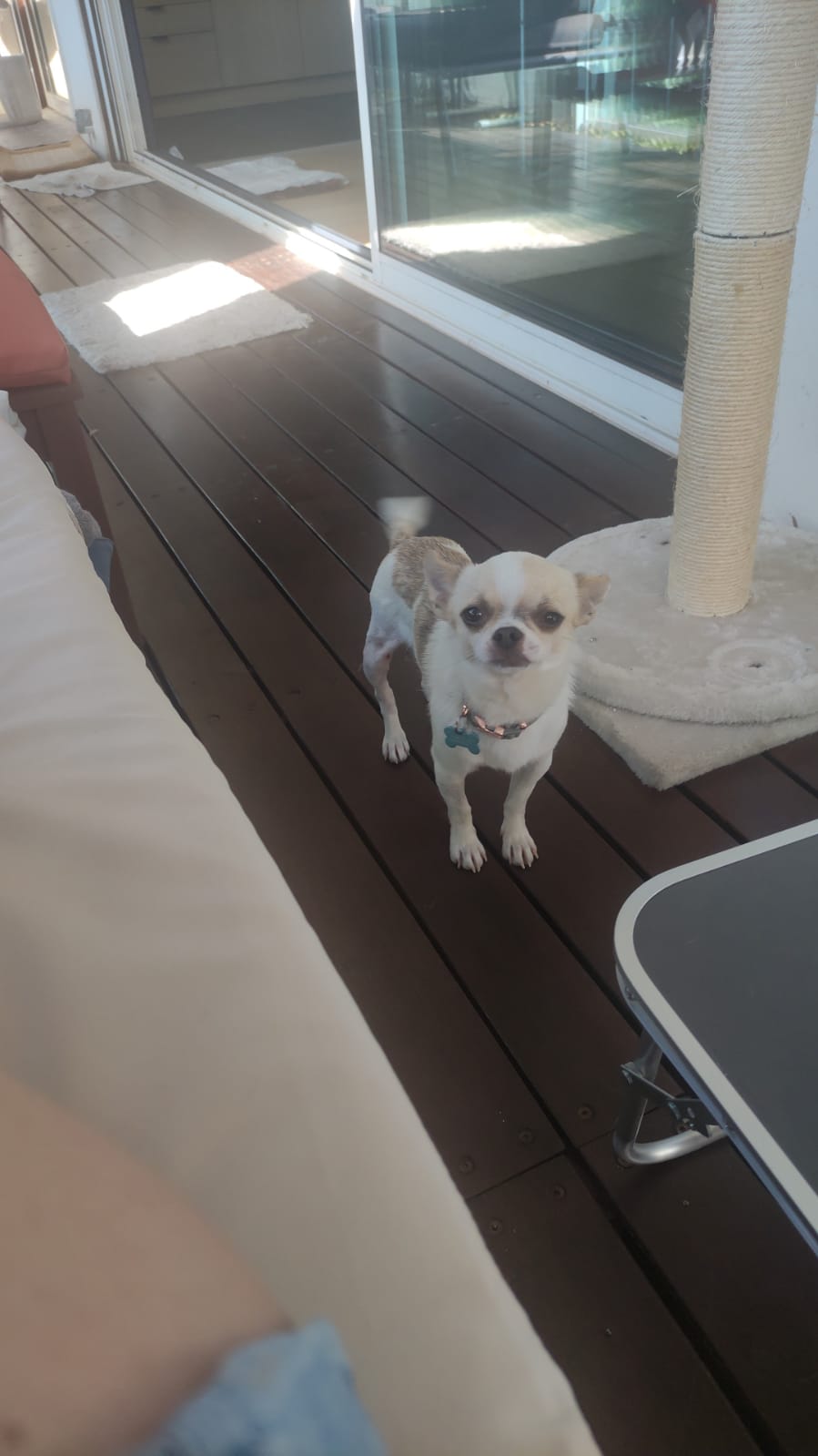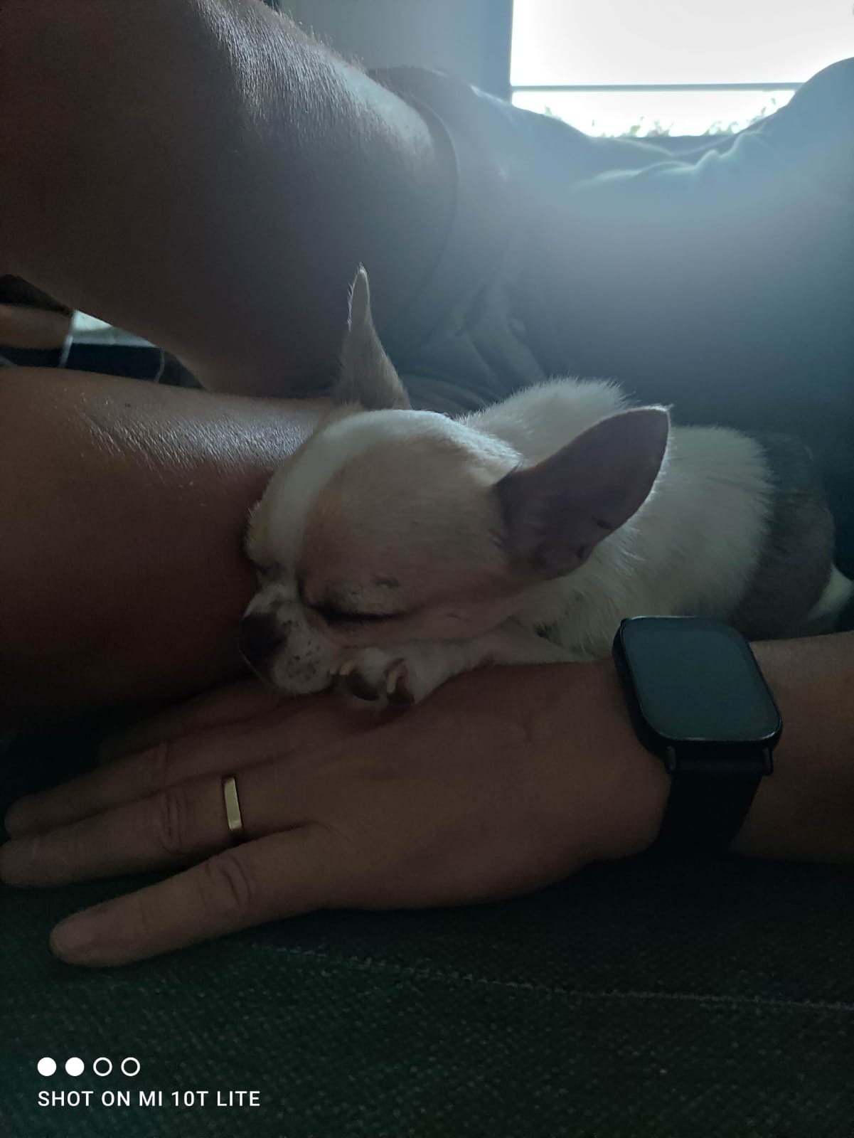 LÉON est un chien de race Chihuahua, non lof, couleur banc et beige.