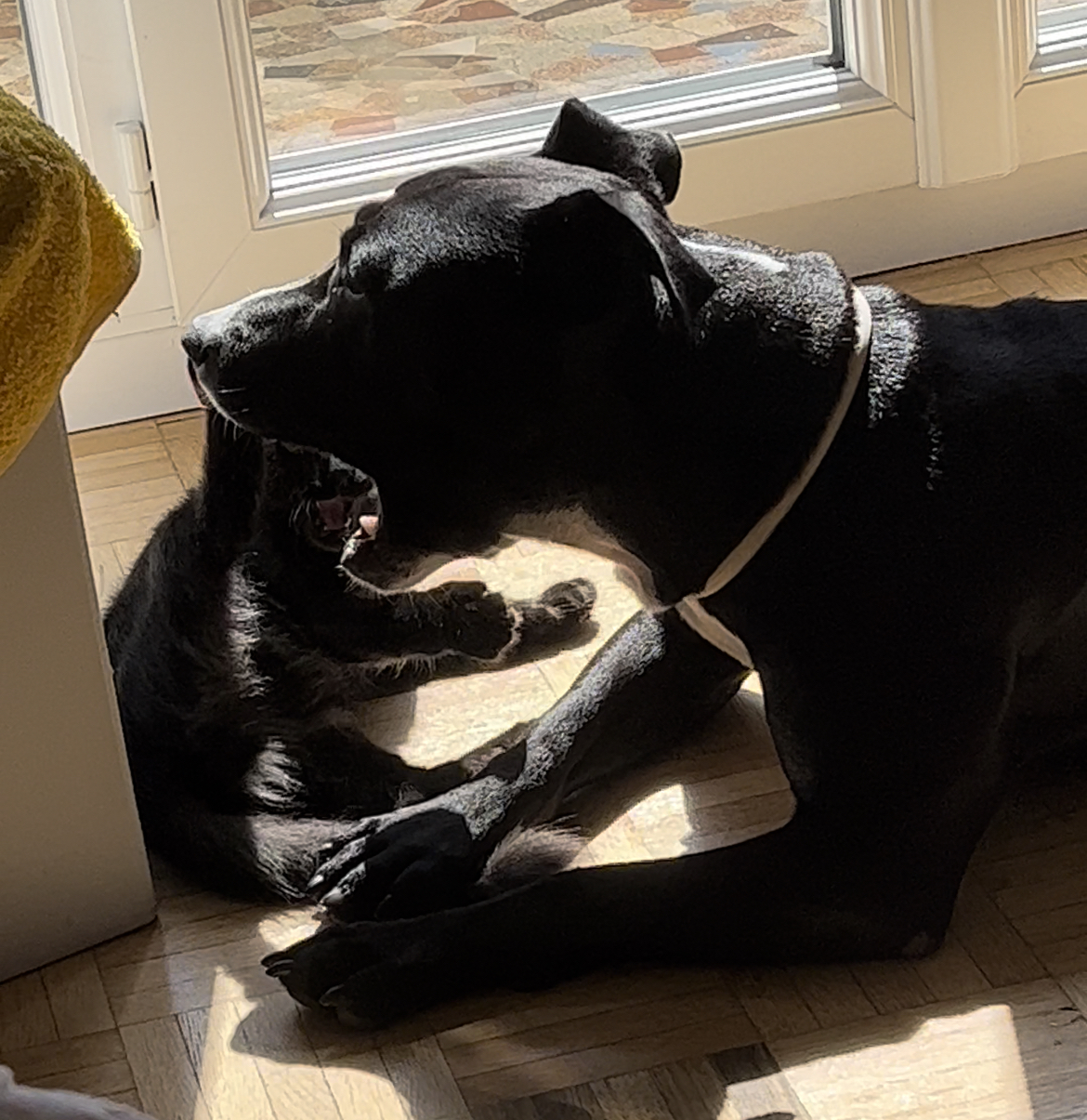 Nous ne connaissons pas trop ses ententes avec les congénères pour le moment car comme elle a ses chaleurs, nous faisons attention à ne pas trop provoquer de rencontres avec les autres chiens.