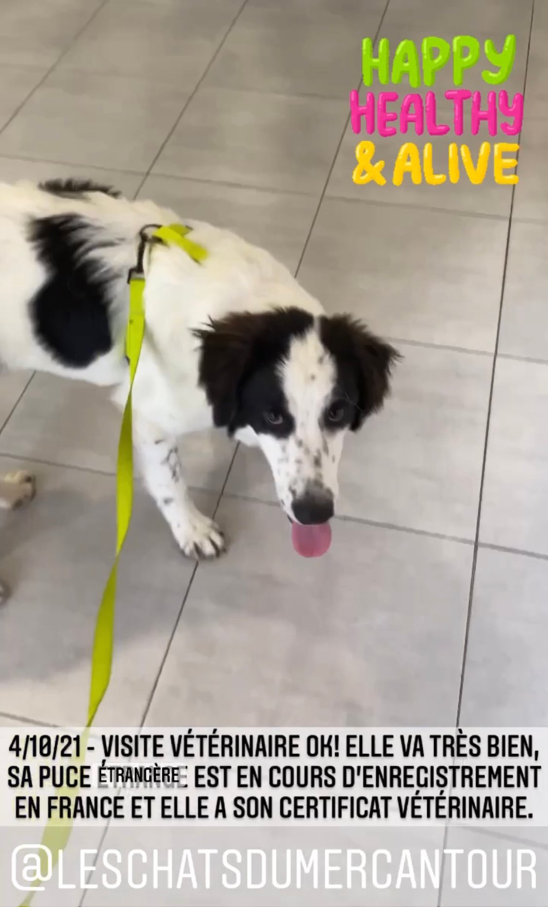 Identifiée, vaccinée (rage y compris) et stérilisée. Traitée pour parasites internes et externes. Testée négative à la leishmaniose et ehrlichiose. Elle est née le 1/2/21, et pèse 23kg à l’âge de 8 mois. Certificat de bonne santé à son adoption.