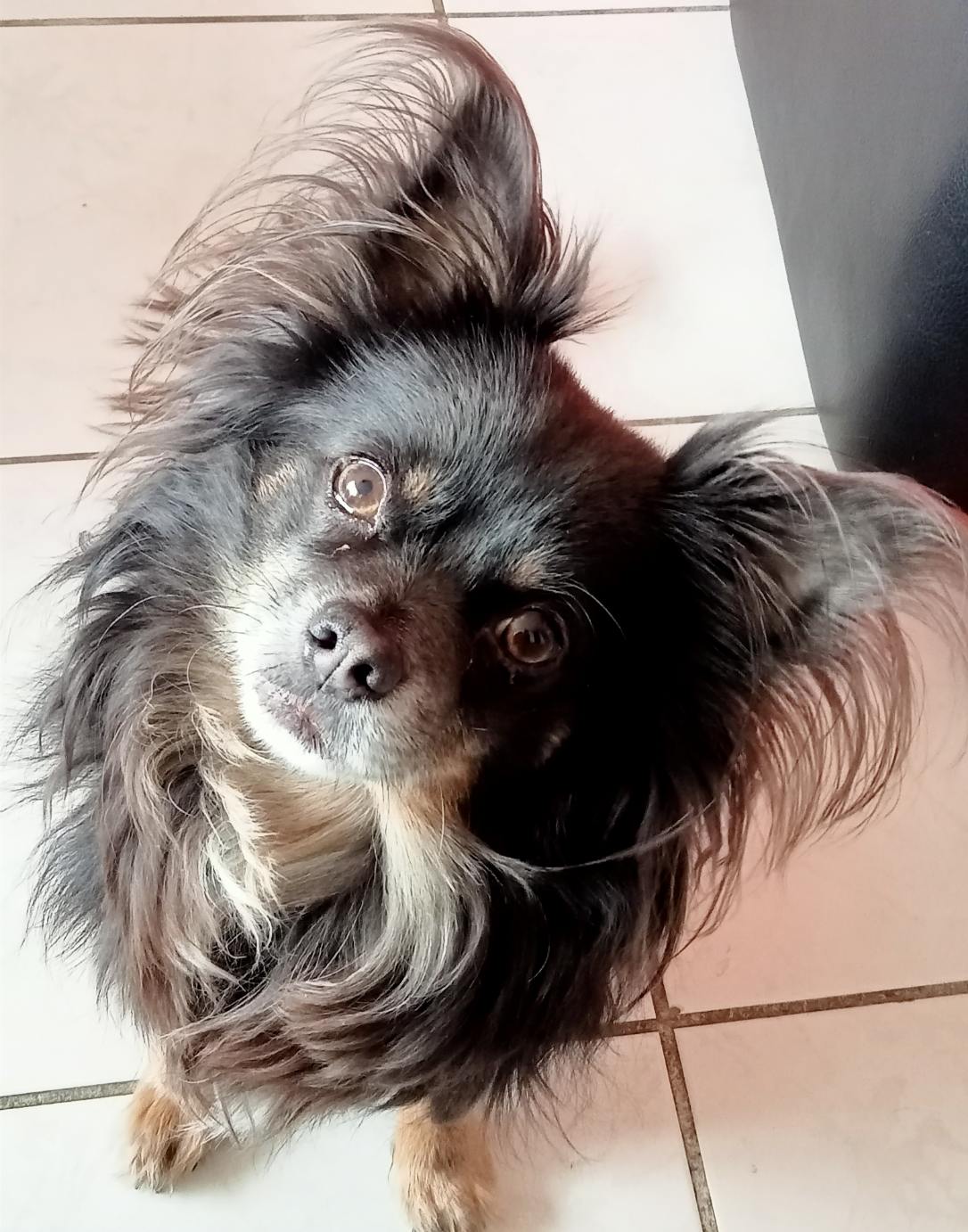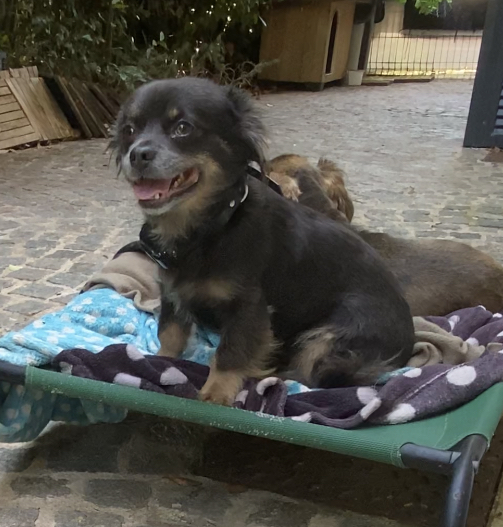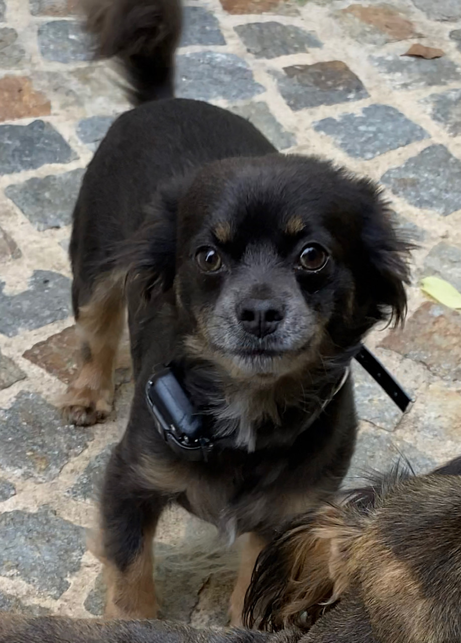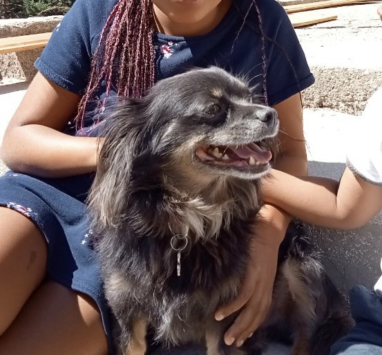Nelson est un chien de type Chihuahua à poil long, non lof, couleur bleu tricolore.