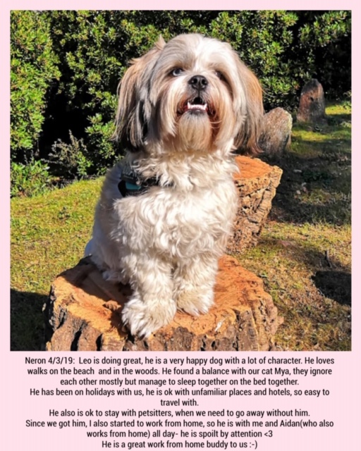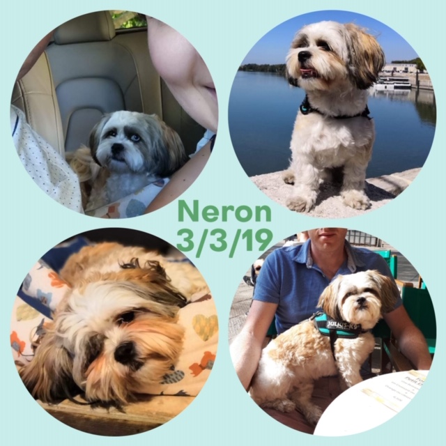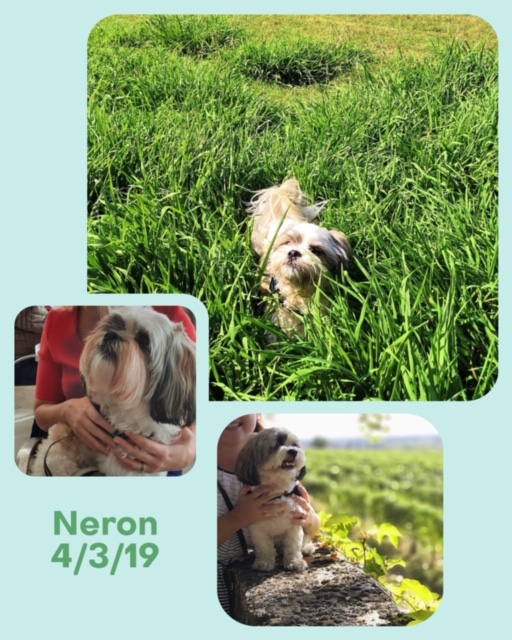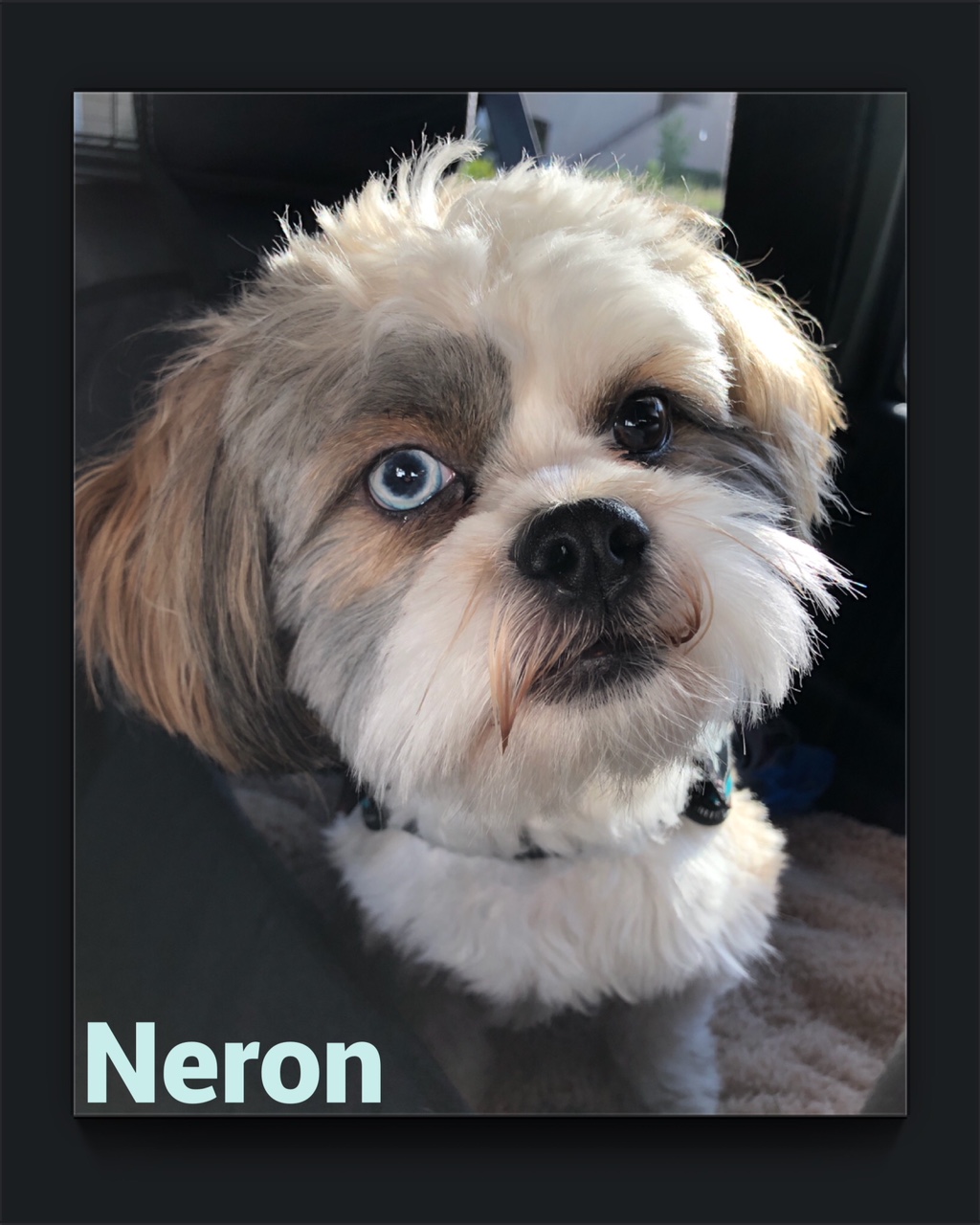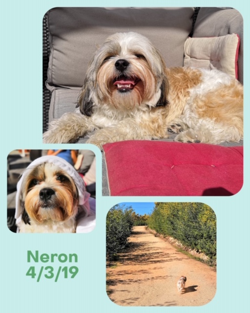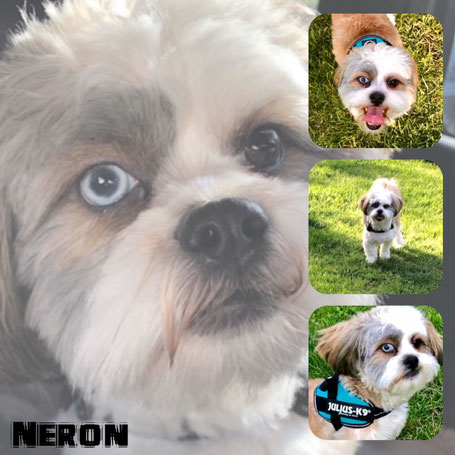 NERON est un chien de type Shih Tzu, non lof, couleur blanc et beige aux yeux vairons. Mâle castré, vacciné (rage y compris), pucé 250268731915373. Traité contre les parasites. Il pèse environ 8 kg.