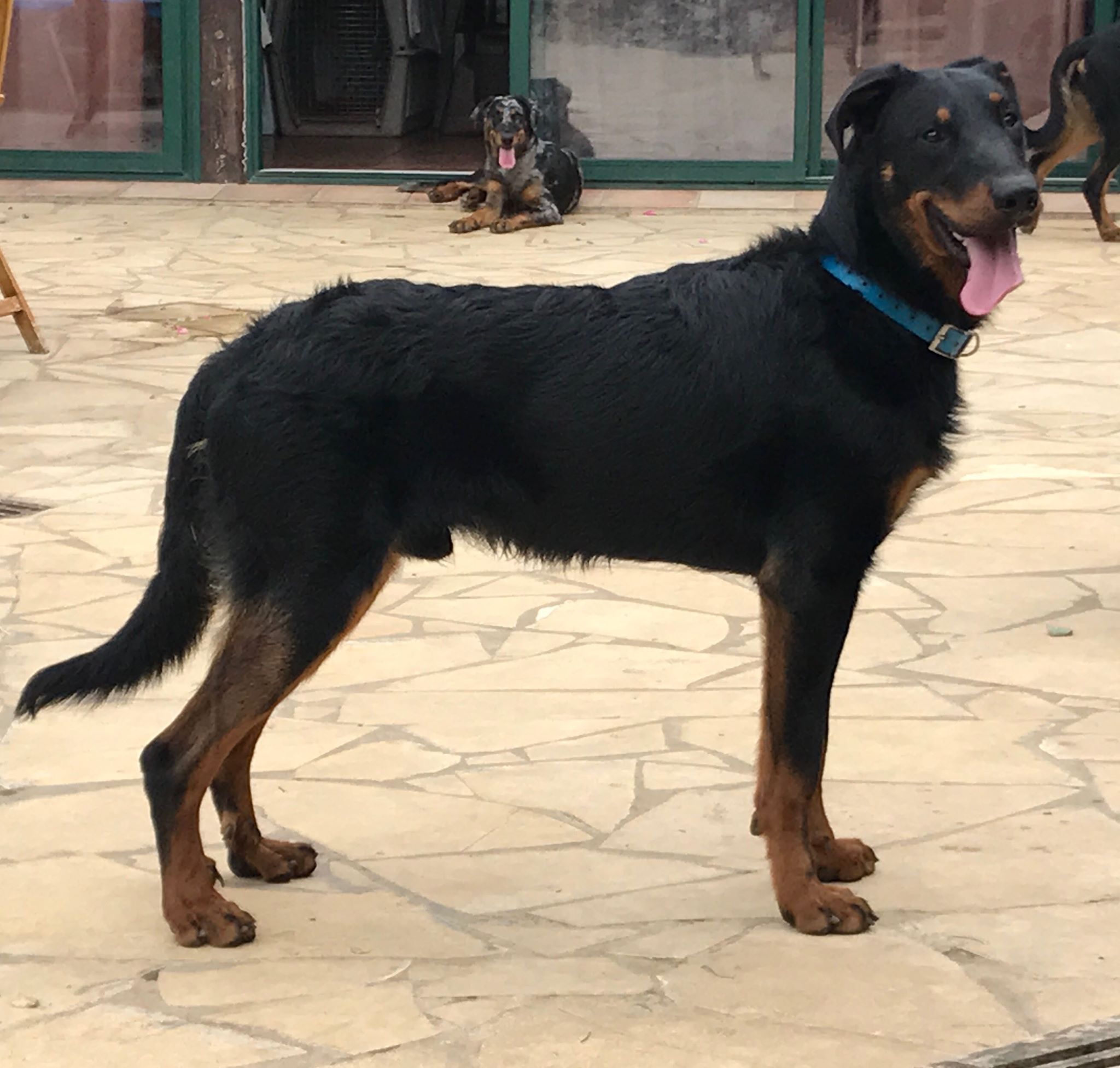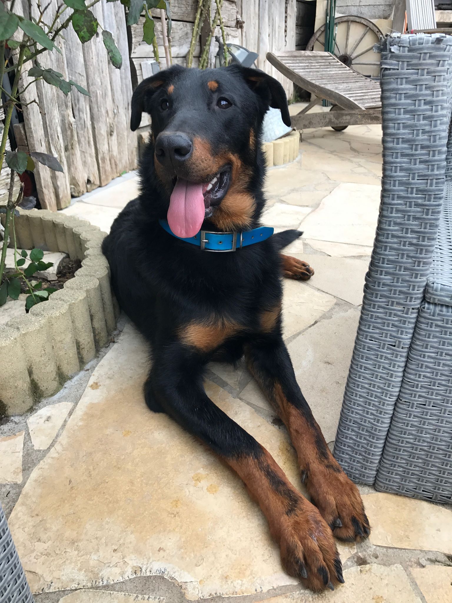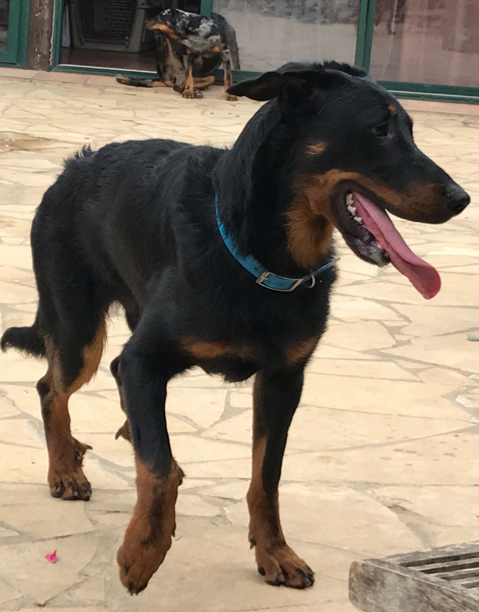 NEROS est un chien de type beauceron, non lof, noir et feu. Mâle castré né le 9/6/17, vacciné et pucé 250269606768932. Traité pour les puces, vermifuge.